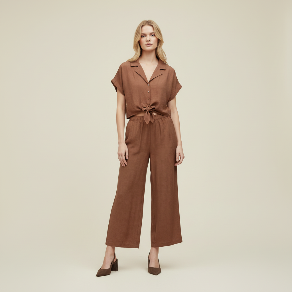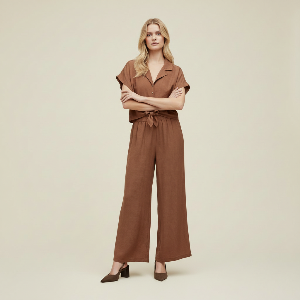 Blusa leggera a maniche corte realizzata in pregiato blend di viscosa e poliestere. Il tessuto morbido e traspirante garantisce massimo comfort anche nelle giornate più calde, perfetto per la stagione estiva. Abbinala al pantalone coordinato dello stesso materiale per creare un elegante effetto jumpsuit monocromatico. Una soluzione versatile e sofisticata per look casual e raffinati. Composizione: 80% viscosa, 20% poliestere