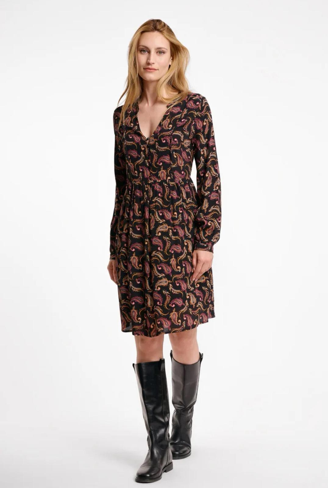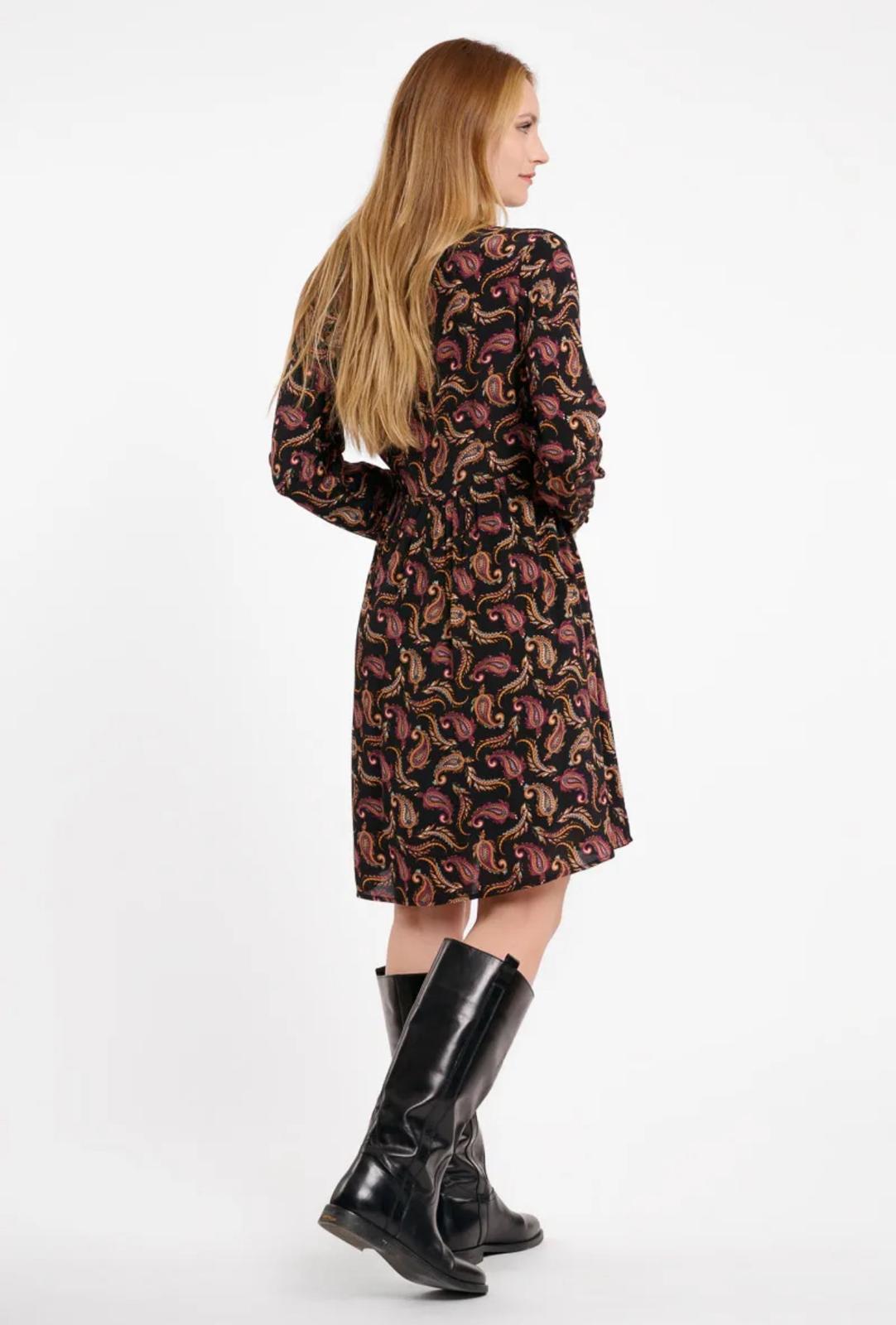 L'abito presenta una vivace fantasia paisley con tonalità calde e raffinate che si sposano perfettamente con lo sfondo nero. Il collo a V è regolabile con un'abbottonatura a lacci, che aggiunge un tocco di femminilità. Il punto vita elasticizzato crea una silhouette definita e lusinghiera, mentre le maniche lunghe a palloncino e i polsini elasticizzati donano un tocco di eleganza e movimento.