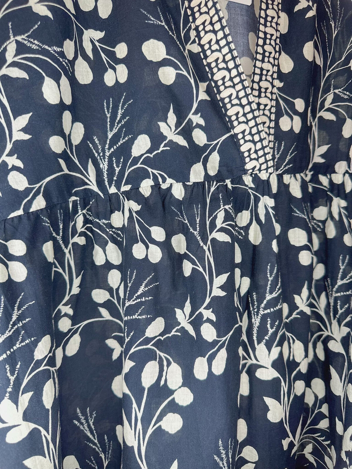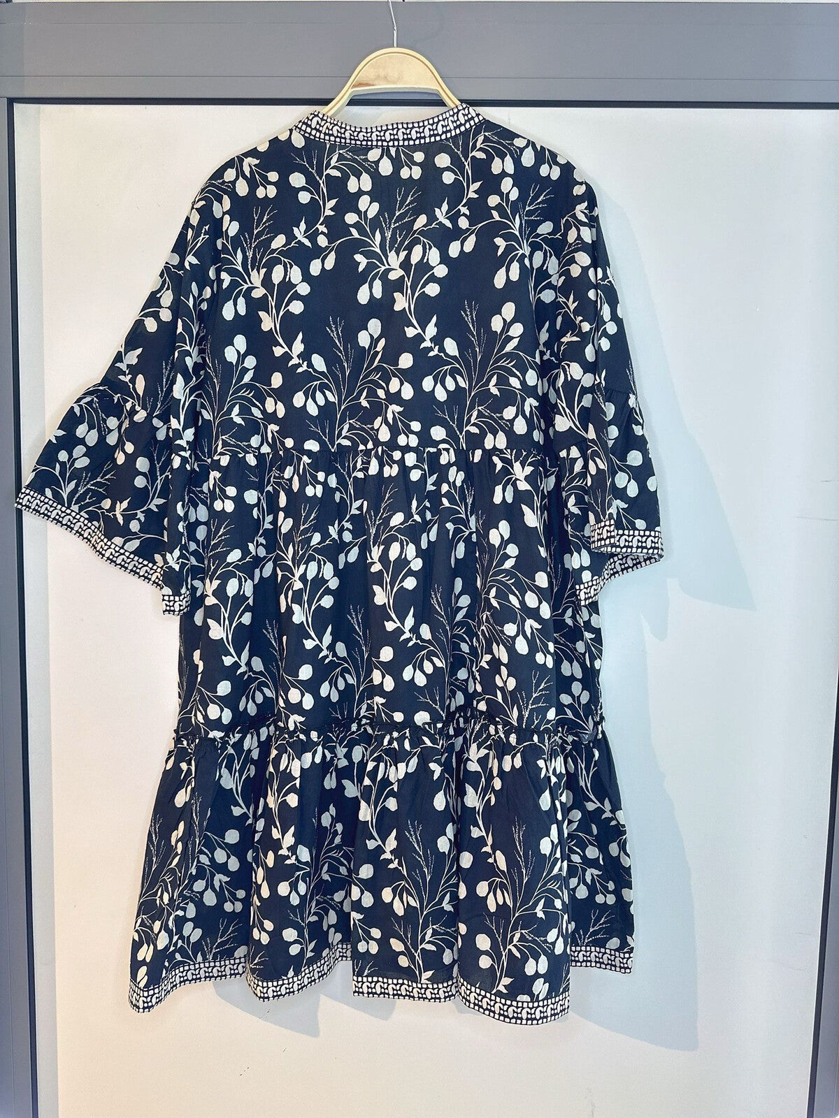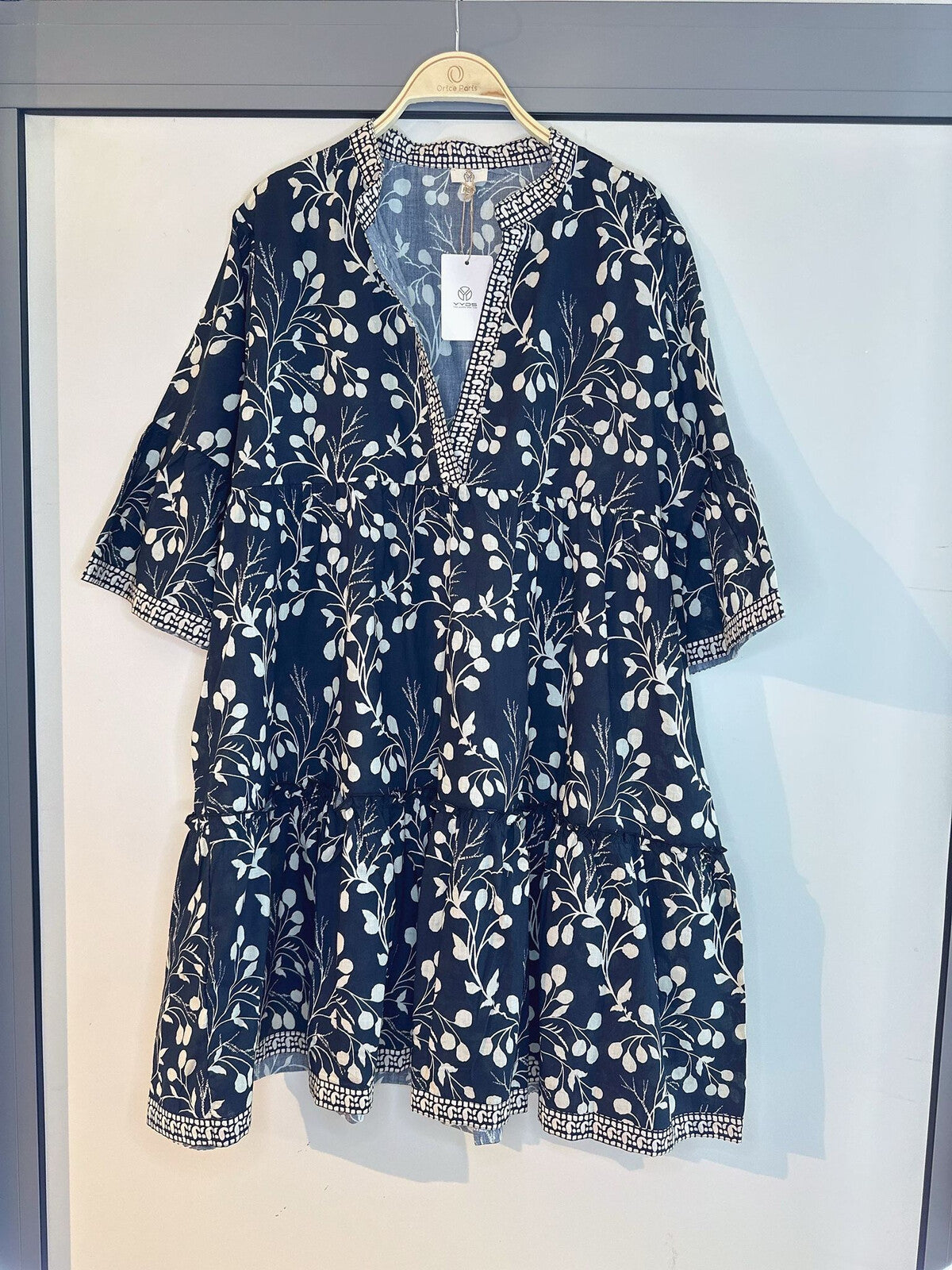 Questo abito corto in cotone 100% unisce eleganza e stile bohémien con maniche a 3/4 arricciate e scollo a V impreziosito da una striscia tessile a contrasto. Il motivo stampato su sfondo nero dona un tocco raffinato, mentre la vestibilità taglia unica (38-46) assicura comfort e adattabilità alle forme europee standard. Perfetto per chi cerca un capo distintivo e versatile, capace di valorizzare ogni occasione con sobrietà e charme.