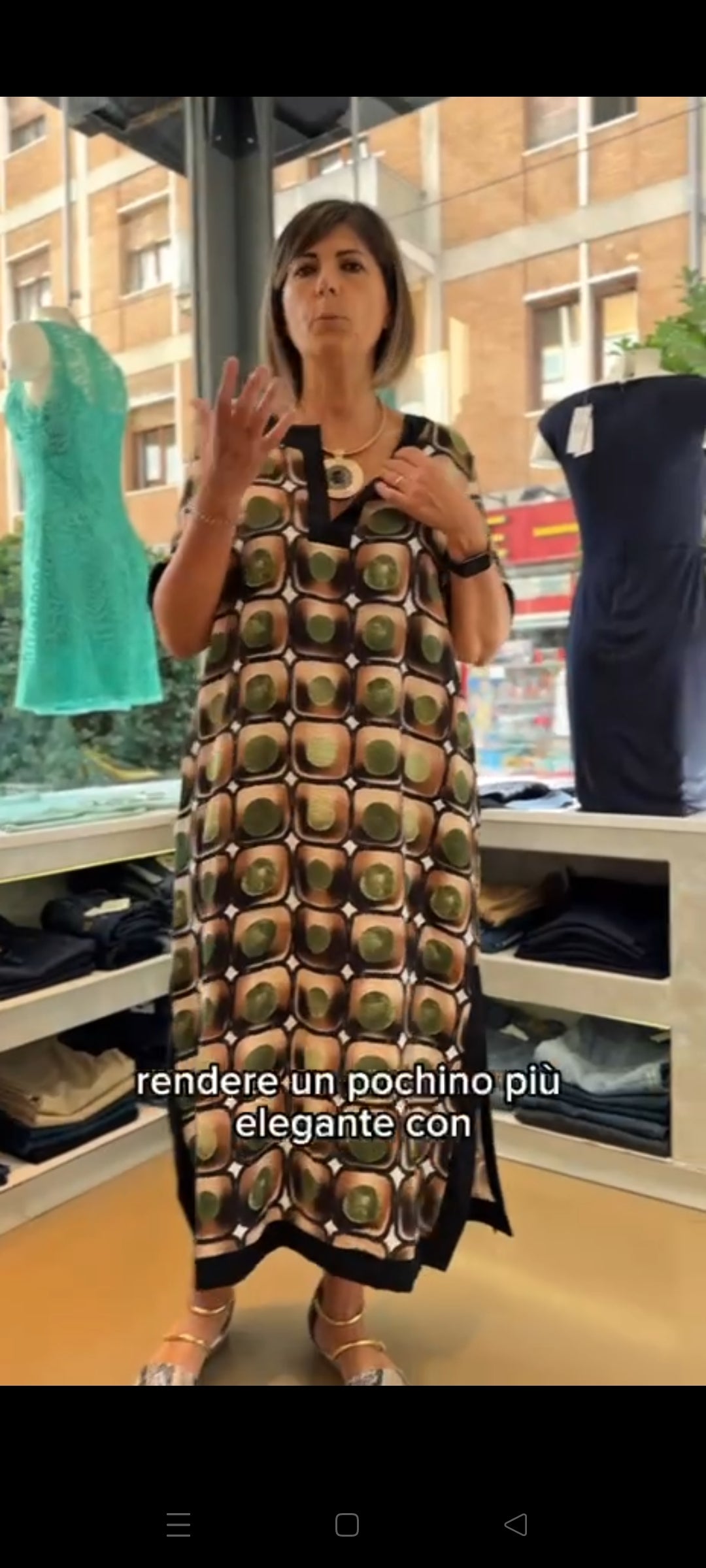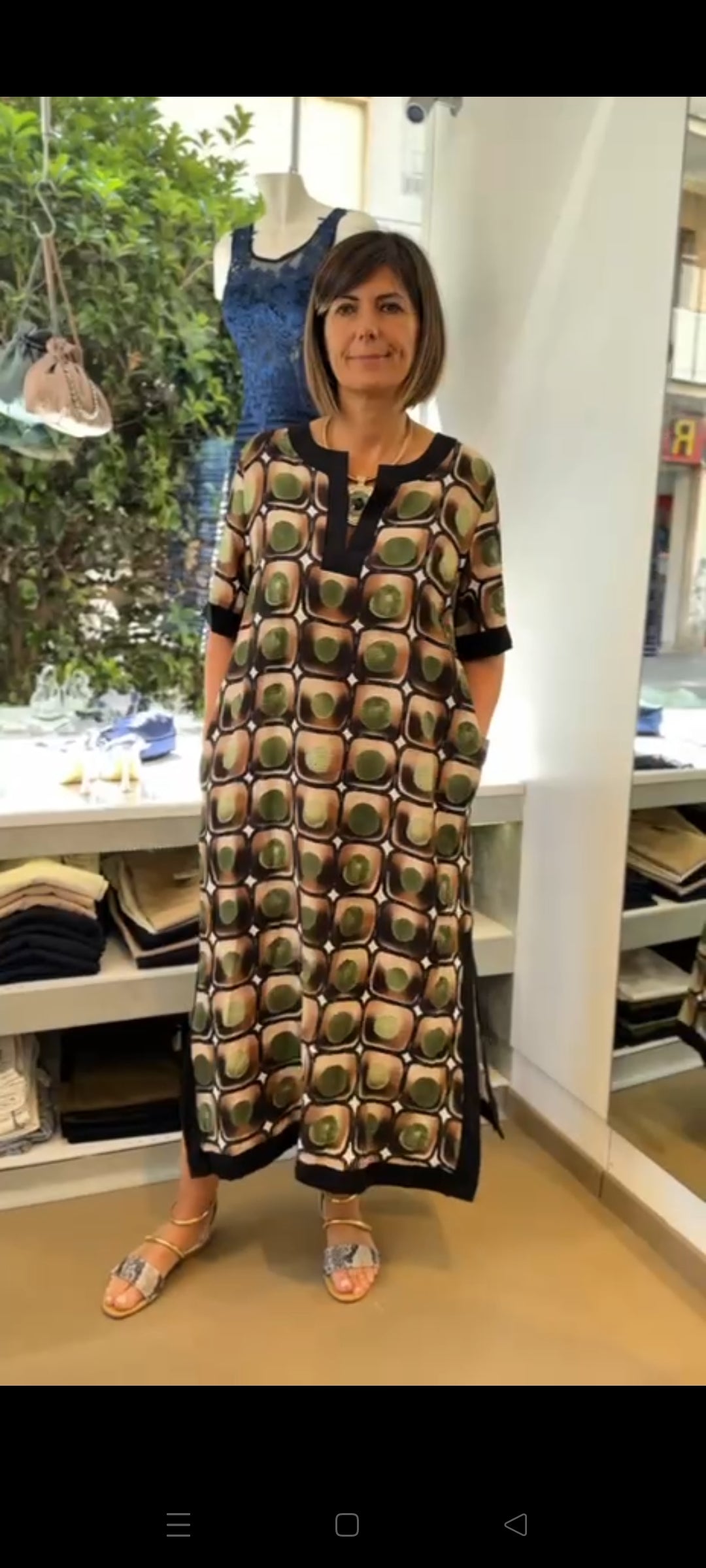 Caratterizzato da una vibrante stampa geometrica con motivi a blocchi in tonalità di verde oliva, marrone, beige e nero, questo abito si distingue per il suo look moderno e originale. Lo scollo a V con profilo nero aggiunge un tocco di raffinatezza, mentre le maniche ampie e la vestibilità morbida offrono massima libertà di movimento.