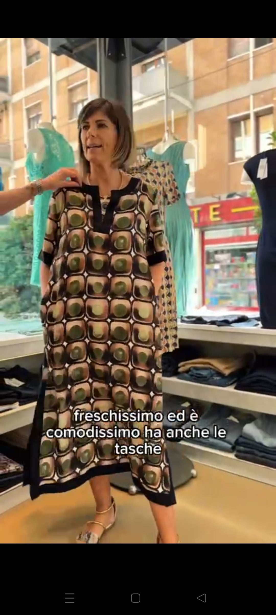 Le comode tasche laterali, discretamente integrate nel design, sono perfette per tenere a portata di mano piccoli oggetti essenziali. Lo spacco laterale alla base dell'abito non solo conferisce un tocco di eleganza, ma facilita anche il movimento, rendendolo ideale per ogni tipo di attività, dalla passeggiata in città a un aperitivo con gli amici.