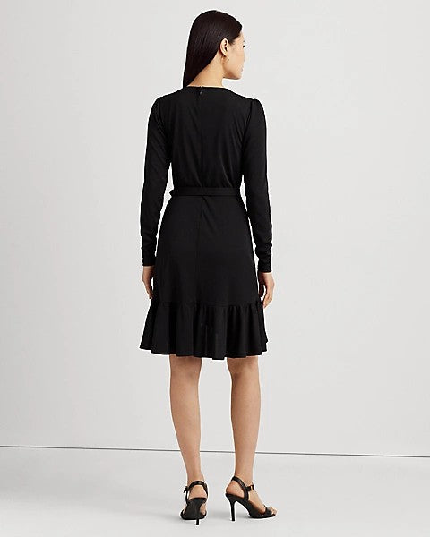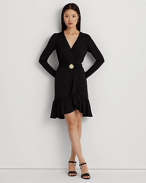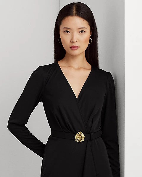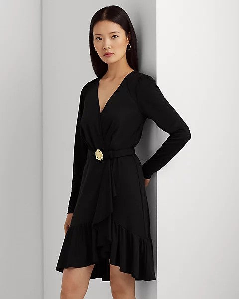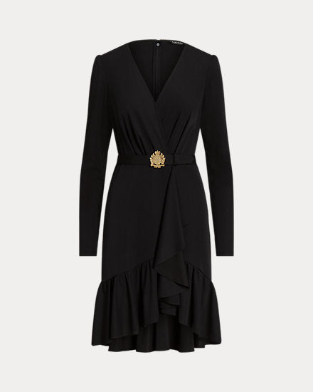 Questo elegante abito è realizzato in morbido jersey elasticizzato per avvolgere il tuo corpo con comfort e stile. La cintura con fibbia a stemma sottolinea la tua vita, mentre lo scollo a V con incrocio aggiunge un tocco chic. Completo di delicate volant e balza sul fondo, è il capo perfetto per un look sofisticato. Disponibile in nero e composto al 94% di poliestere e 6% di elastan, è lavabile sia a mano che a secco.