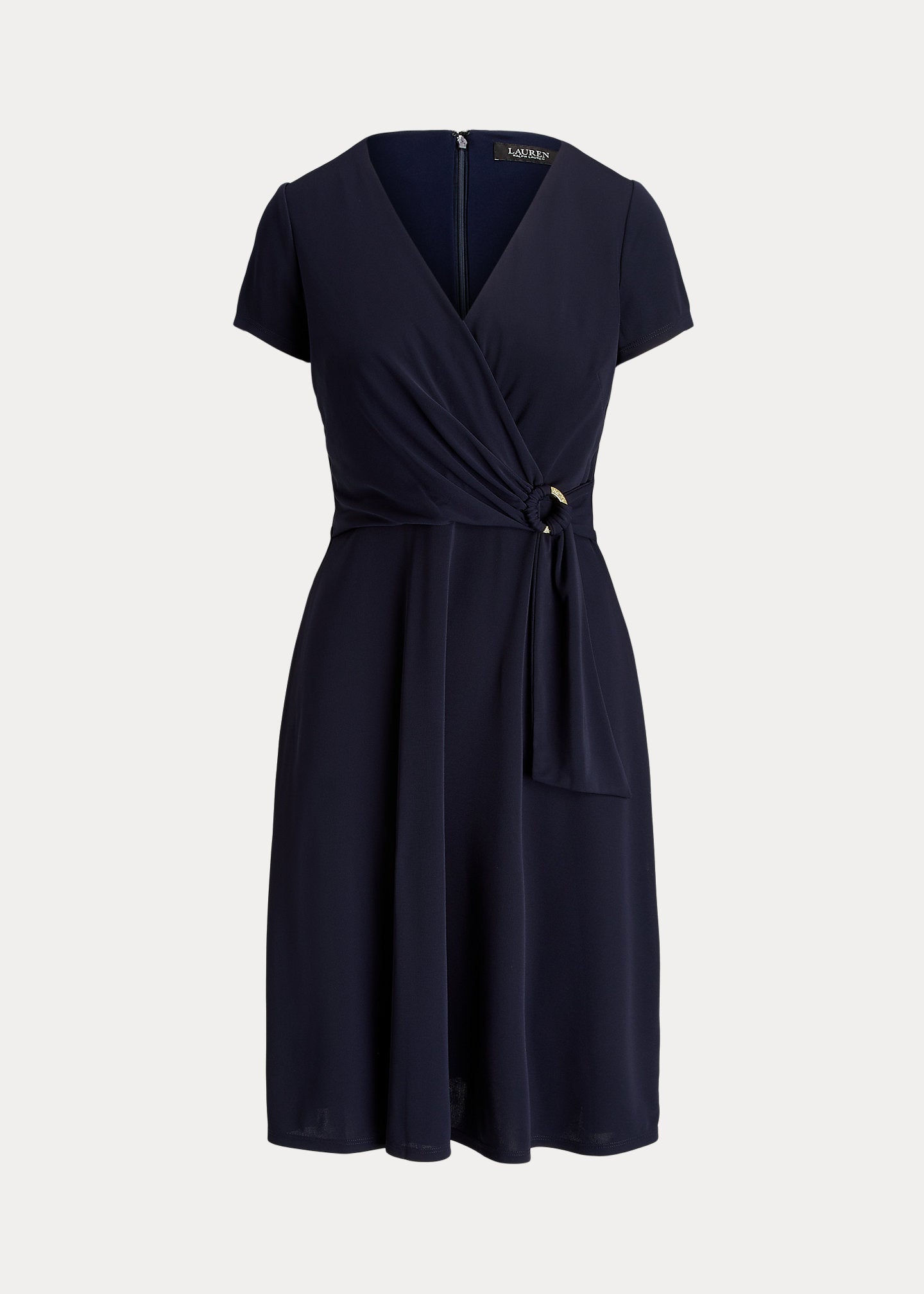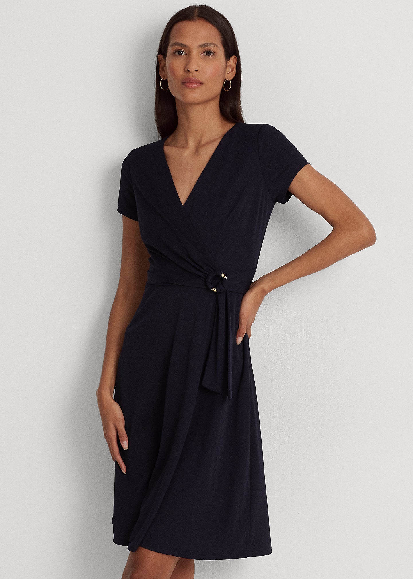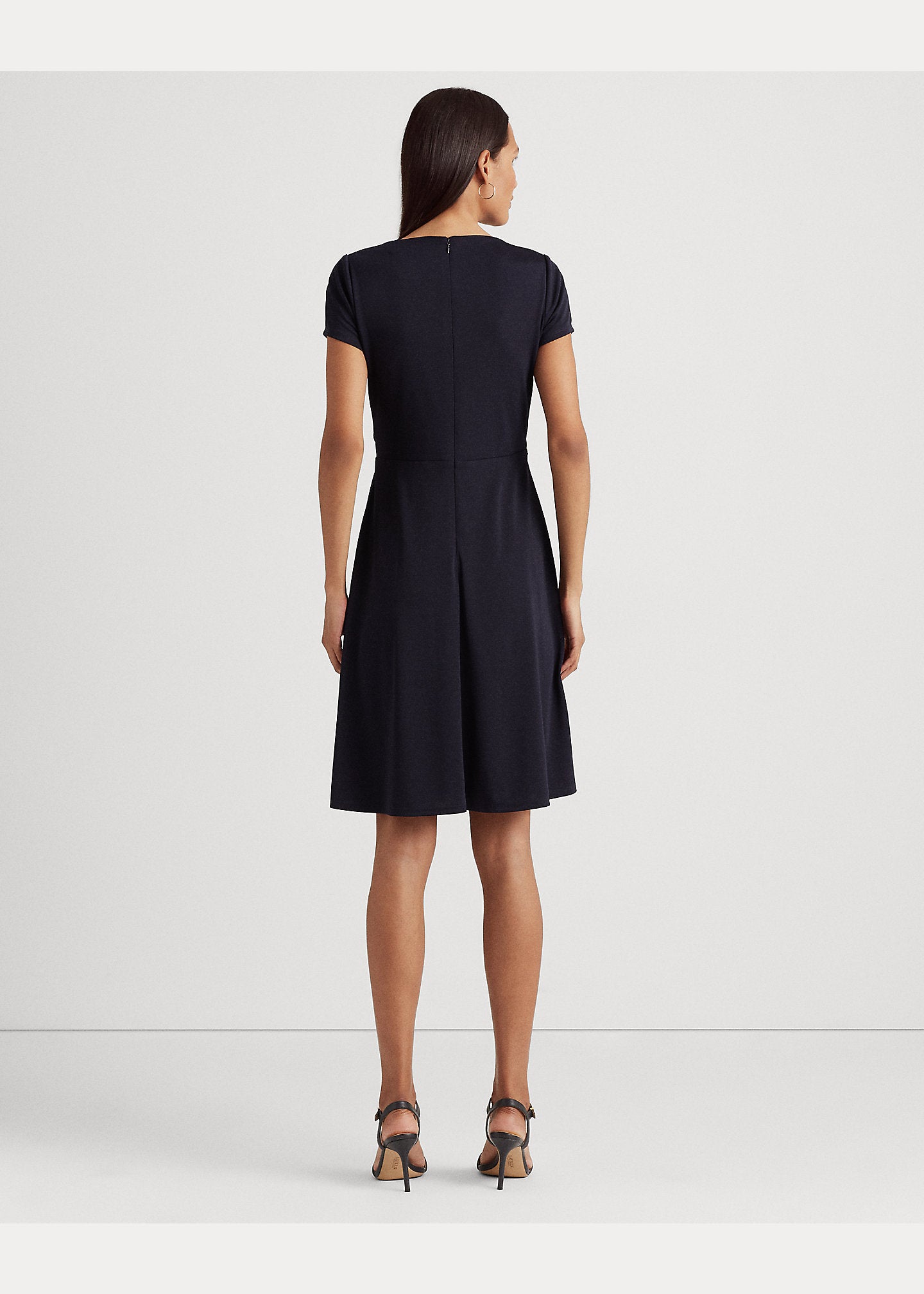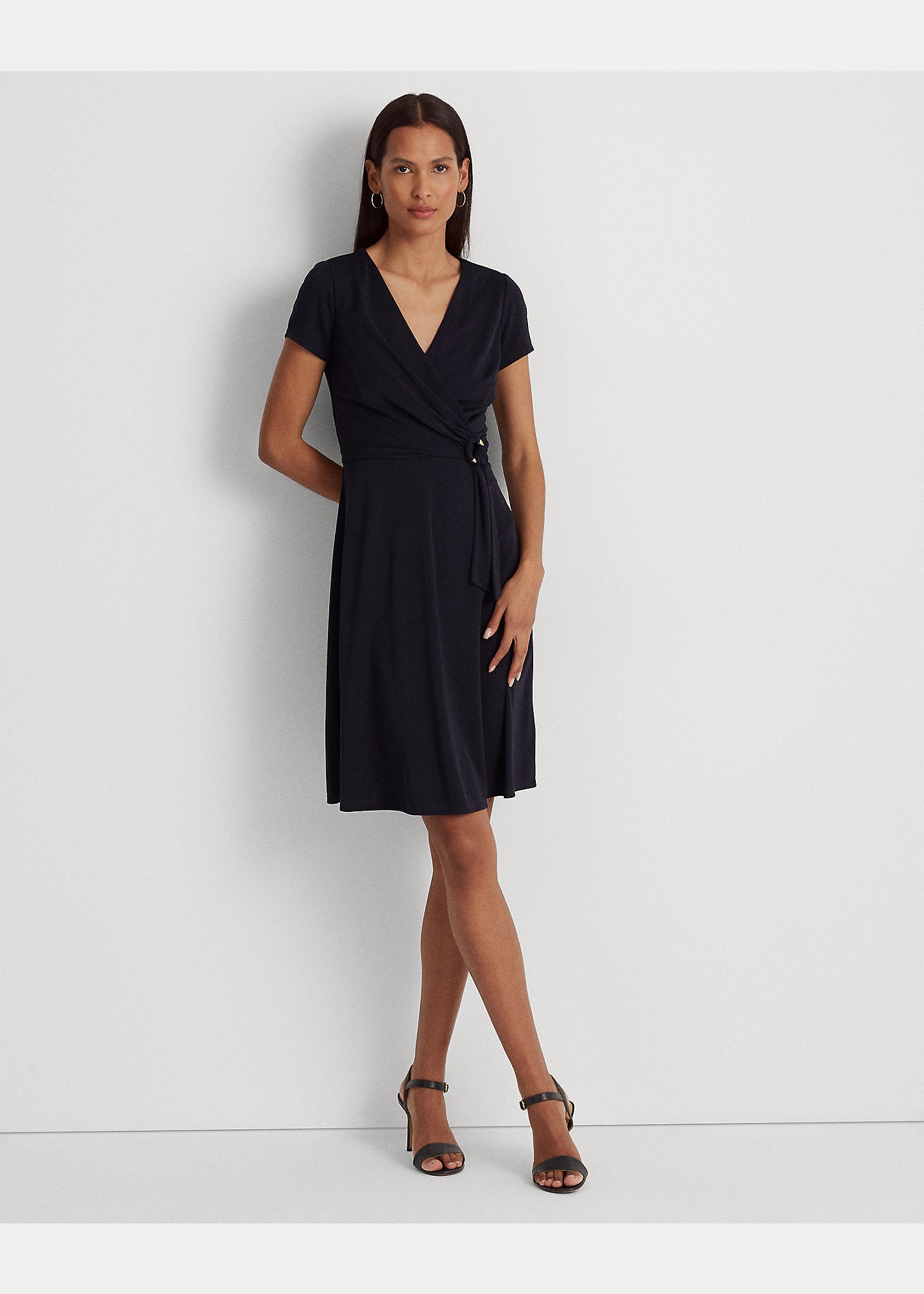 Questo abito in jersey con gonna ampia offre un mix perfetto di comodità e stile. Coniuga un tessuto morbido e una silhouette al ginocchio, arricchita da uno scollo a v incrociato e una cintura con fibbia ad anello. Il colore blu e la composizione al 94% in poliestere rendono questo abito lavabile in acqua una scelta pratica e chic.
