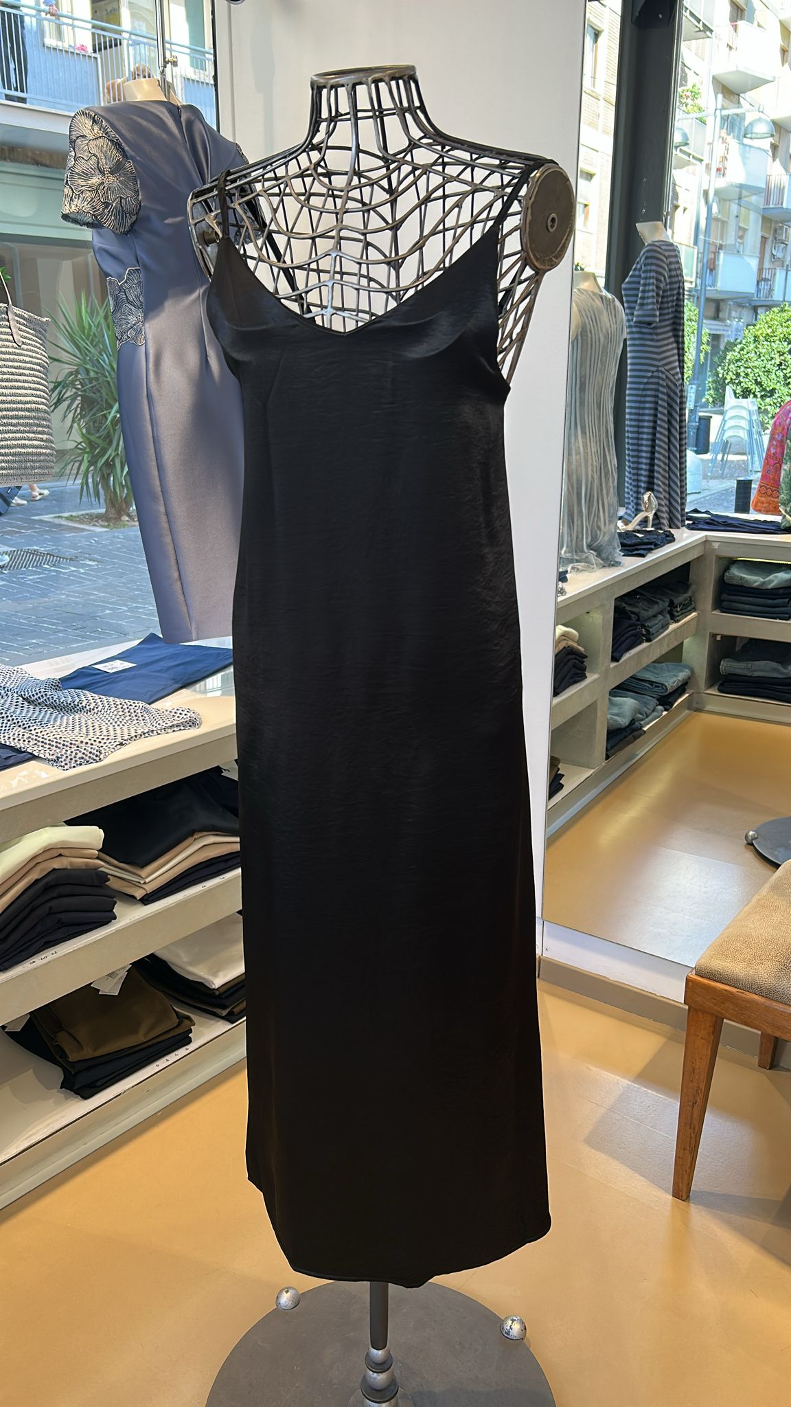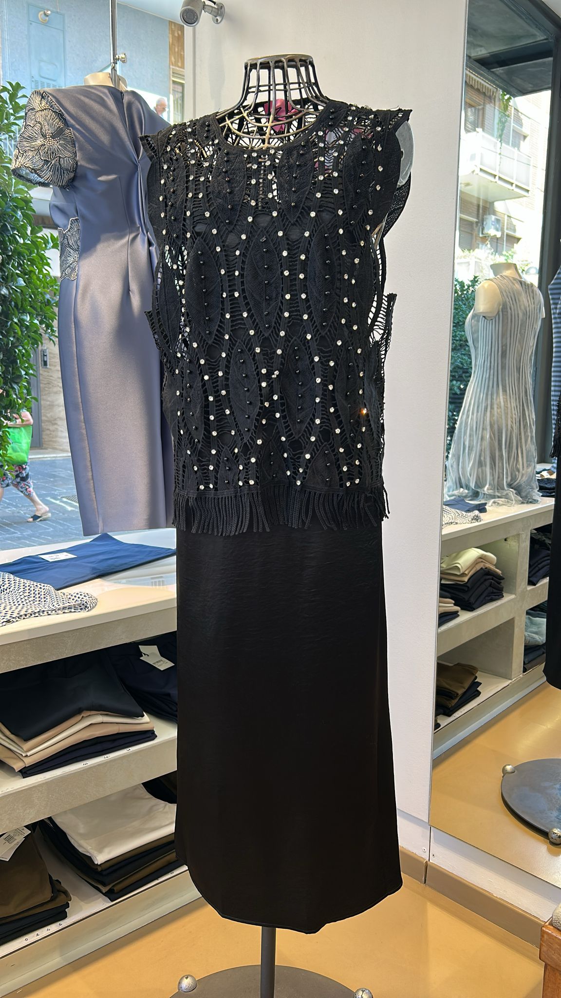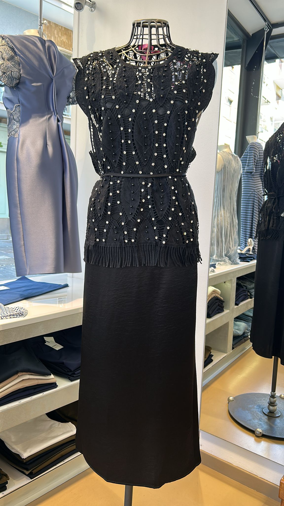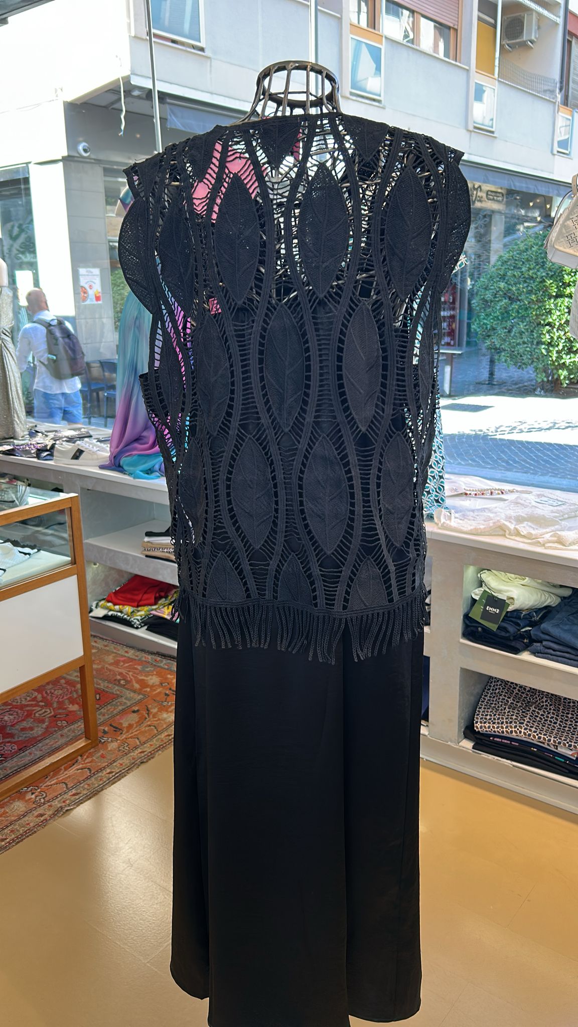 Composizione: Abito in raso nero, gilet in pizzo macramè.