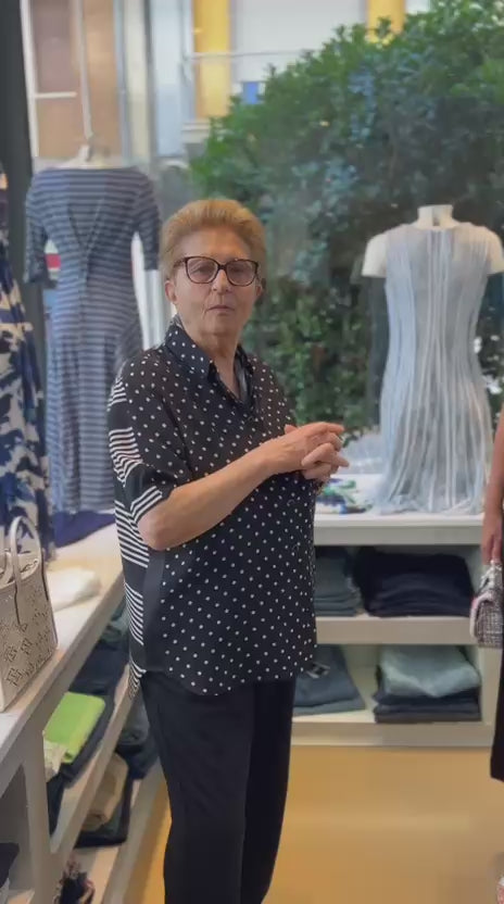 Il pezzo forte è il gilet in pizzo macramè nero, un vero gioiello di artigianato che aggiunge un tocco di classe e originalità. I motivi a goccia e i dettagli con frange creano un gioco di trasparenze e texture che cattura lo sguardo. Veste fino ad una taglia 44/46