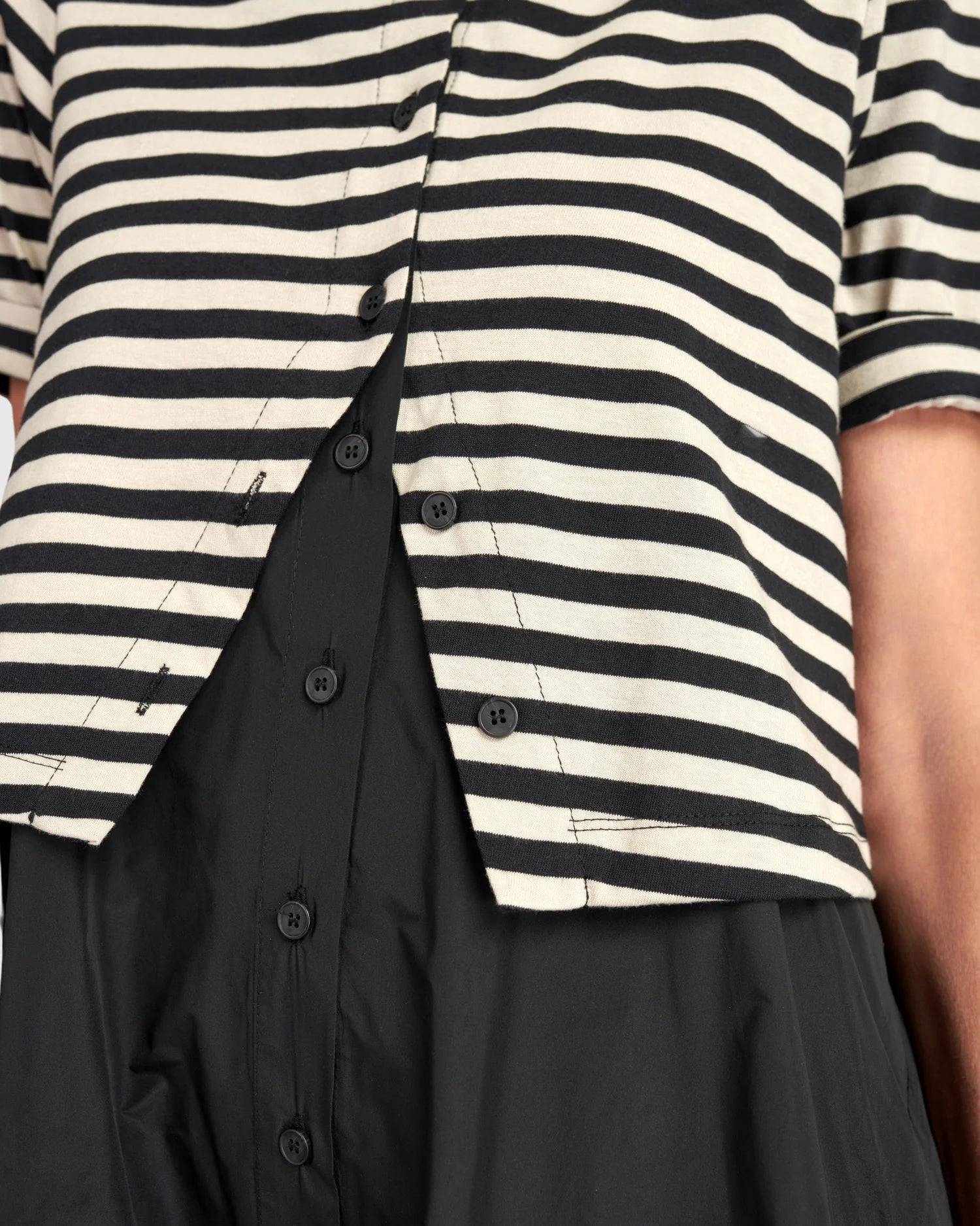 Abito midi elegante che combina un top in morbida maglia jersey con una gonna in taffetà leggero. La silhouette a trapezio esagerata cade generosamente fino a metà polpaccio, creando movimento fluido e volume arioso. Maniche lunghe fino al gomito e abbottonatura completa sul davanti per un effetto stratificato sofisticato. Tasche laterali funzionali completano il design. Realizzato in 65% poliestere e 35% cotone, è versatile e confortevole per l'uso quotidiano. Lavare in lavatrice a freddo e asciugare all'aria. AMPIA VESTIBILITA'