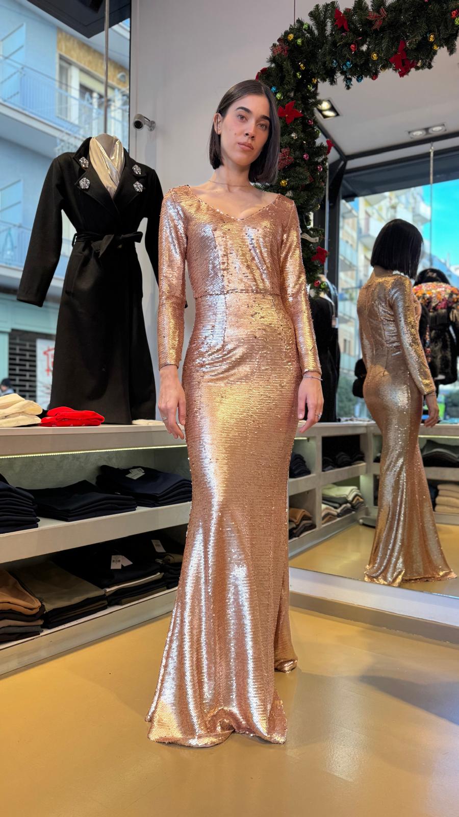 Abito lungo con paillettes dorate