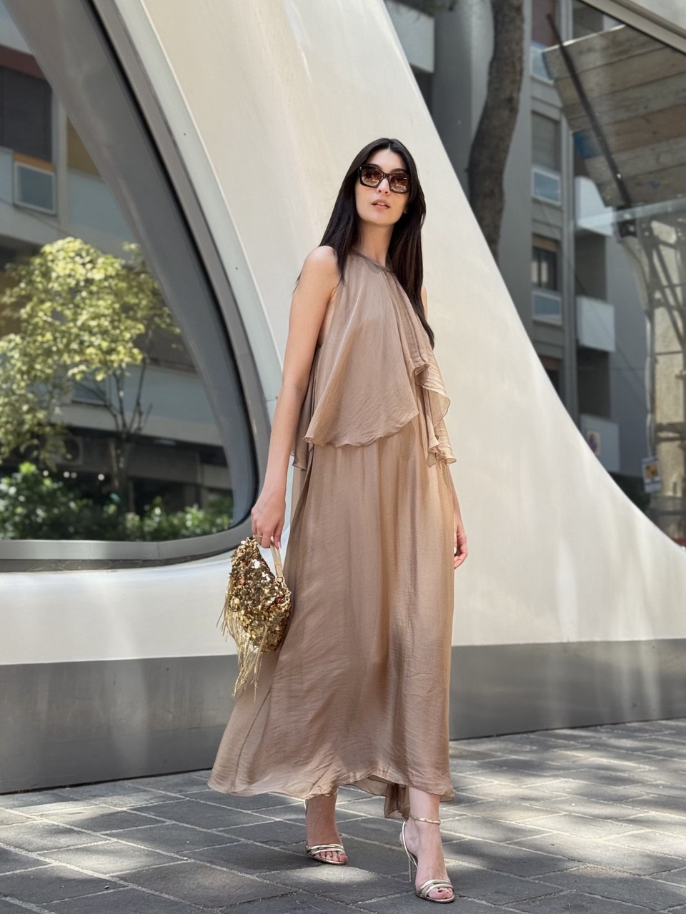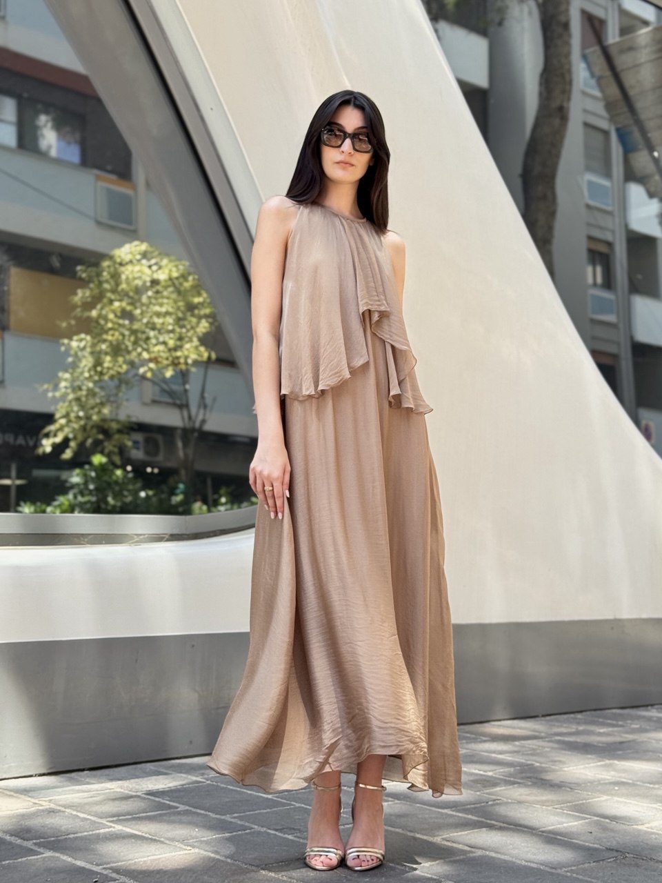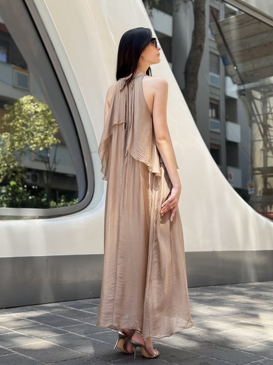 Questo abito lungo in misto seta combina eleganza e leggerezza grazie al 30% seta e 70% viscosa. Il collo rotondo con chiusura a fiocco sul retro aggiunge un dettaglio raffinato, mentre la mancanza di maniche assicura comfort e freschezza. Foderato interamente in viscosa, valorizza la silhouette con un effetto arioso e volant delicati. La taglia unica veste comodamente dalla 36 alla 46, ideale per cerimonie, serate o vacanze, offrendo uno stile sofisticato e senza tempo.