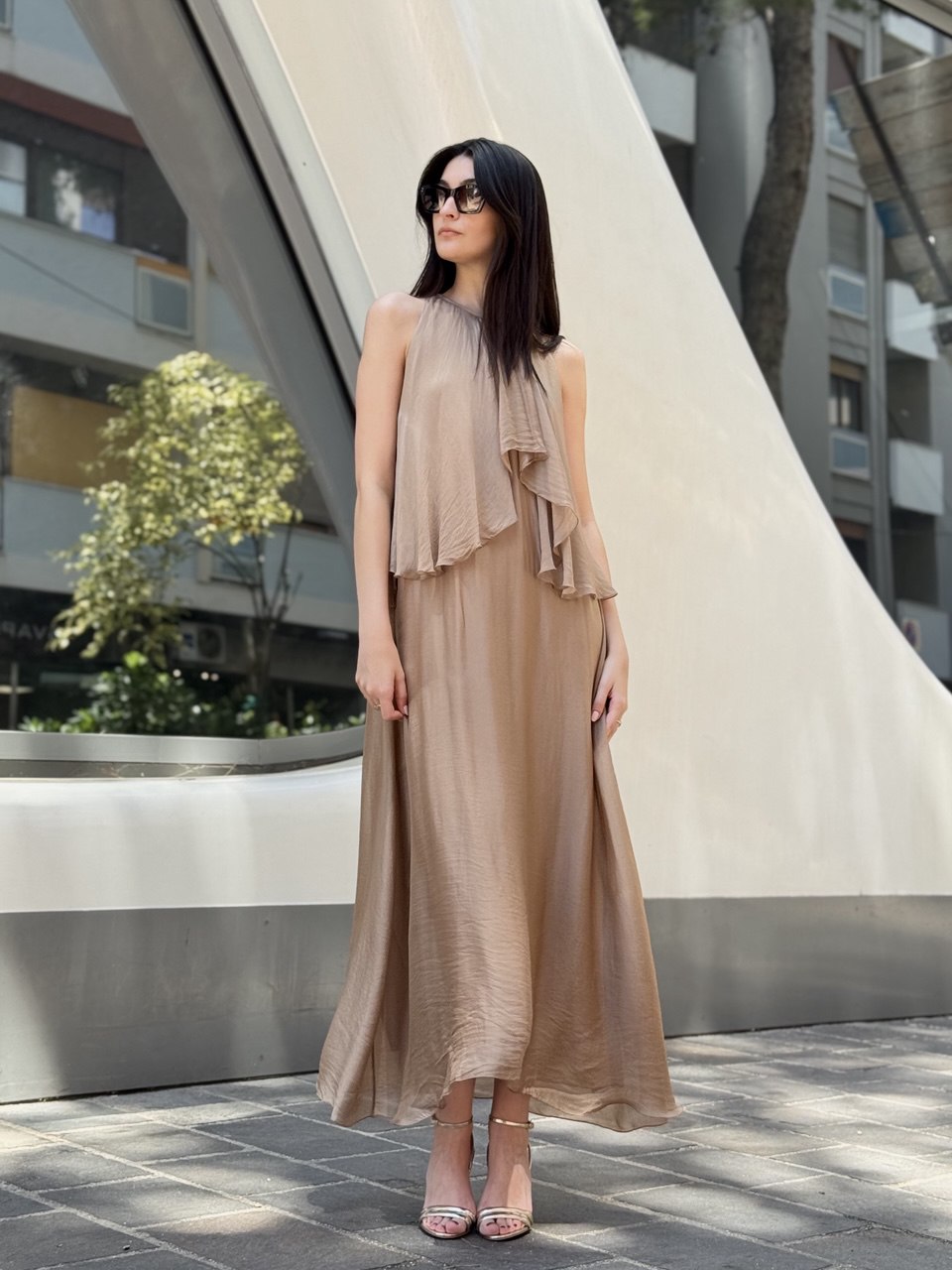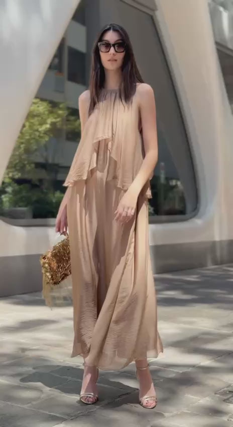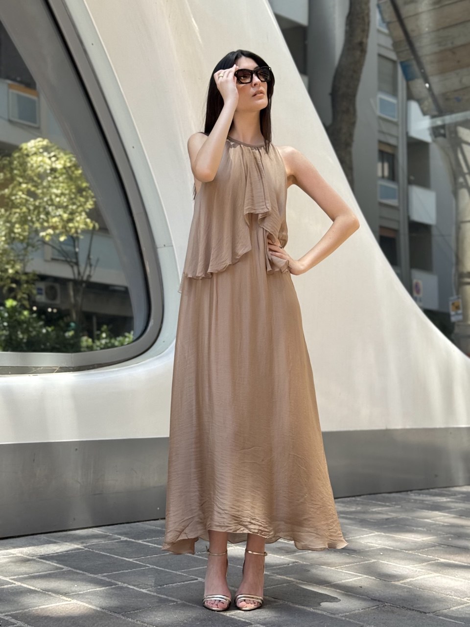 Questo abito lungo in misto seta combina eleganza e leggerezza grazie al 30% seta e 70% viscosa. Il collo rotondo con chiusura a fiocco sul retro aggiunge un dettaglio raffinato, mentre la mancanza di maniche assicura comfort e freschezza. Foderato interamente in viscosa, valorizza la silhouette con un effetto arioso e volant delicati. La taglia unica veste comodamente dalla 36 alla 46, ideale per cerimonie, serate o vacanze, offrendo uno stile sofisticato e senza tempo.