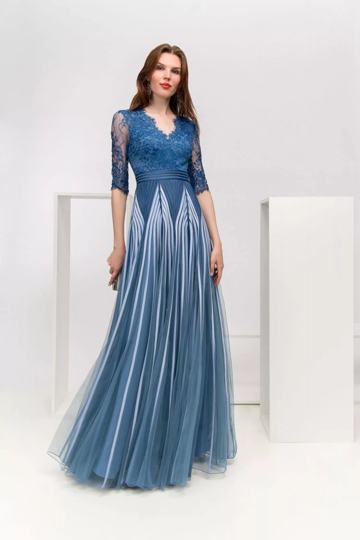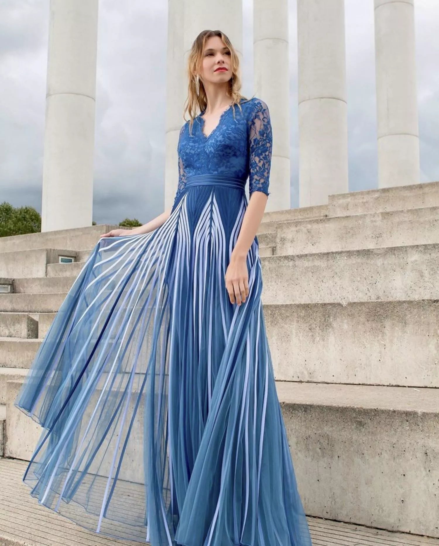 Dettagli prodotto: Corpetto in pizzo con maniche 3/4, Scollo a V profondo con chiusura a due bottoni, Cintura integrata in vita, Gonna lunga in tulle plissettato con motivo a righe, Chiusura posteriore con zip nascosta, Vestibilità: regolare