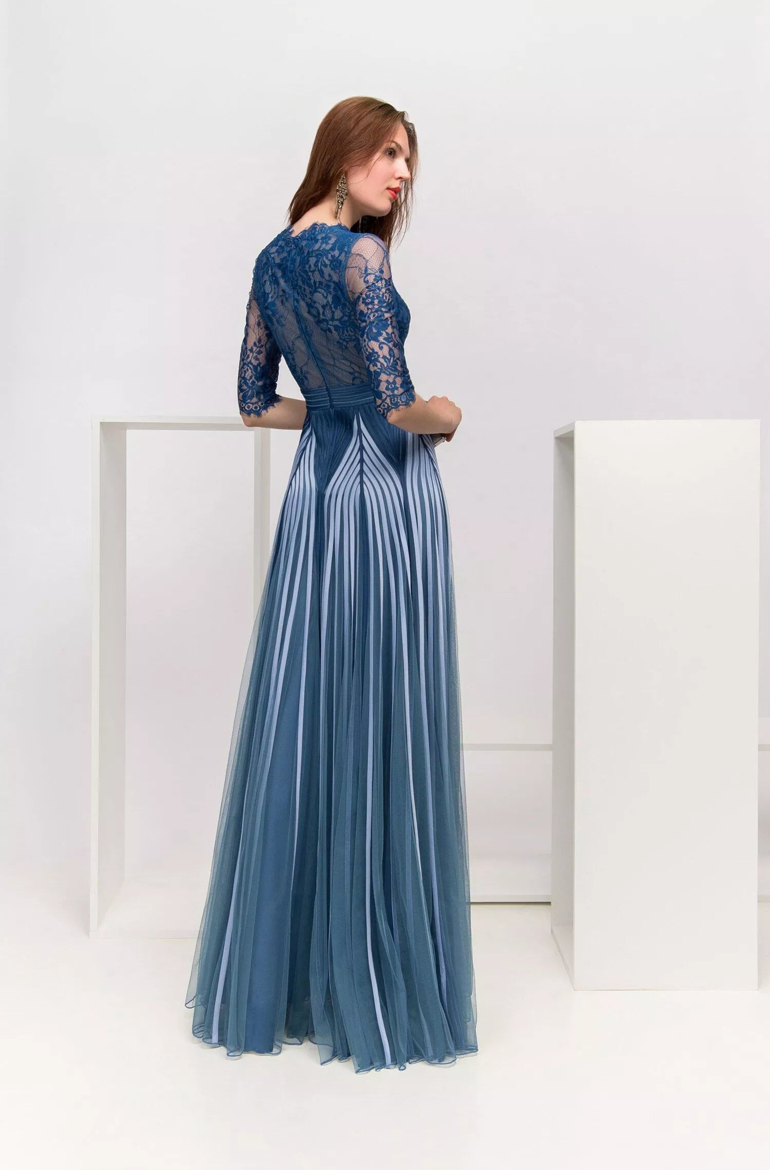 Abito turchese lungo elegante in pizzo e tulle – Promulias