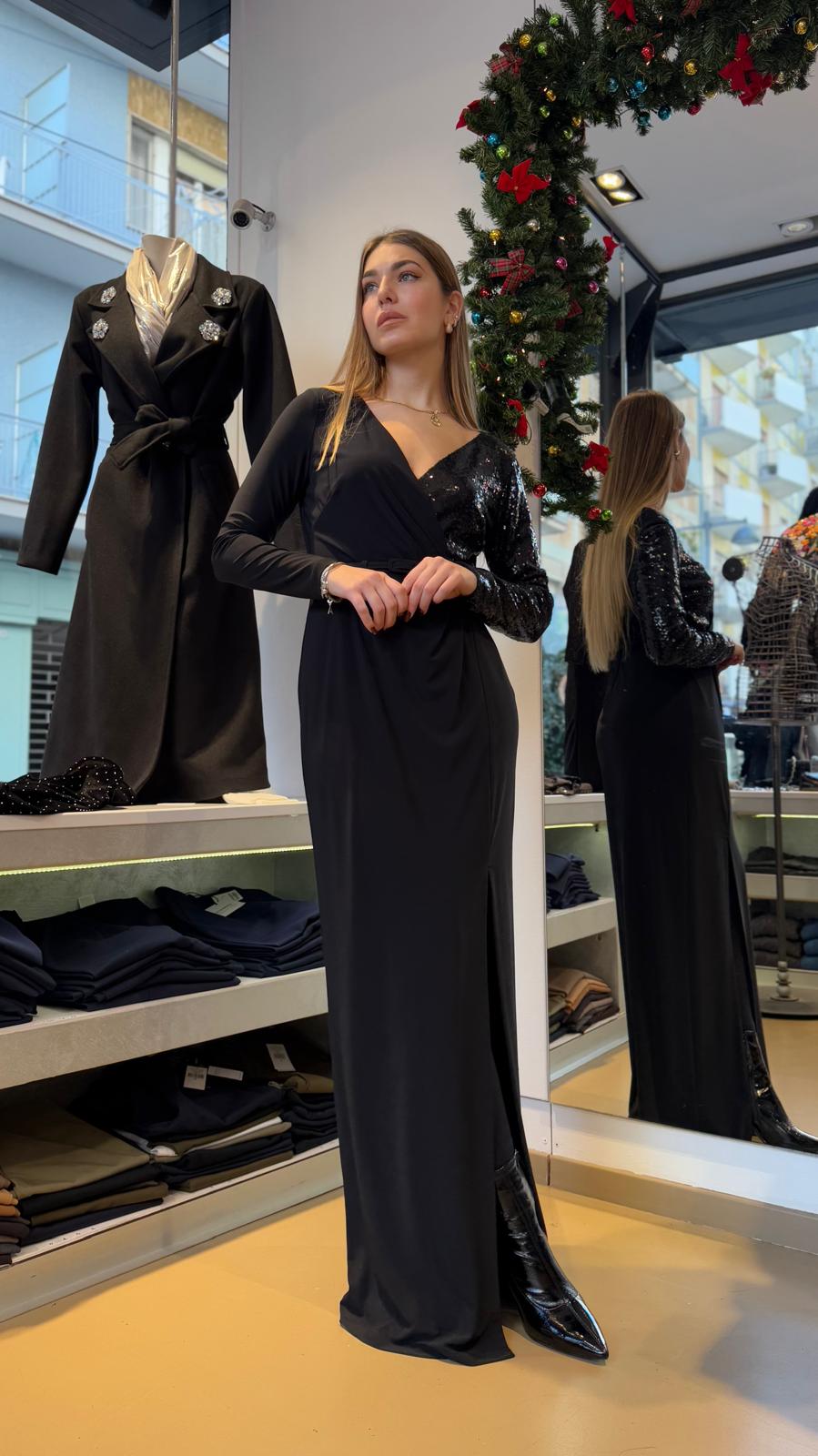 Eleganza e raffinatezza si incontrano in questo splendido abito lungo in jersey. La scollatura a incrocio, impreziosita da paillettes luminose su una manica, dona un tocco sofisticato e contemporaneo. La silhouette è valorizzata dal taglio in vita e dalla cintura coordinata, che sottolinea delicatamente le forme. Il tessuto morbido e fluido cade con naturalezza, garantendo comfort e stile in ogni occasione. Perfetto per una serata speciale, un evento elegante o una celebrazione delle feste, questo abito unisce classe e modernità, permettendoti di brillare con discrezione.