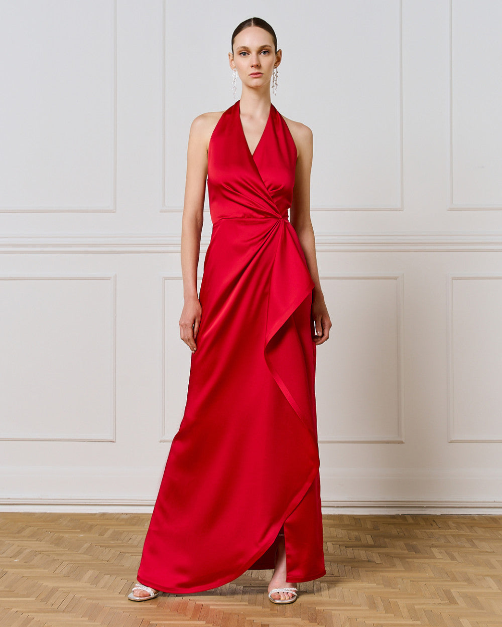 Abito lungo rosso scollato dietro e con volant frontale