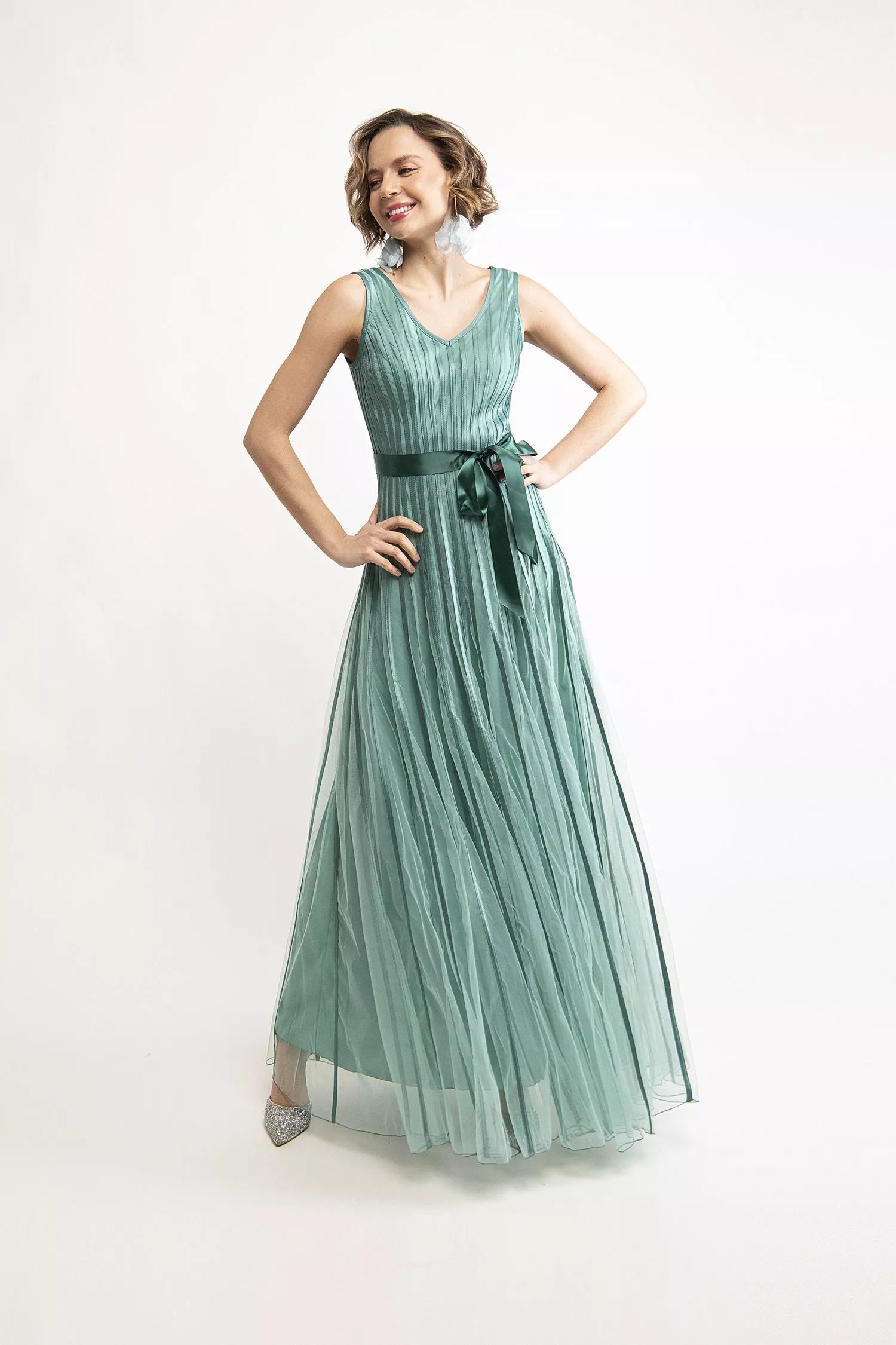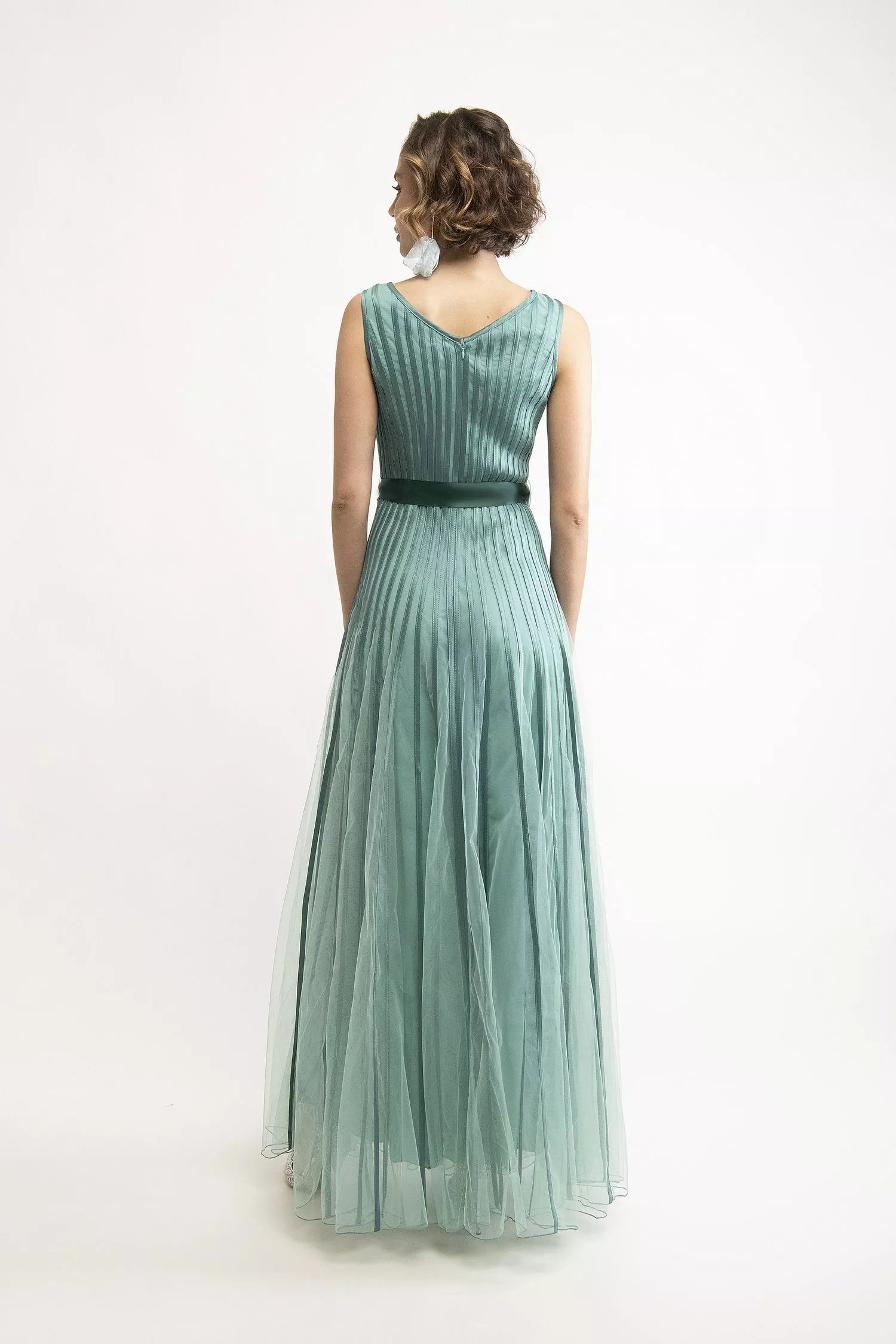 Il nostro abito lungo verde acqua in tulle e raso è il perfetto equilibrio tra eleganza e femminilità. Realizzato con tessuti di alta qualità, dalla morbidezza del tulle alla raffinatezza del raso, questo abito ti garantirà un look sofisticato e sensuale. La scollatura a V e le coppette per il seno aggiungono un tocco di femminilità mentre la composizione in 100% poliestere e la lavabilità in acqua rendono la cura di questo abito facile e conveniente. Indossalo per qualsiasi occasione e lascia tutti a bocca aperta.