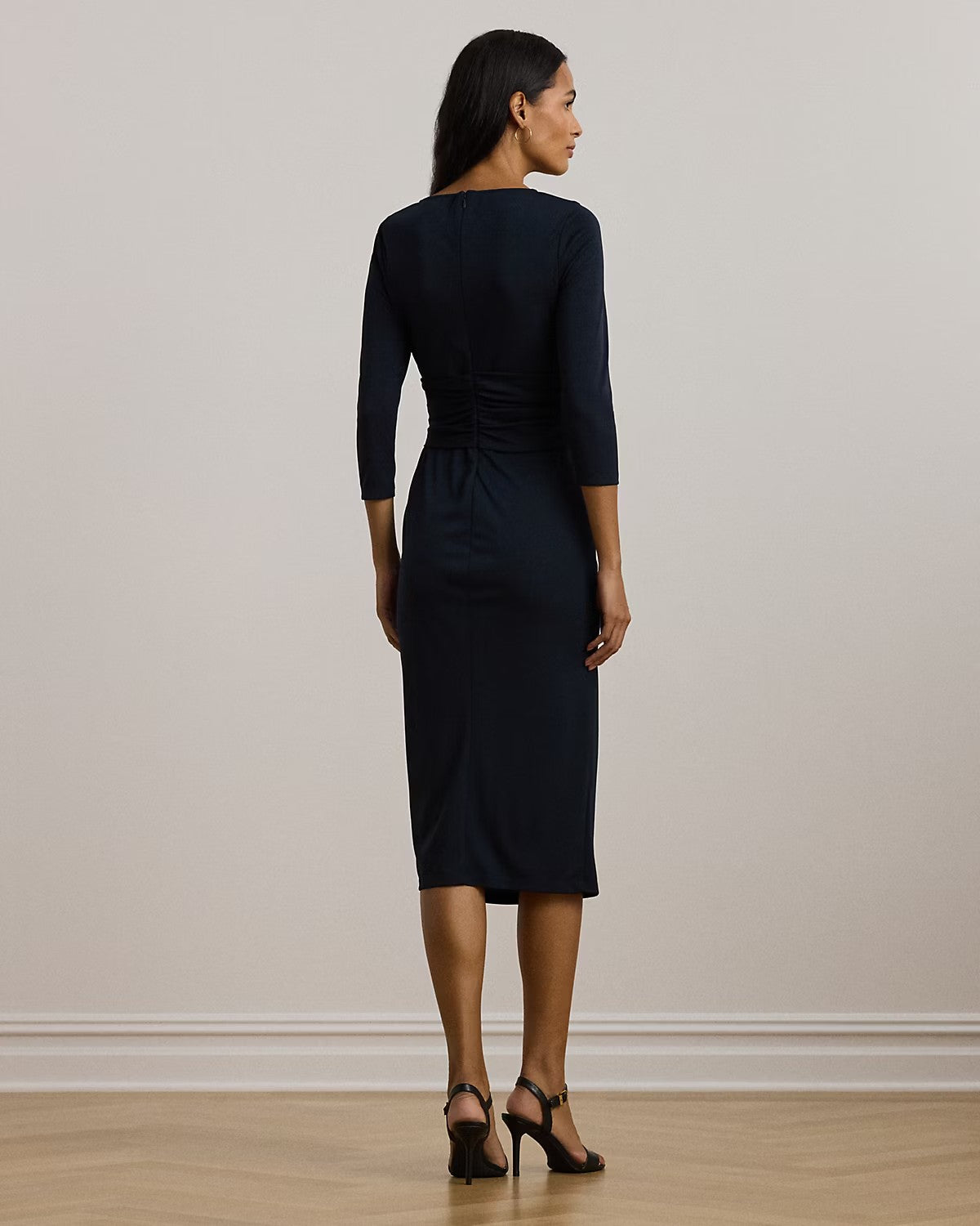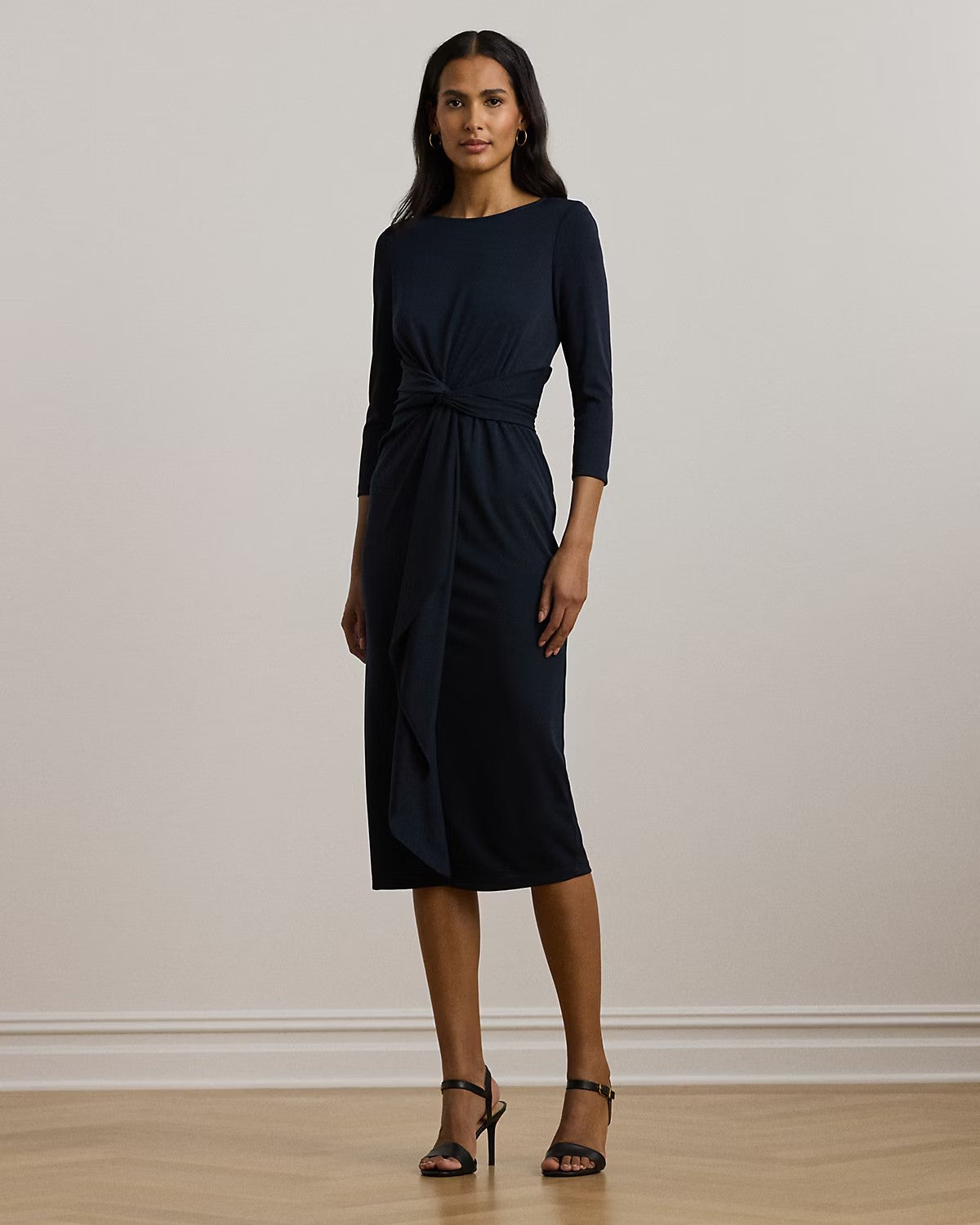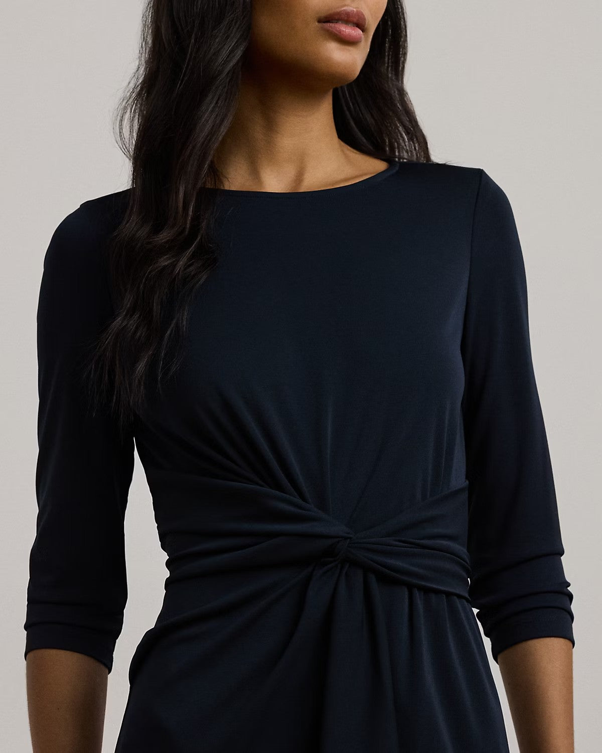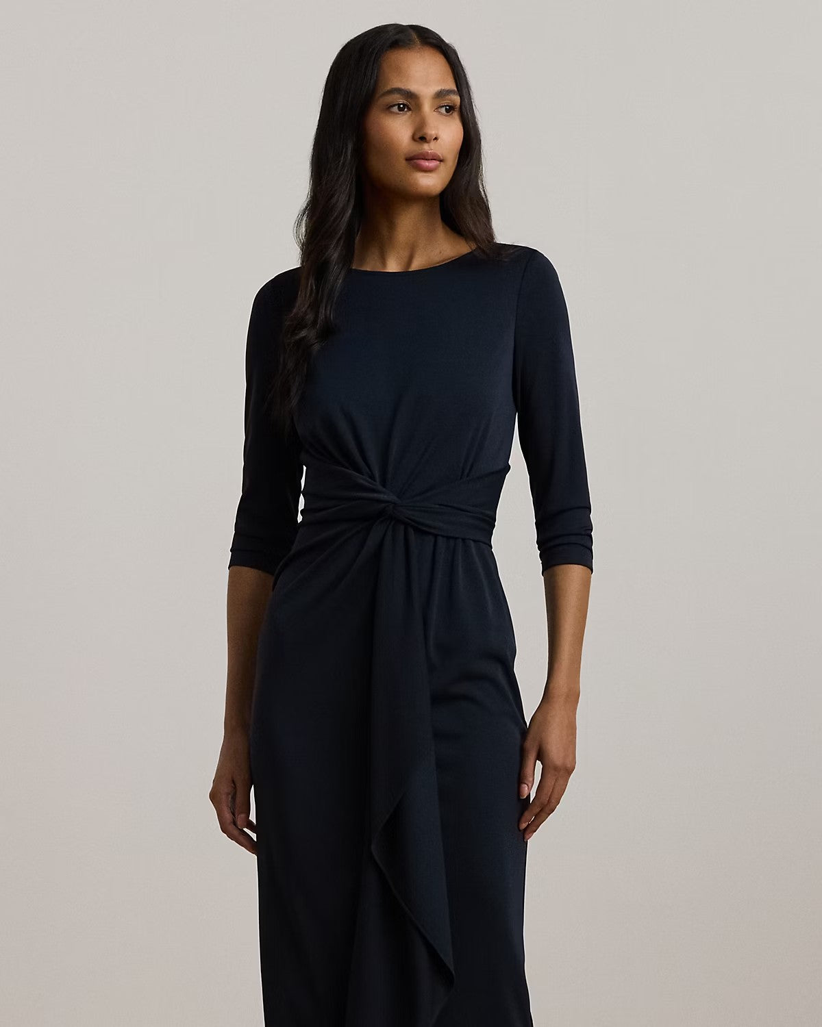 Realizzato con morbido jersey stretch per un drappeggio fluido, questo abito con maniche a tre quarti dona una silhouette a tubino. Con un elegante scollo a barchetta e una cerniera posteriore nascosta, presenta un dettaglio ritorto sul davanti con volant a cascata in vita. Lungo fin sotto il ginocchio, perfetto per una serata elegante. Composizione: 94% poliestere, 6% elastan. Lavabile in acqua o in lavatrice. Colore blu.