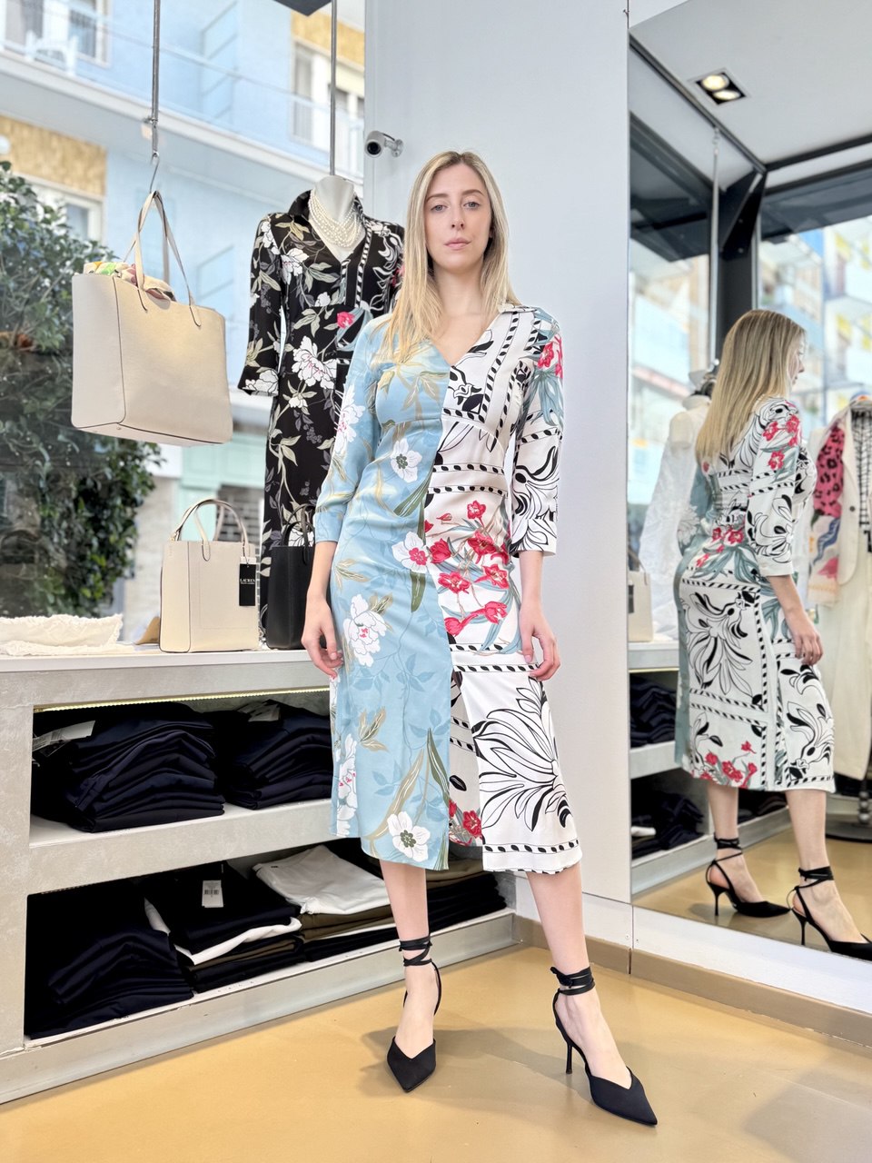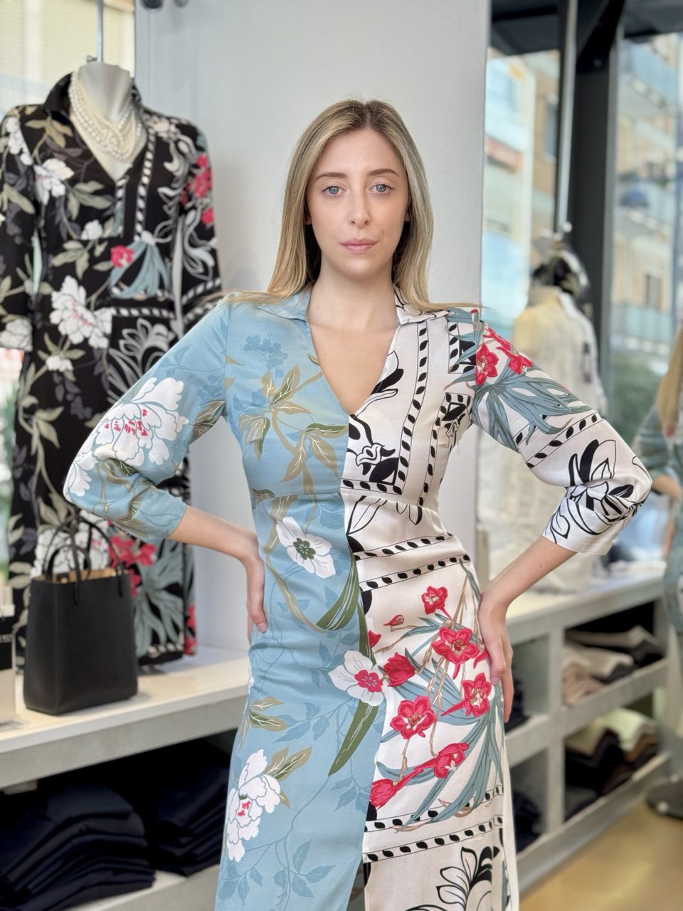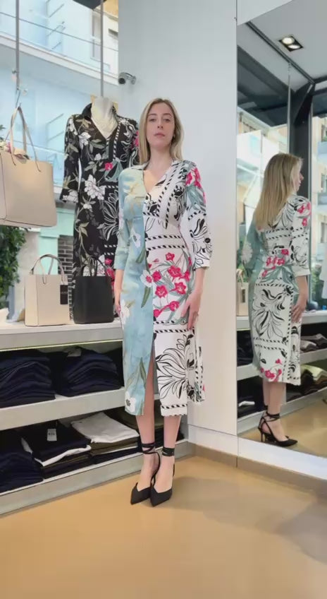 Scopri l'eleganza e il fascino di questo abito midi Emme Marella, confezionato in morbida viscosa che esalta la silhouette. La stampa floreale su sfondo celeste crea un contrasto sofisticato e armonioso, mentre il design incrociato e lo spacco frontale aggiungono un tocco sensuale e moderno. Perfetto per ogni occasione, questo abito valorizza il tuo look con dettagli curati e linee pulite.
