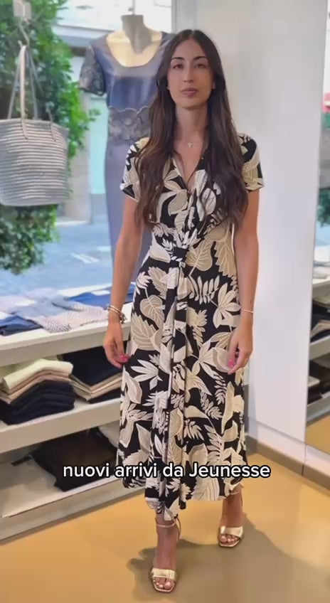 Questo abito midi in jersey combina eleganza e comfort con la sua morbida tessitura e la stampa floreale di grande formato in tonalità beige e nero. La mezza manica lo rende ideale per diverse stagioni, offrendo una vestibilità raffinata che valorizza la silhouette senza rinunciare alla praticità. Perfetto per occasioni formali o per un look sofisticato da giorno. Composizione 95% poliestere, 5% elastan. La taglia 1 corrisponde ad una 40/42, la taglia 2 ad una 42/44, la taglia 3 ad una 44/46
