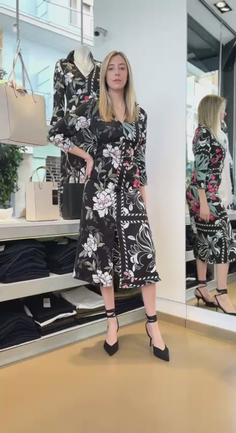 Abito midi in viscosa fantasia floreale su sfondo nero – Emme Marella