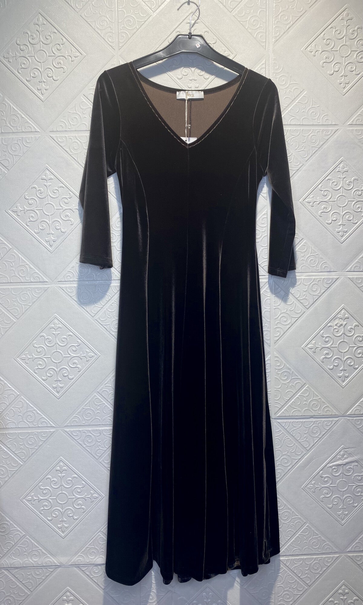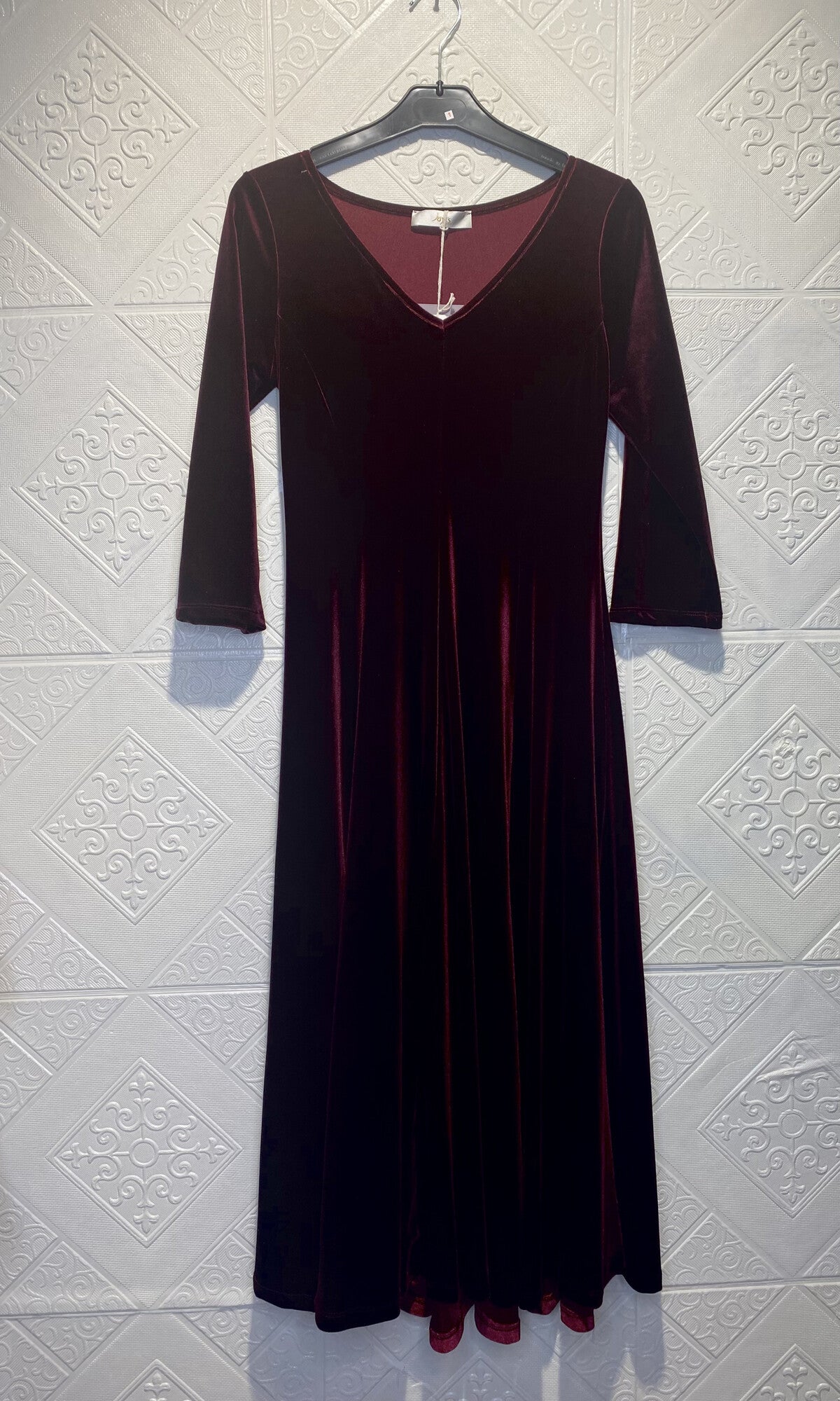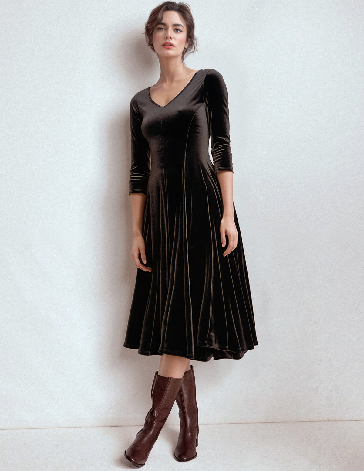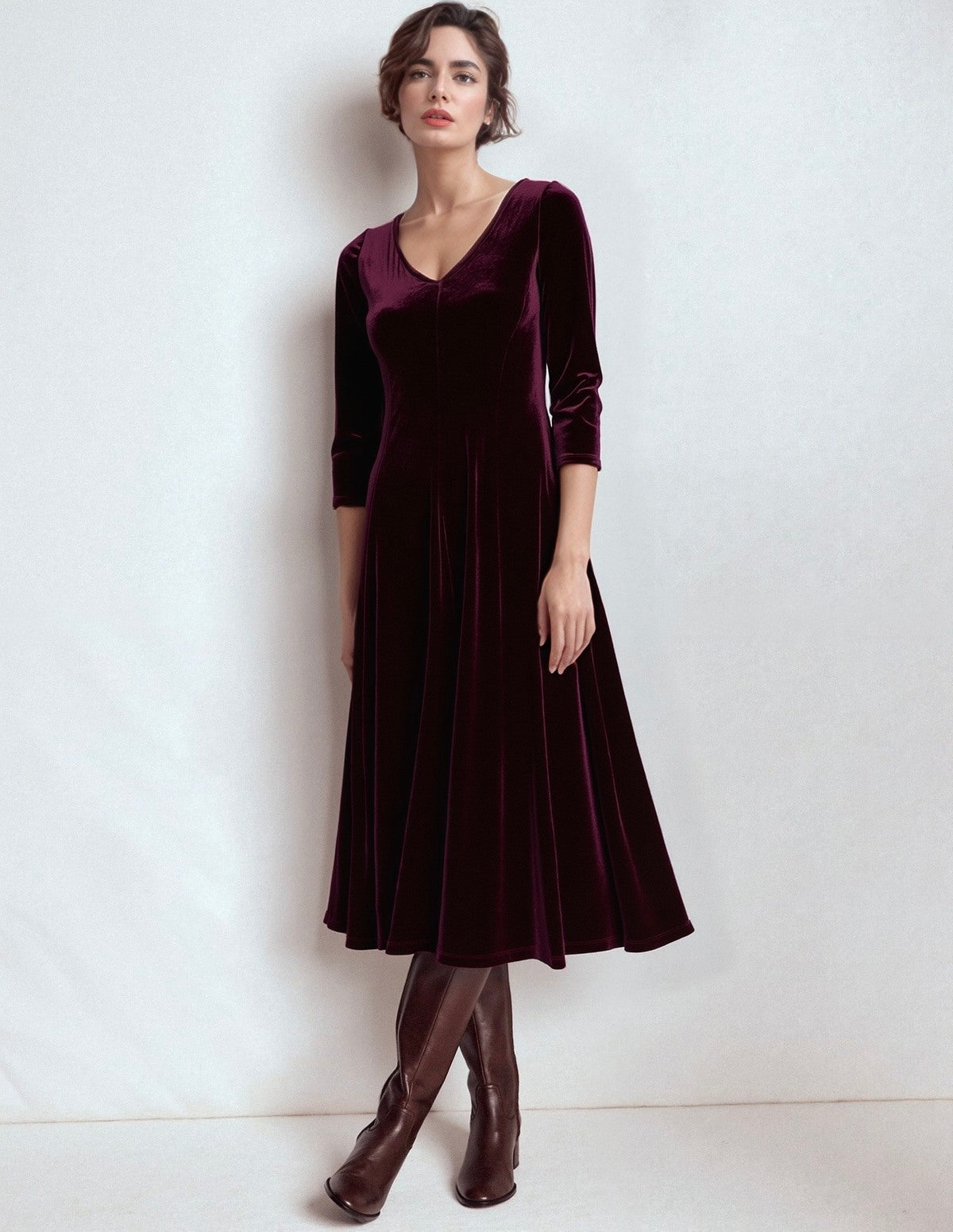 Questo abito midi svasato in velluto liscio si distingue per il suo scollo a V elegante e le maniche a gomito, che valorizzano la silhouette con sofisticatezza. Disponibile in verde, bordeaux e marrone, è la scelta ideale per le giornate di festa, offrendo comfort e stile raffinato. La qualità del velluto garantisce un aspetto lussuoso e una vestibilità impeccabile, perfetto per chi ricerca un capo versatile e distintivo.