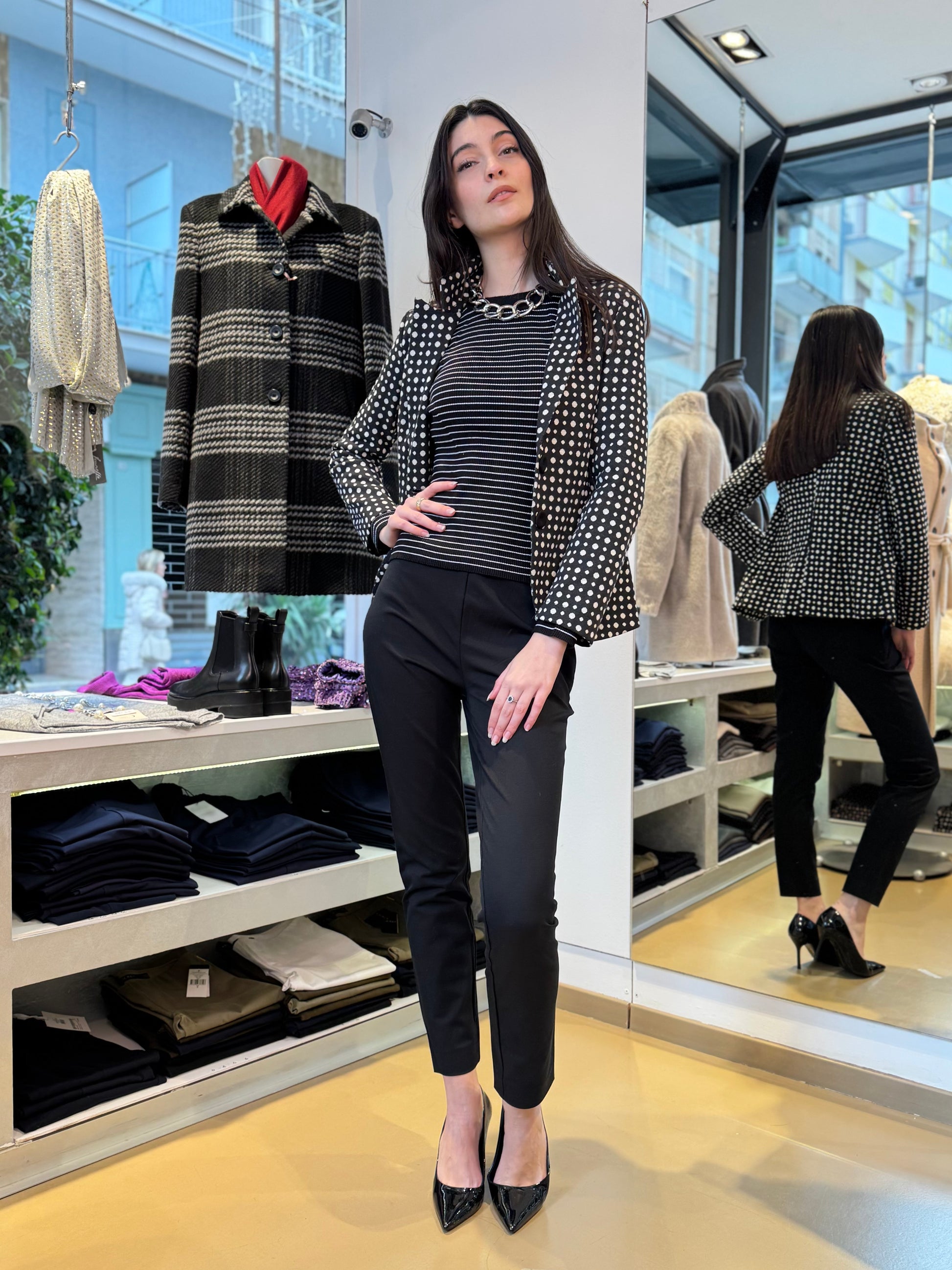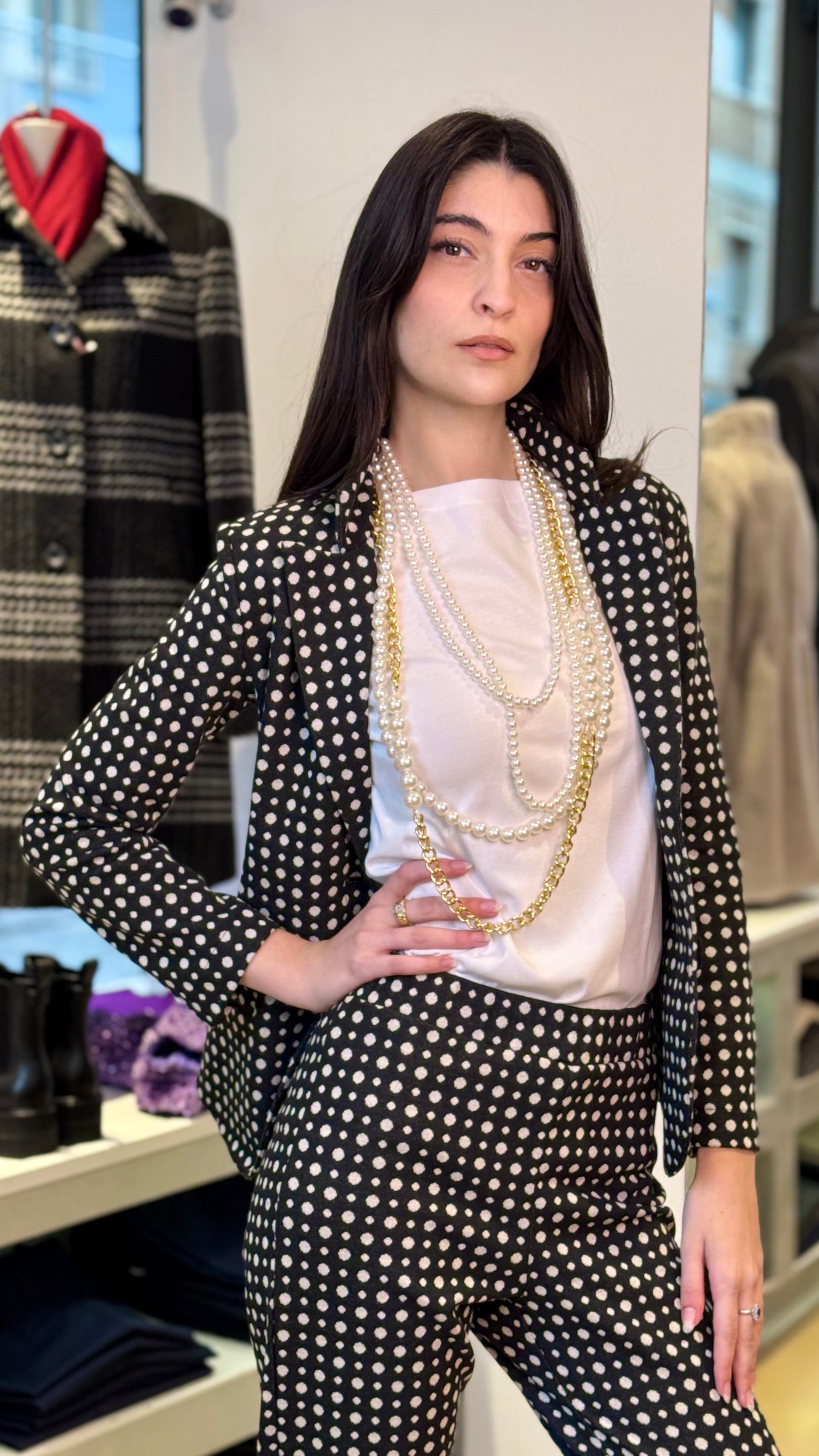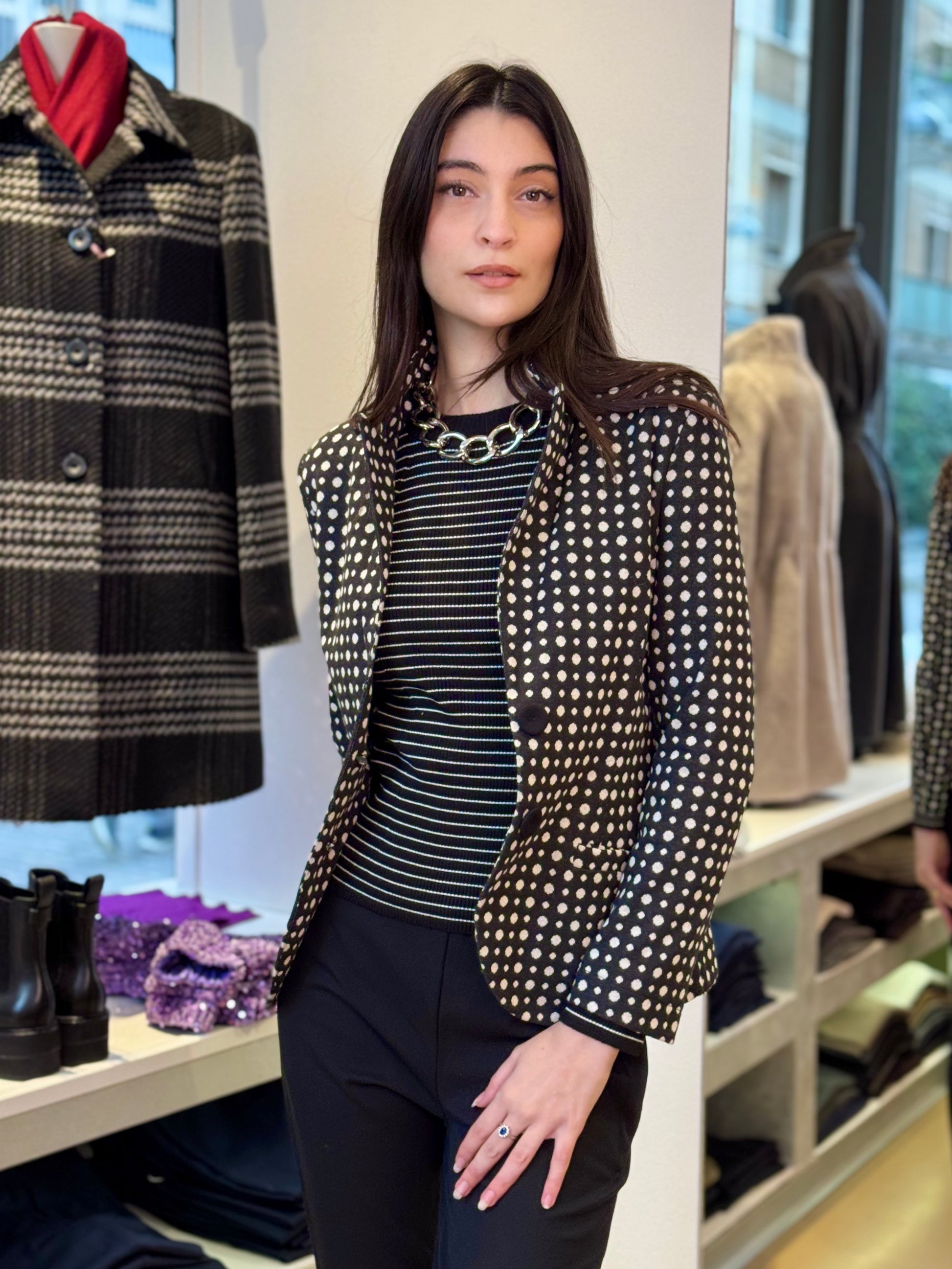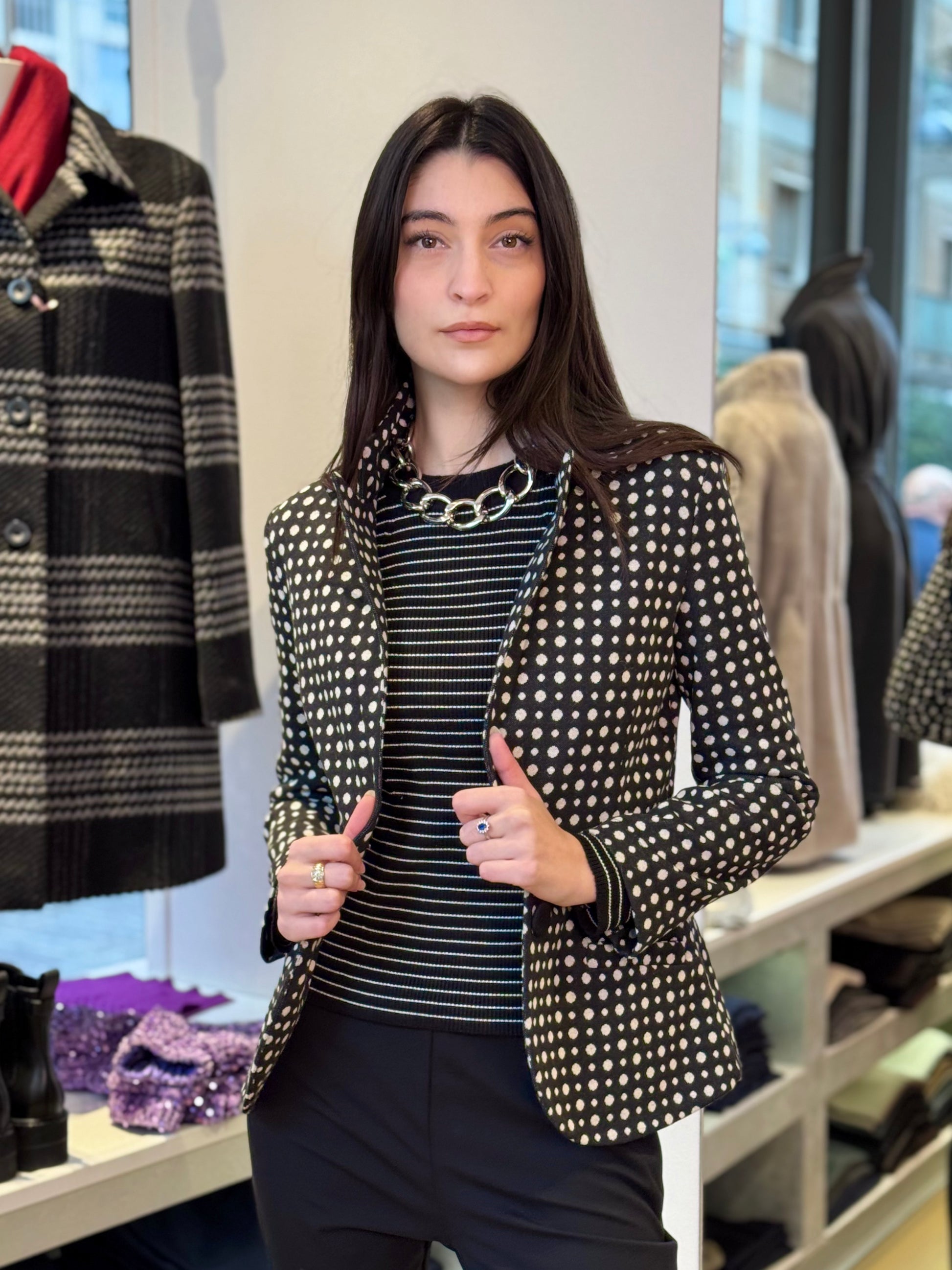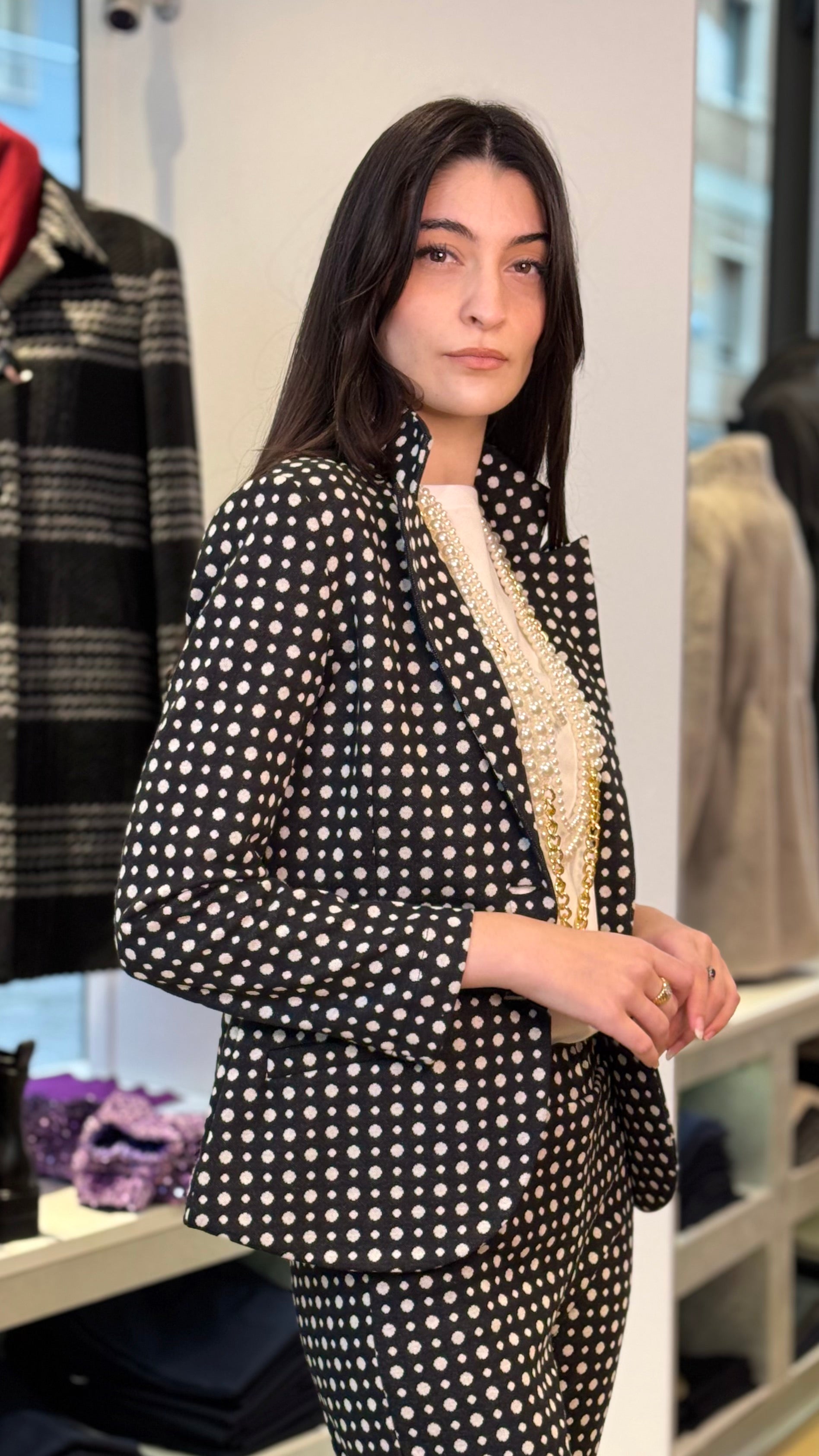 Giacca monopetto elasticizzata in stampa pois nero e bianco