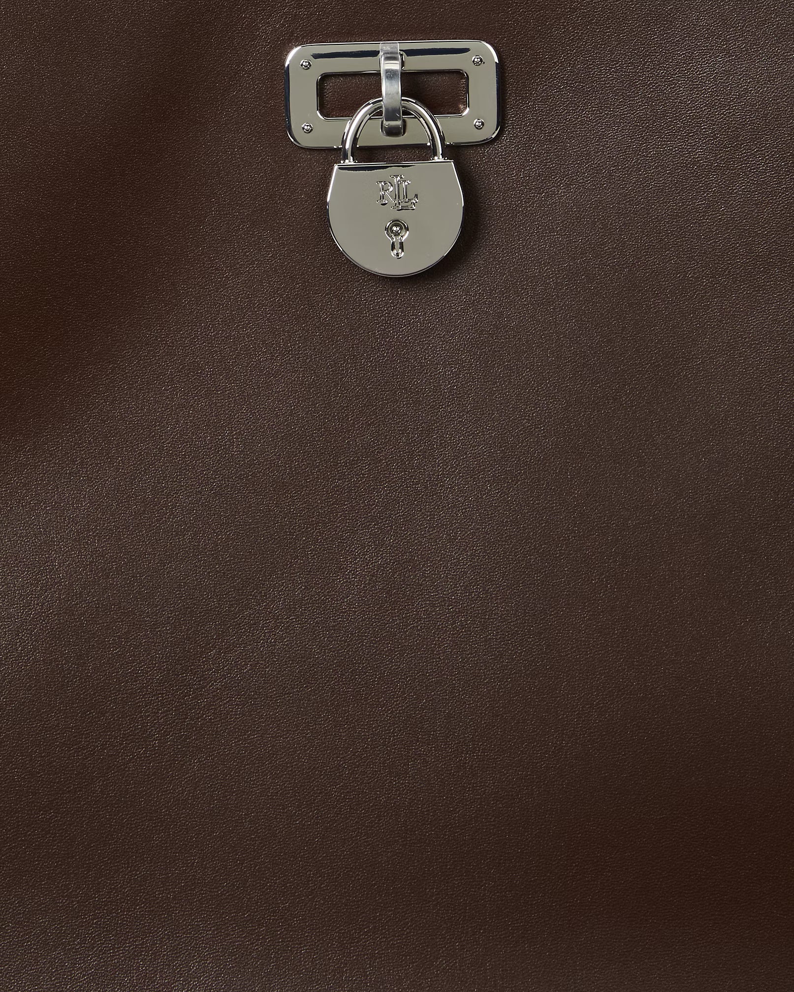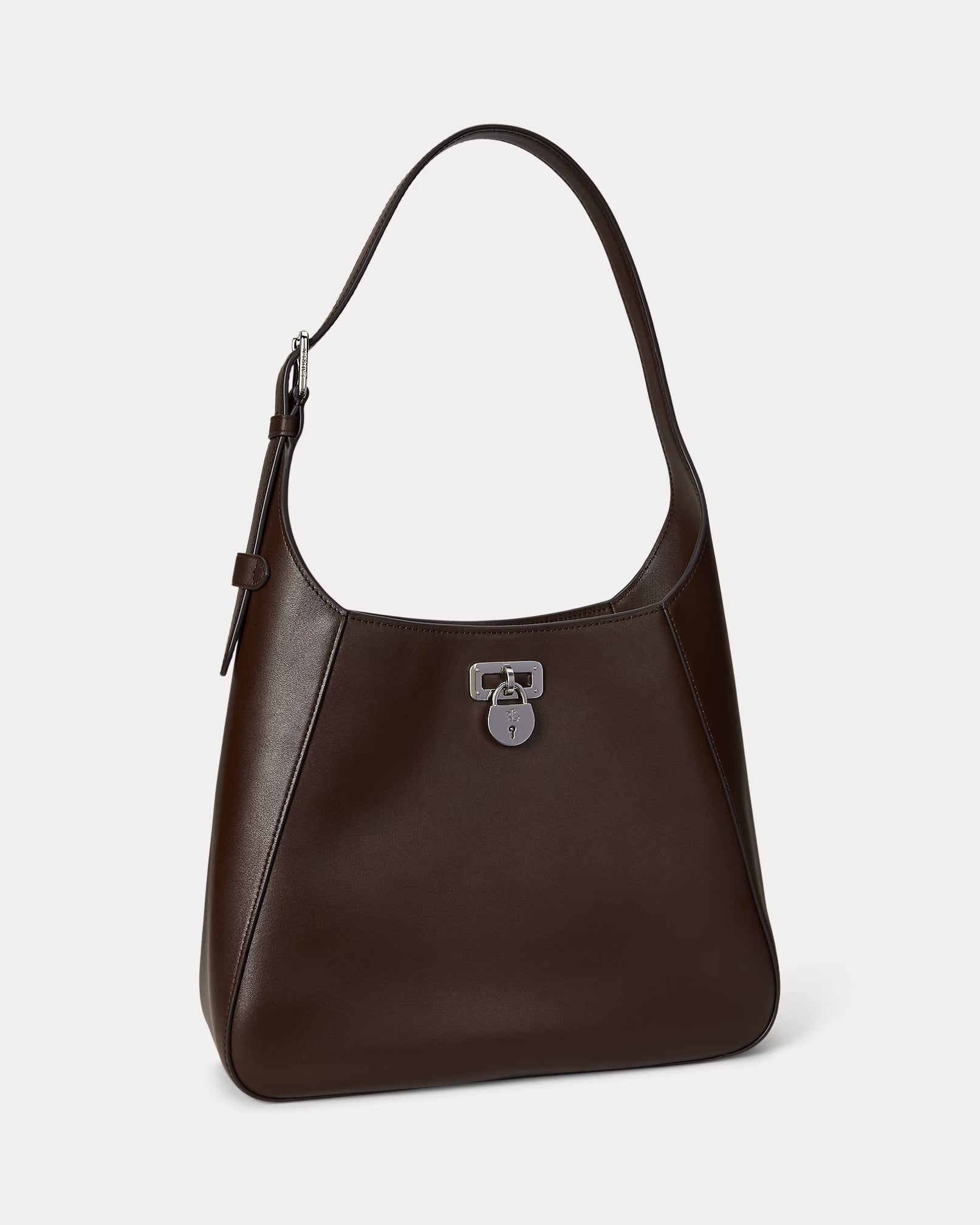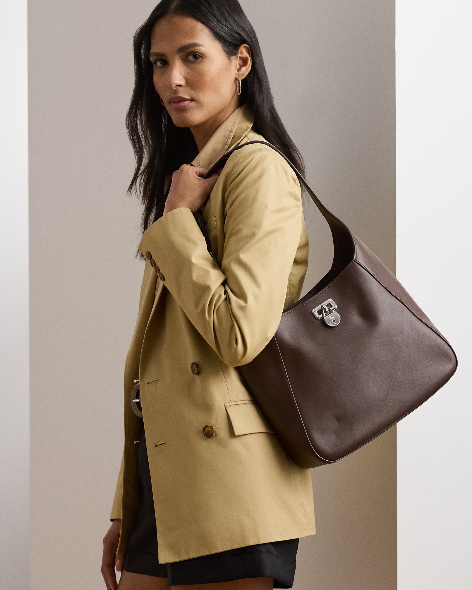 La borsa grande marrone a spalla Tanner combina stile e funzionalità con la sua silhouette arrotondata e la morbida pelle pieno fiore dalla finitura liscia. Spaziosa e pratica, è ideale per custodire tutti i tuoi effetti personali. I dettagli esclusivi, come il ciondolo a lucchetto inciso "LRL" e la fibbia a rullo con incisione "Lauren", aggiungono un tocco di eleganza. La tracolla regolabile assicura comfort e versatilità, rendendo questa borsa perfetta per ogni occasione.