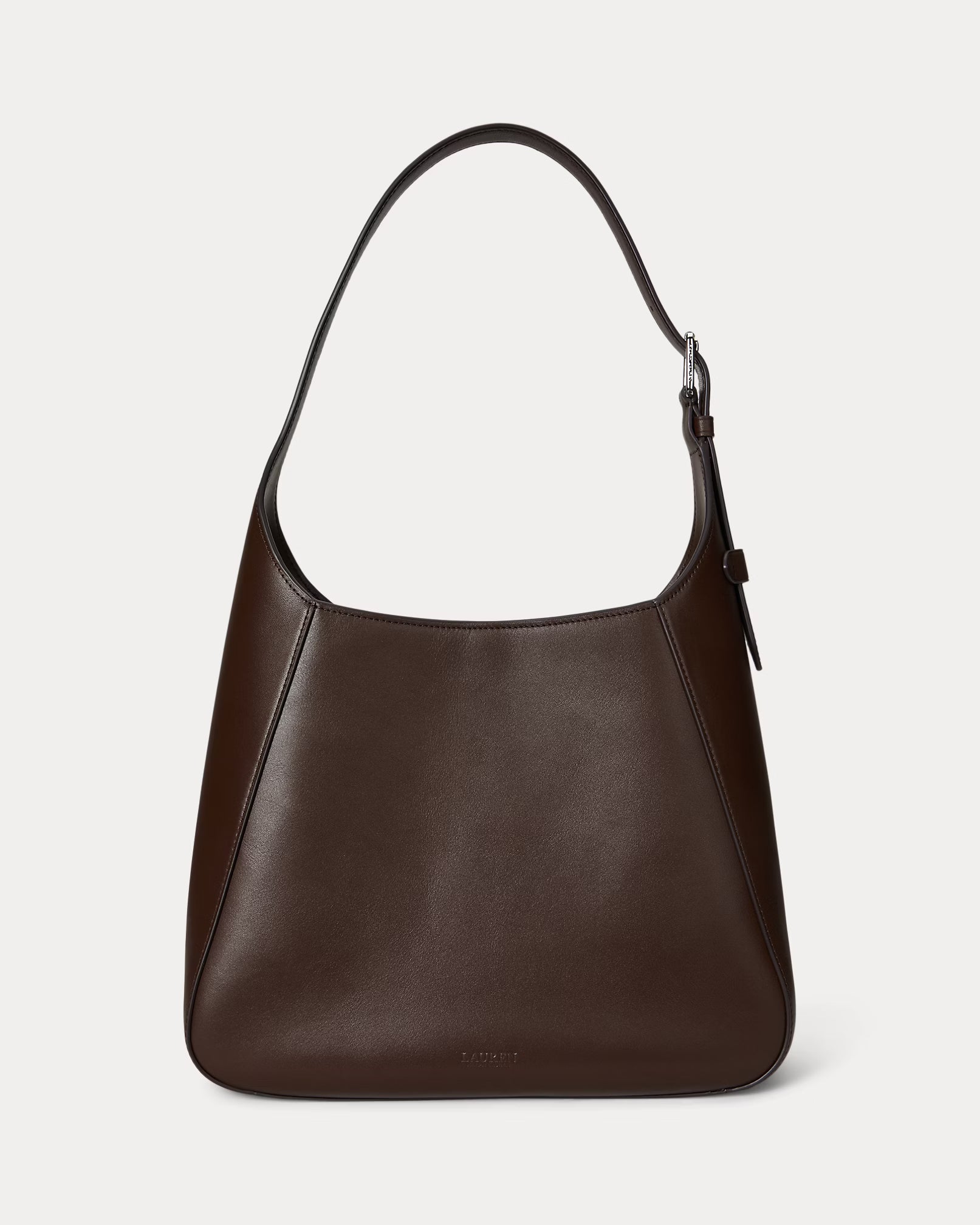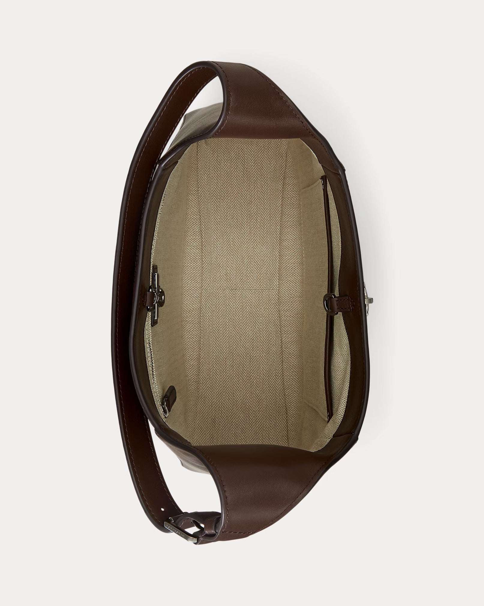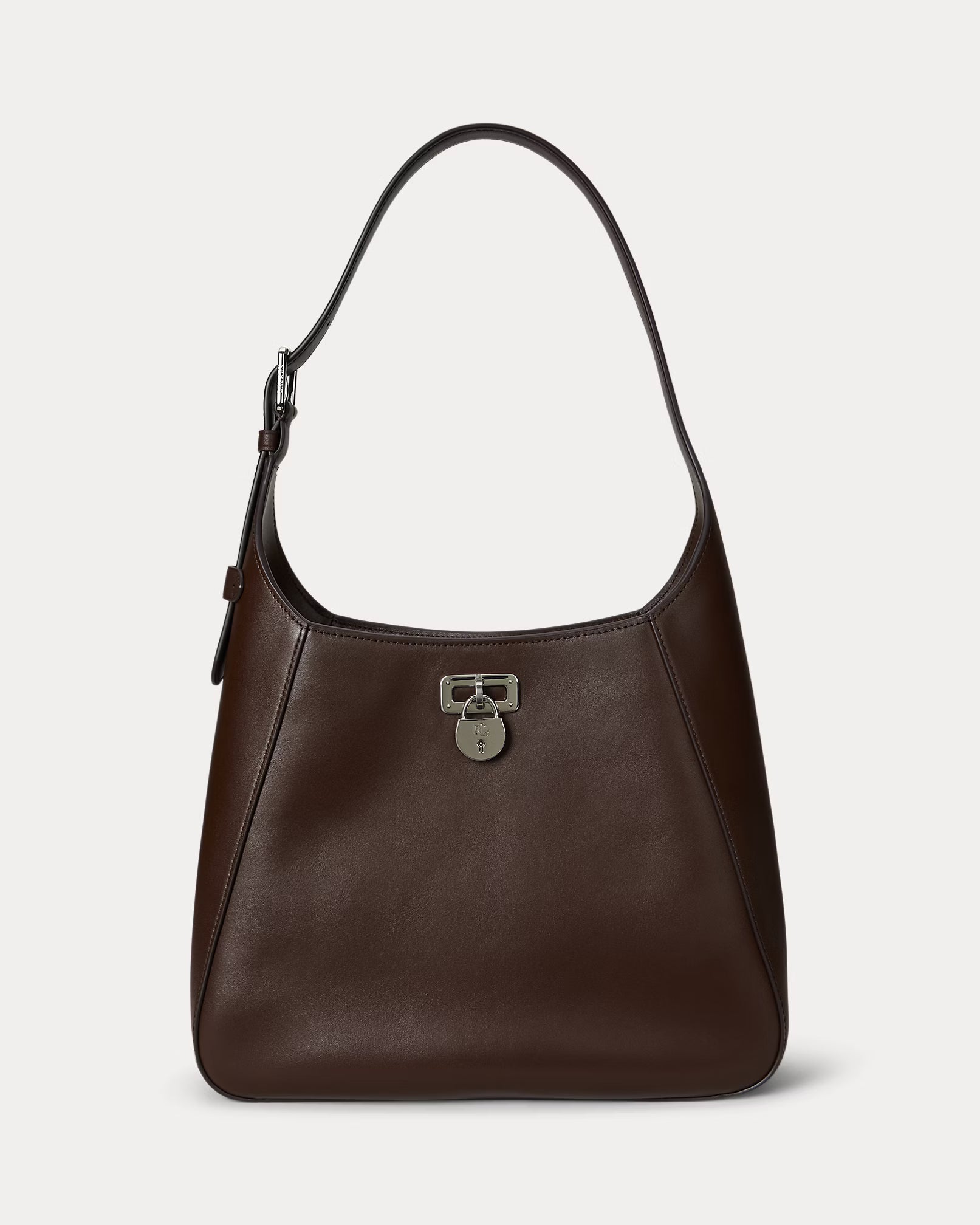 La borsa grande marrone a spalla Tanner combina stile e funzionalità con la sua silhouette arrotondata e la morbida pelle pieno fiore dalla finitura liscia. Spaziosa e pratica, è ideale per custodire tutti i tuoi effetti personali. I dettagli esclusivi, come il ciondolo a lucchetto inciso "LRL" e la fibbia a rullo con incisione "Lauren", aggiungono un tocco di eleganza. La tracolla regolabile assicura comfort e versatilità, rendendo questa borsa perfetta per ogni occasione.