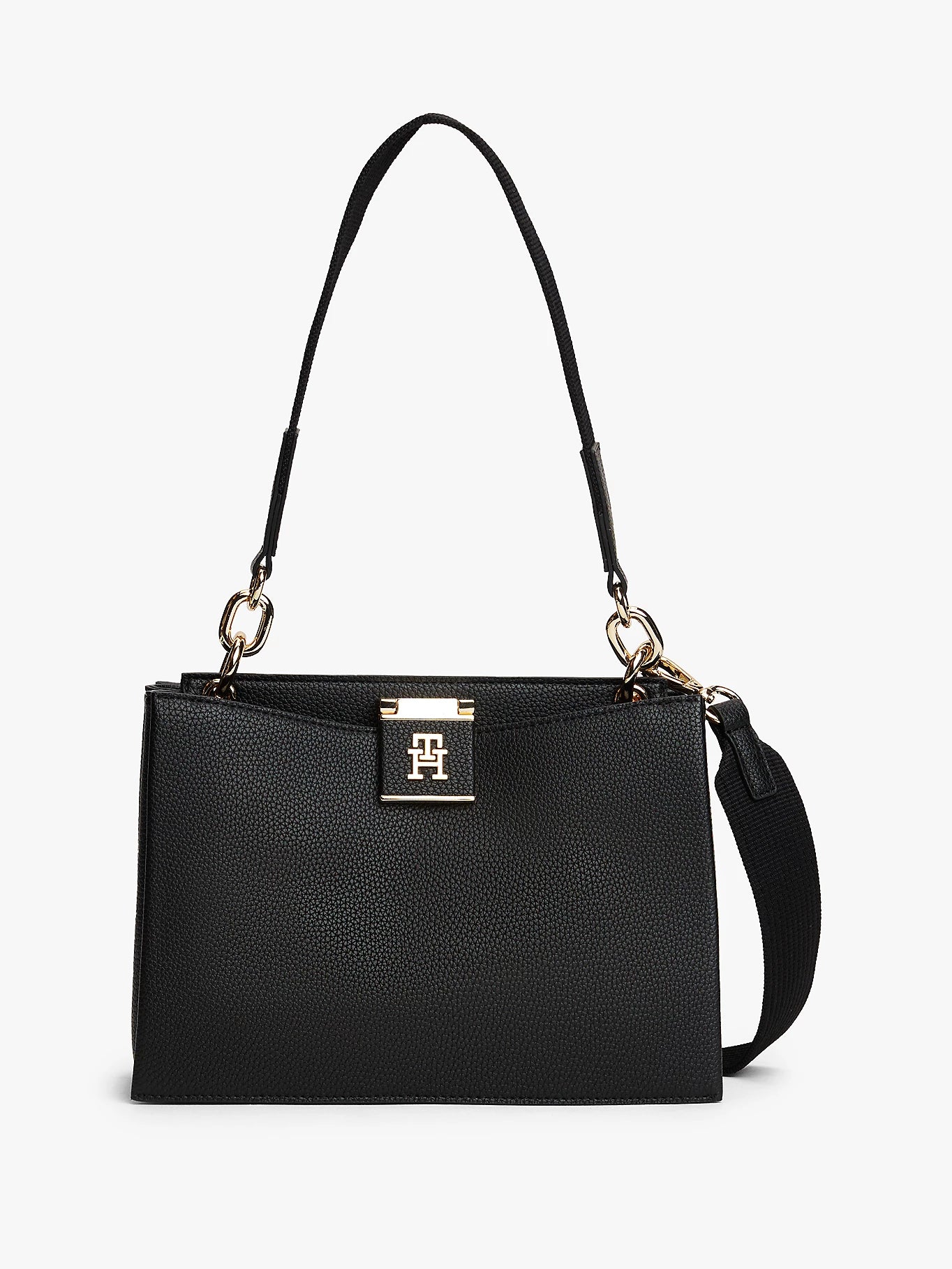 La borsa media Satchel con finitura zigrinata unisce eleganza e praticità grazie al suo design raffinato e materiali resistenti. Dotata di manico superiore e tracolla regolabile e rimovibile in tessuto, offre versatilità per l’uso quotidiano e serate speciali. La chiusura magnetica a scatto assicura sicurezza, mentre i due scomparti principali garantiscono una capienza funzionale. Rifinita con una placchetta monogrammata TH, è un accessorio distintivo firmato Tommy Hilfiger, realizzato in 100% poliuretano per facilità di cura e durata. Dimensioni compatte: 24,5 x 12 x 18,5 cm.