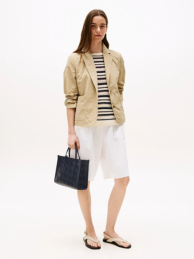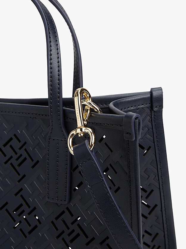 La borsa mini tote City blu unisce eleganza e funzionalità grazie al motivo monogrammato TH traforato su tutta la superficie e ai dettagli in metallo dorato. Realizzata con finitura tramata, presenta una chiusura magnetica, due manici e una tracolla regolabile e rimovibile per diverse modalità di utilizzo. Lo scomparto principale offre spazio organizzato in un formato compatto di 27 x 10 x 21 cm, ideale per chi cerca uno stile sofisticato senza rinunciare alla praticità quotidiana. Un accessorio distintivo firmato Tommy Hilfiger. Composizione 100% poliuretano