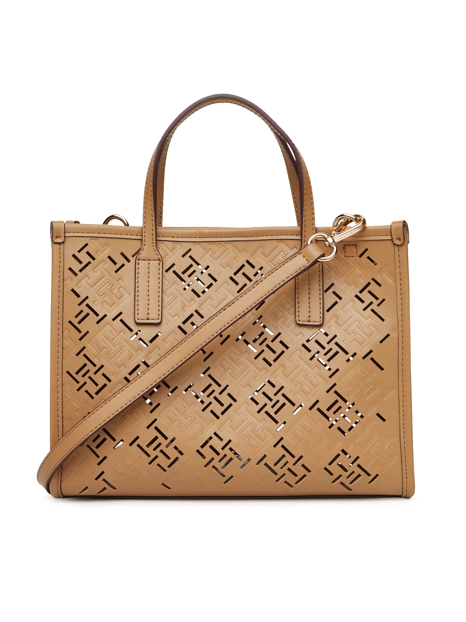 La borsa mini tote City cammello di Tommy Hilfiger unisce stile raffinato e funzionalità. Realizzata in poliuretano con finitura tramata, presenta il motivo monogrammato TH traforato su tutta la superficie e dettagli in metallo dorato. Dotata di chiusura magnetica, due manici e tracolla regolabile e rimovibile, offre versatilità d’uso. Le dimensioni compatte (27 x 10 x 21 cm) racchiudono uno scomparto principale ben organizzato, ideale per chi cerca un accessorio elegante e pratico per la vita quotidiana.