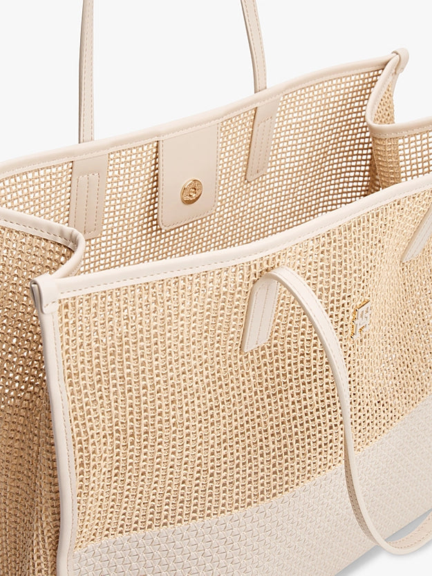 La borsa tote city beige in tela intrecciata offre una pratica chiusura magnetica e una capienza ideale per i look estivi. La sua finitura intrecciata e la placca con monogramma TH aggiungono un tocco di stile all'accessorio, garantendo la qualità ed eleganza tipiche del marchio Tommy Hilfiger. Dimensioni 43x17x31 cm. Composizione: 65% poliestere, 35% polipropilene.