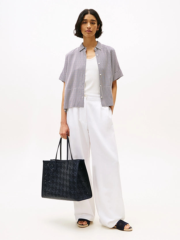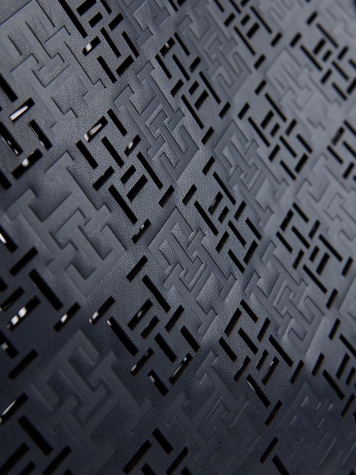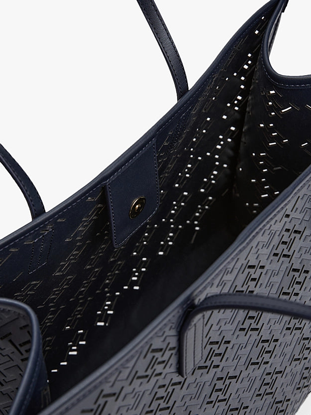 La borsa tote City blu unisce eleganza e funzionalità grazie al suo ampio scomparto interno da 20 litri, ideale per organizzare tutto il necessario quotidiano. Realizzata in poliuretano con finitura tramata, si distingue per il motivo monogrammato TH impresso e traforato su tutta la superficie, che conferisce un tocco distintivo e raffinato. Dotata di chiusura magnetica e due manici resistenti, questa borsa firmata Tommy Hilfiger è perfetta per chi cerca stile e praticità in un unico accessorio. Misura 43 x 17 x 31 cm. Composizione: 100% poliuretano.