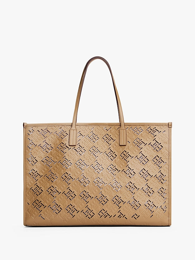 La borsa tote City cammello combina eleganza e praticità con un ampio scomparto interno da 20 litri, perfetto per organizzare gli oggetti quotidiani. Realizzata in poliuretano con finitura tramata, presenta un motivo monogrammato TH traforato che aggiunge un dettaglio raffinato e distintivo. Dotata di chiusura magnetica e due manici robusti, questa borsa firmata Tommy Hilfiger unisce stile e funzionalità in un accessorio versatile. Dimensioni: 43 x 17 x 31 cm. Composizione: 100% poliuretano.