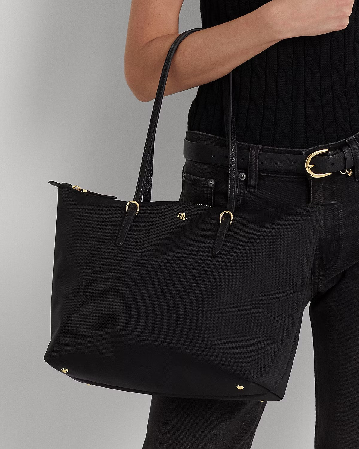 Realizzata in robusto nylon e da eleganti manici in similpelle, la borsa tote Keaton ha una sagoma ampia, ideale per contenere tutto il necessario per la giornata. Questo accessorio indispensabile e versatile è arricchito da un distintivo logo in metallo "LRL" sul davanti, che conferisce un tocco di stile unico. Composizione: 100% nylon. Dimensioni cm 26,7x 38x14