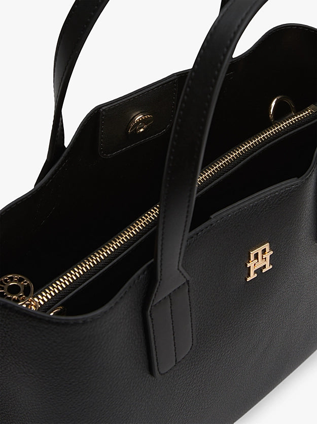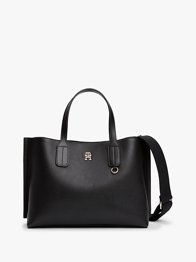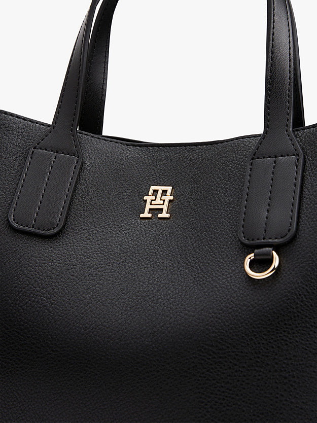 Questa borsa tote media in nero presenta un distintivo monogramma TH e una pregiata finitura zigrinata piatta. Progettata per la massima versatilità, offre doppia modalità di trasporto: manici superiori per l'impugnatura manuale e tracolla regolabile in tessuto per il comfort a spalla. La chiusura magnetica garantisce sicurezza senza compromettere l'estetica, mentre la placchetta frontale con monogramma TH conferisce un elemento di riconoscibilità del marchio Tommy Hilfiger. Realizzata in poliuretano 100% di alta qualità, misura precisamente 32 x 12 x 22 cm, bilanciando perfettamente capienza e portabilità.