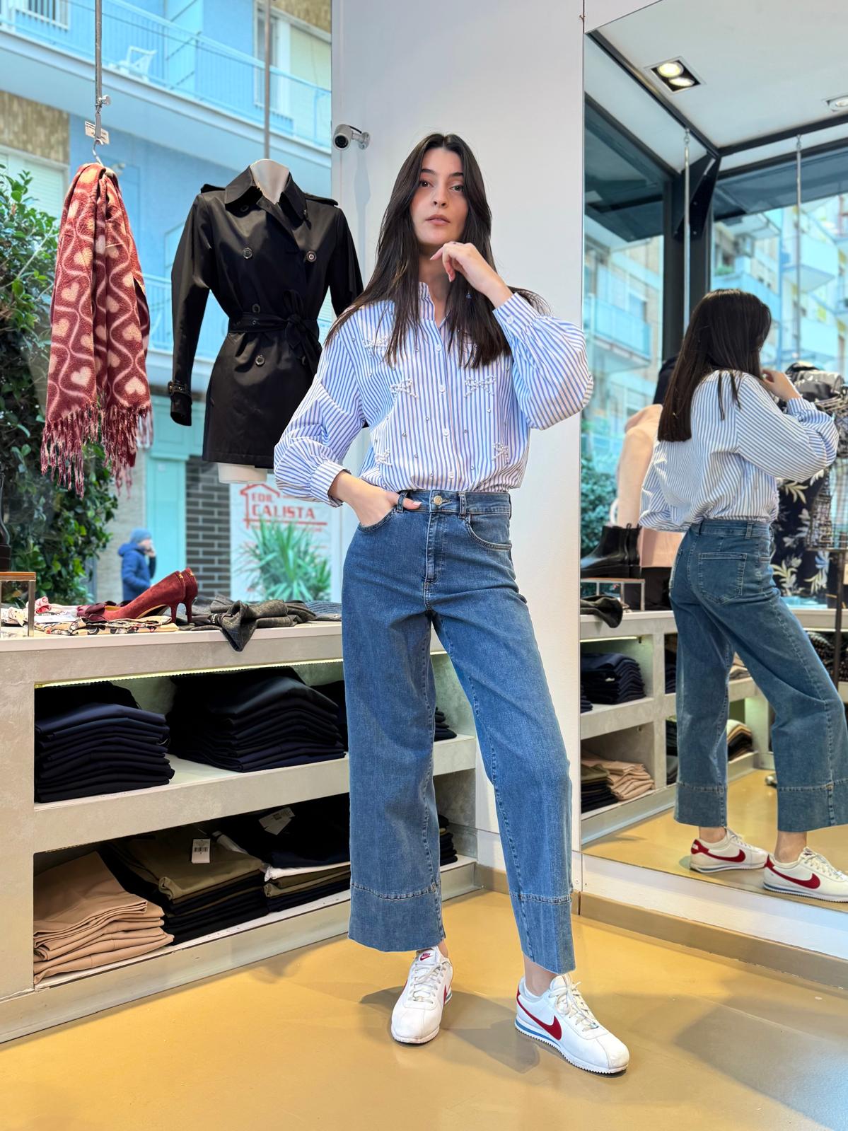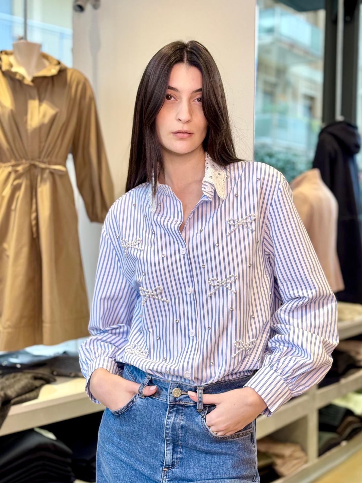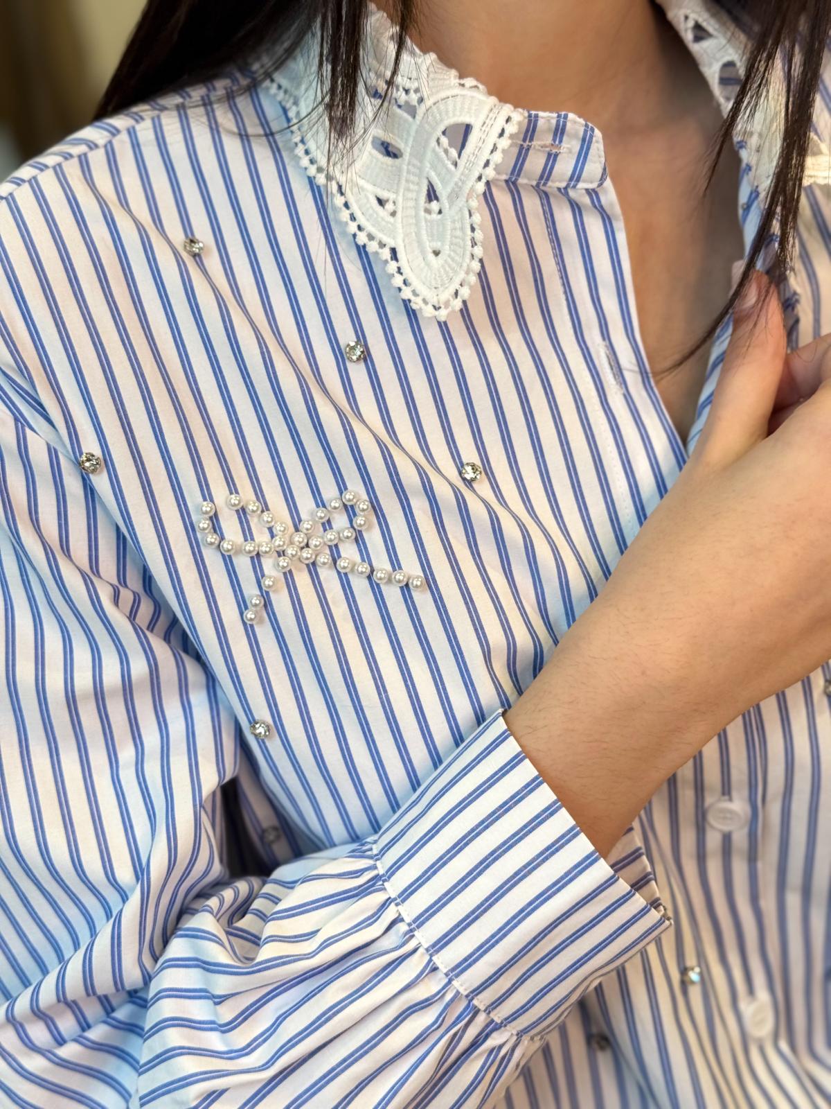 Elegante camicia bianca e celeste a righe, dal taglio comodo e collo di pizzo. Deliziose applicazioni di perle e brillantini adornano il davanti, aggiungendo un tocco di lusso. Perfetta per una donna sofisticata e di classe. Composizione: 65% cotone, 30% viscosa, 5% elastan. Lavabile in acqua.