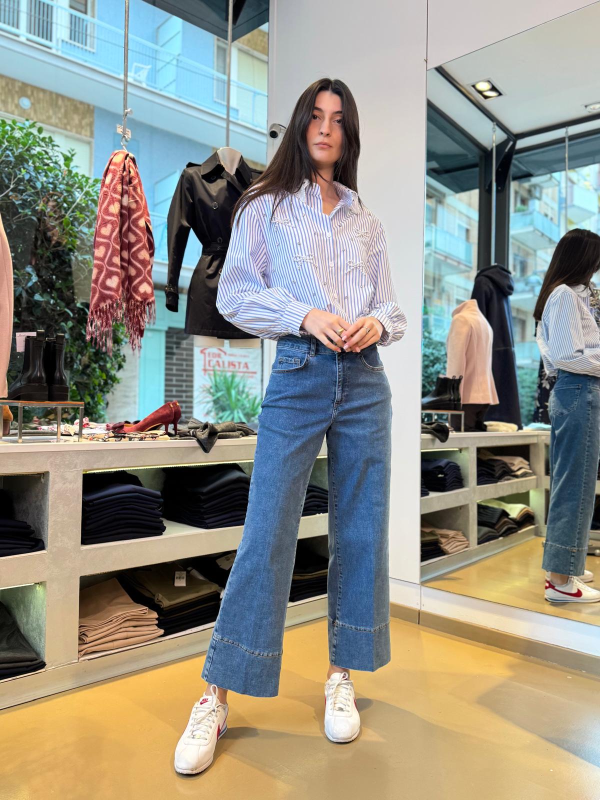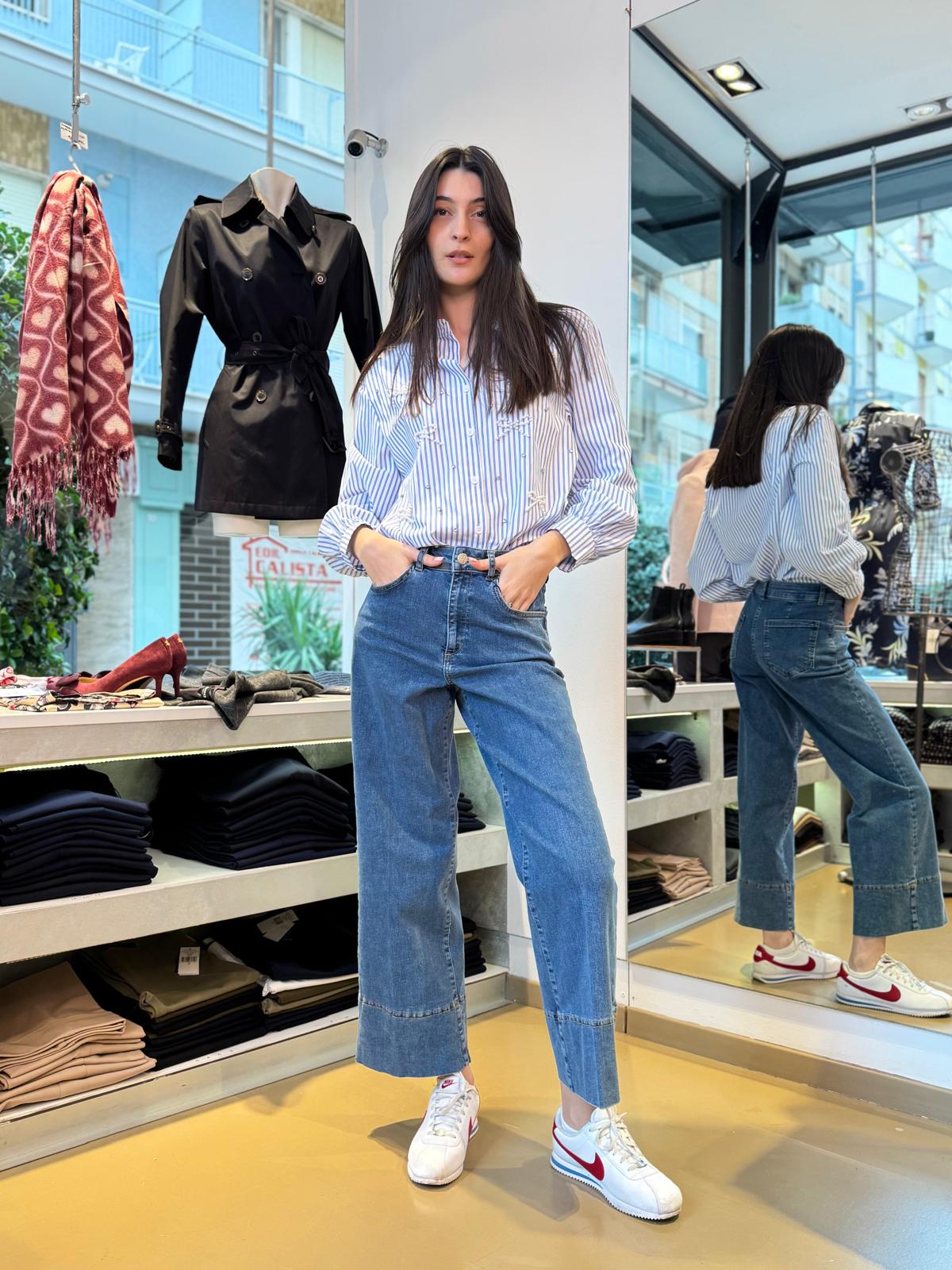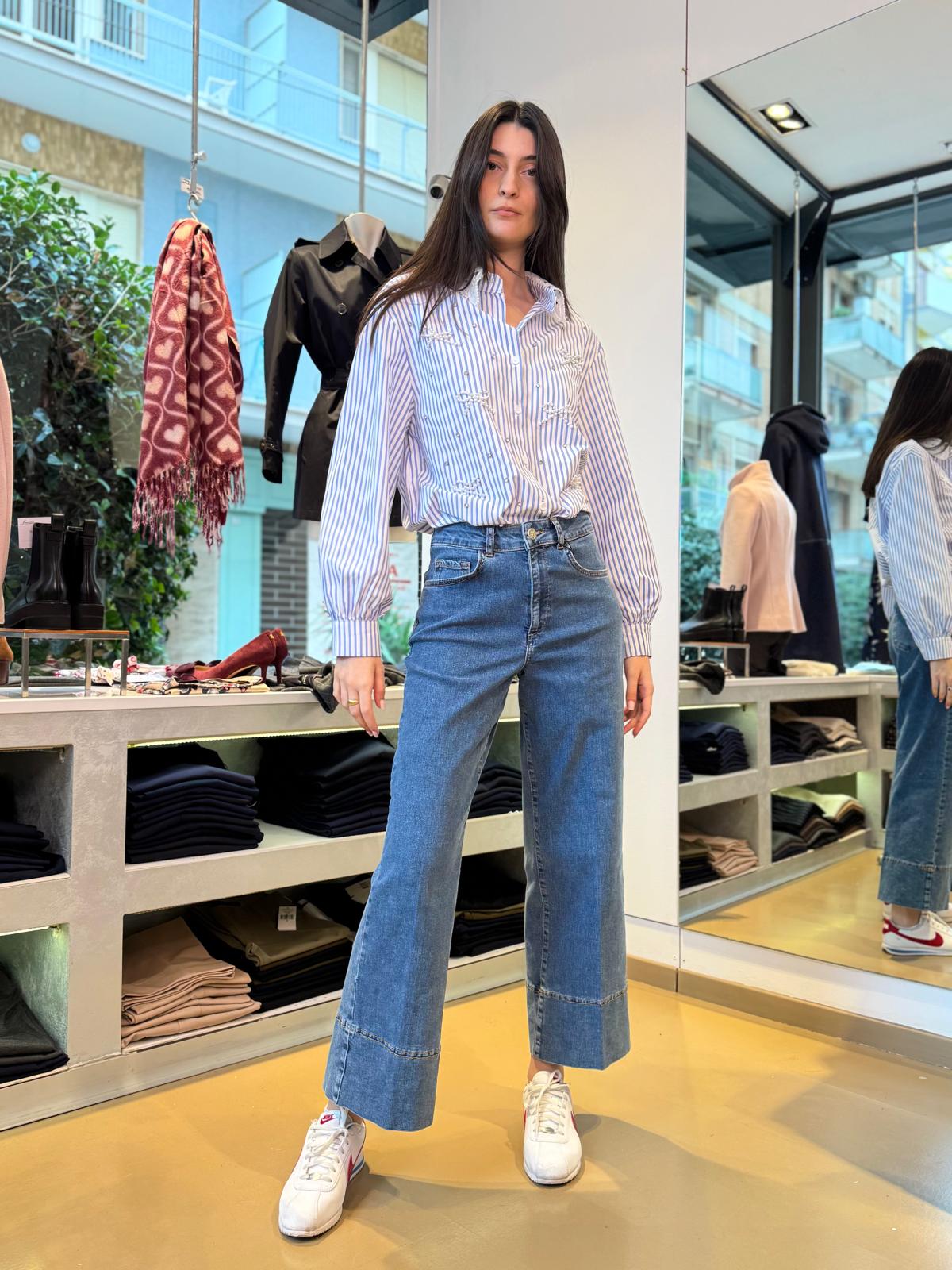 Elegante camicia bianca e celeste a righe, dal taglio comodo e collo di pizzo. Deliziose applicazioni di perle e brillantini adornano il davanti, aggiungendo un tocco di lusso. Perfetta per una donna sofisticata e di classe. Composizione: 65% cotone, 30% viscosa, 5% elastan. Lavabile in acqua.
