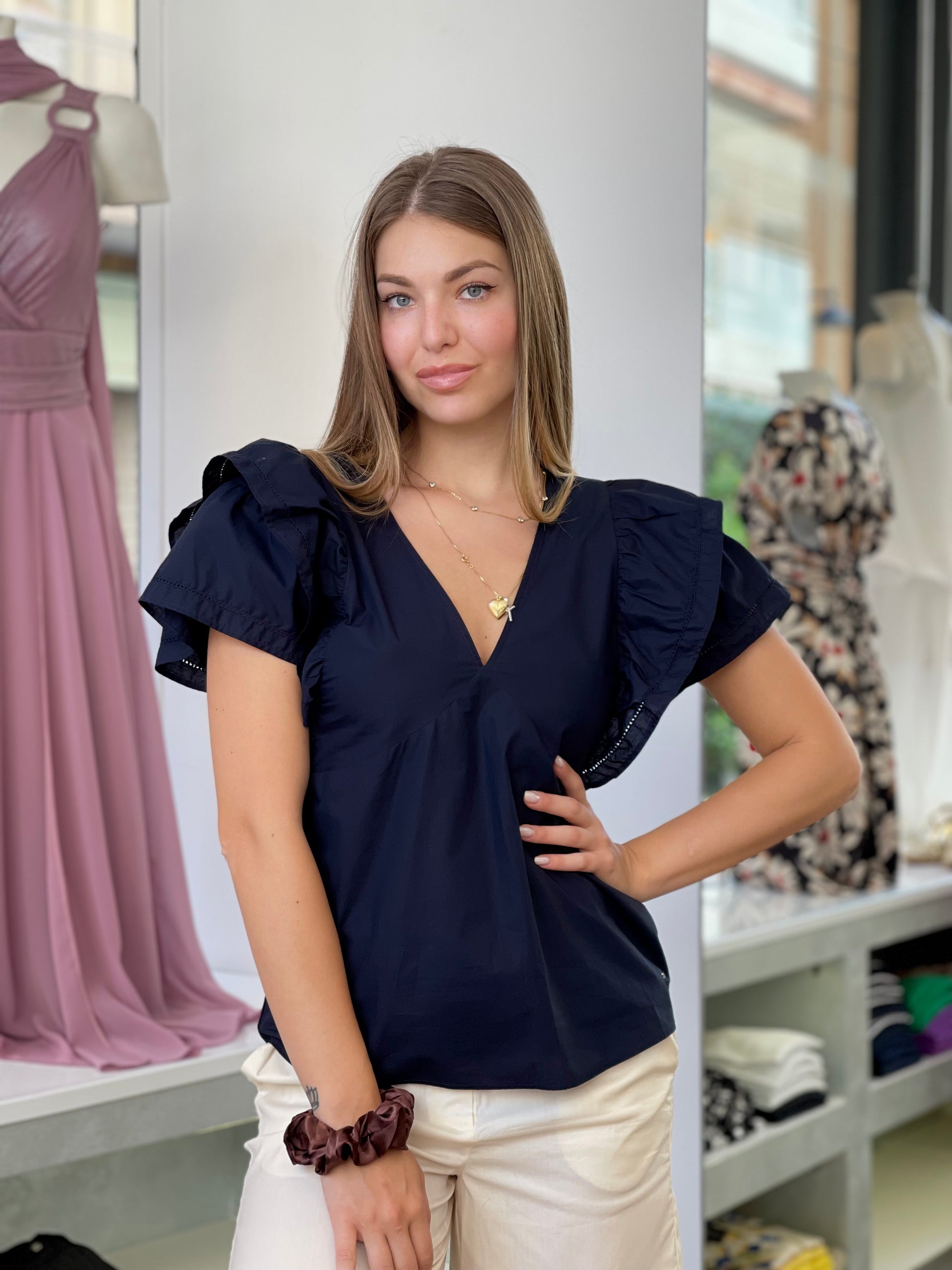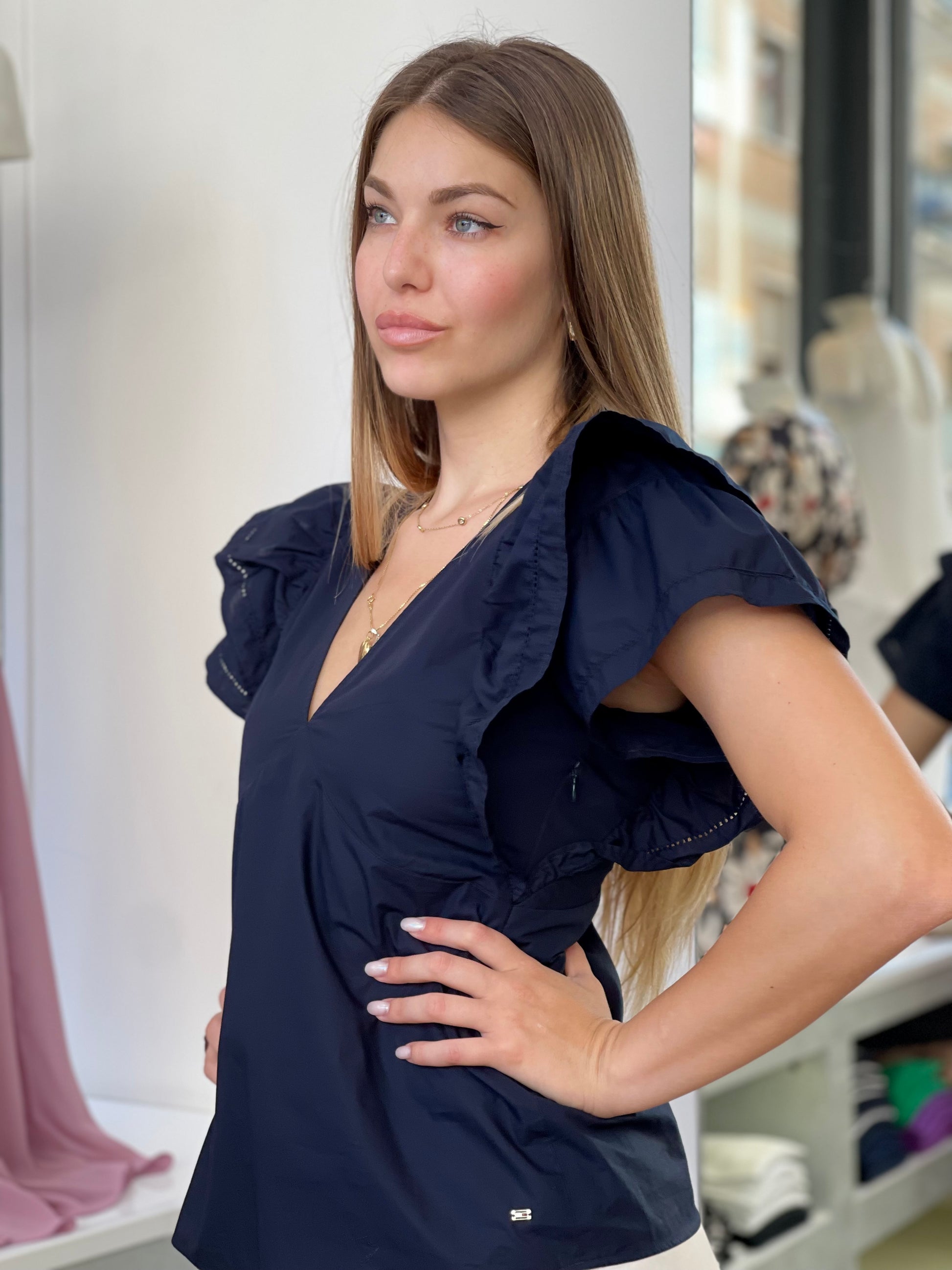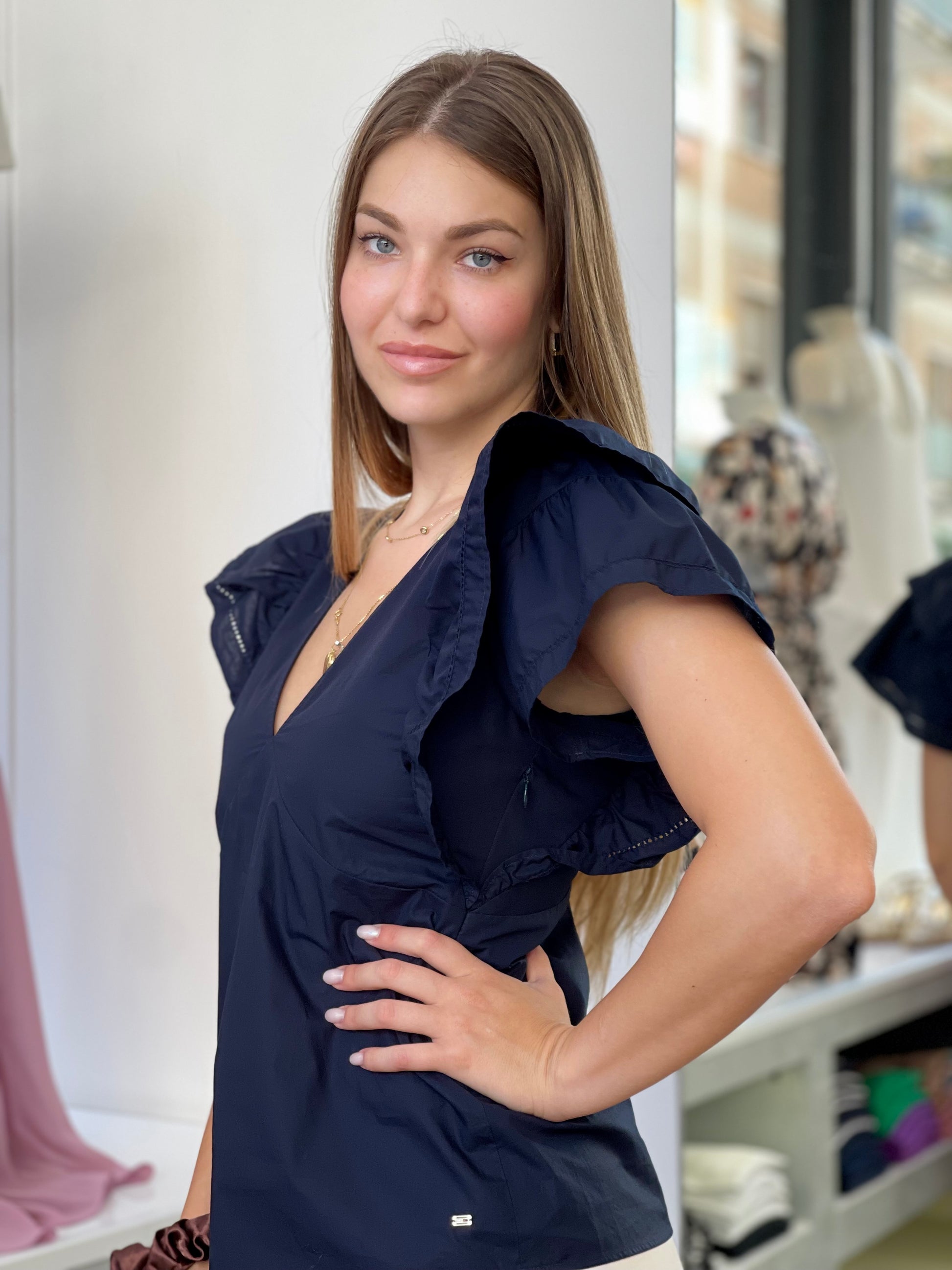 Maniche a balze con un design a doppio strato, che aggiunge movimento e un tocco romantico. La balza interna ha un orlo più aderente, mentre quella esterna è più ampia e ariosa.