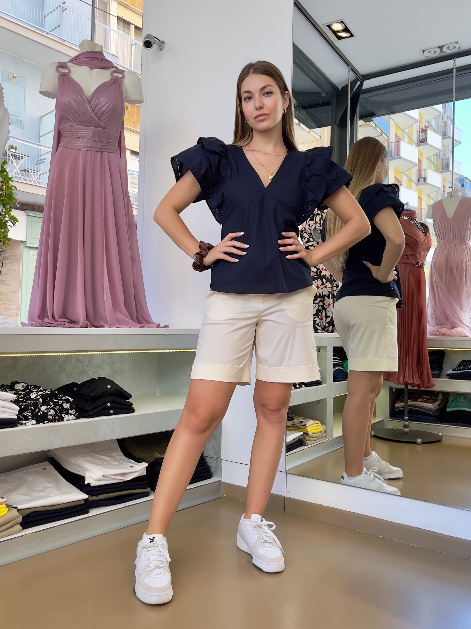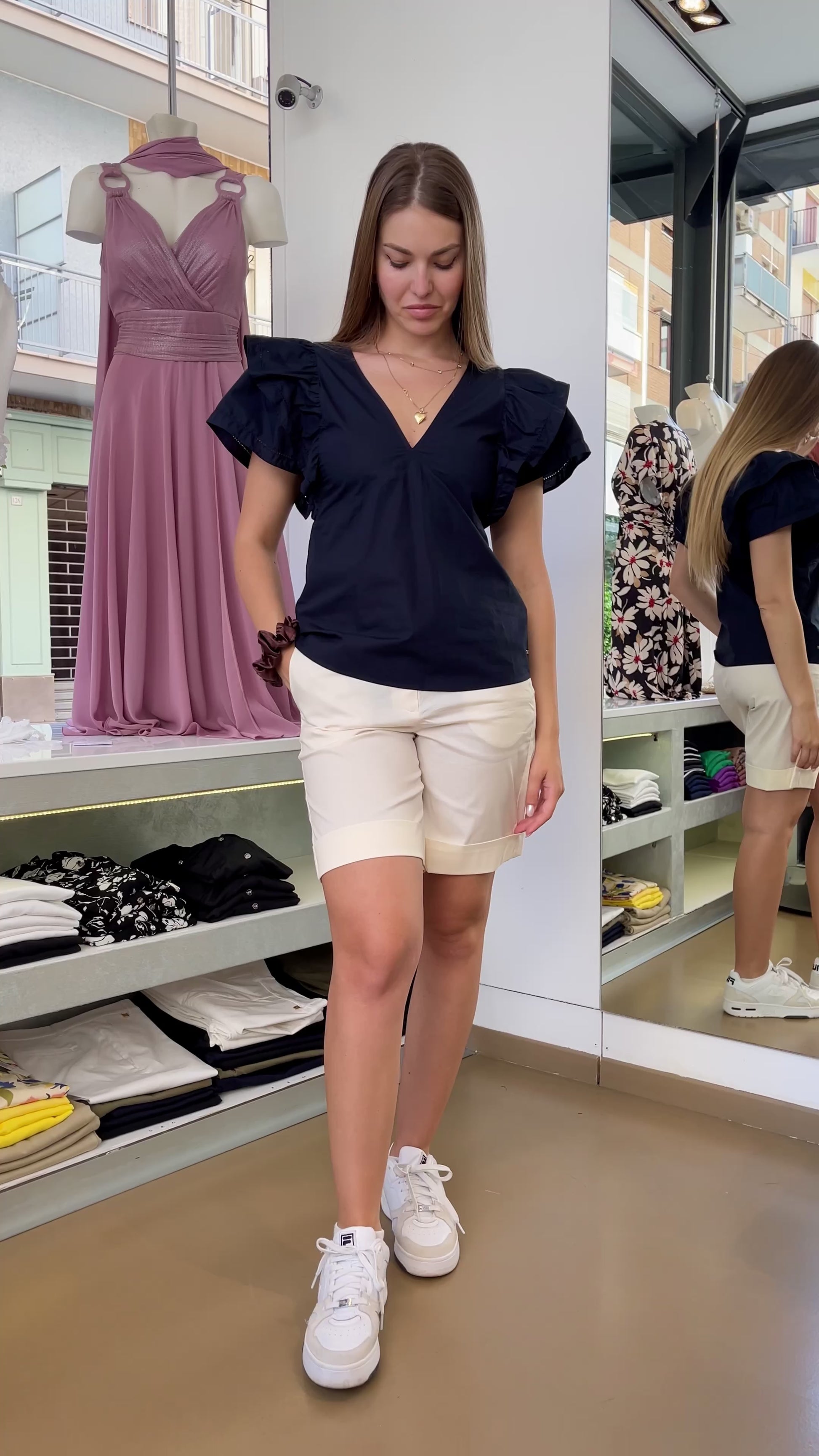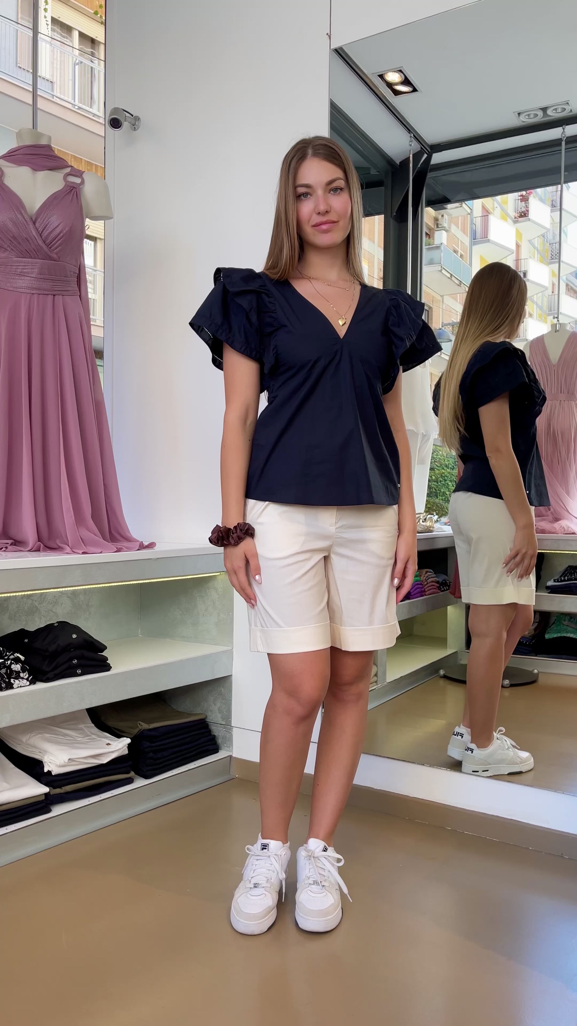 Versatile e facile da abbinare, questa camicia è perfetta per un look casual-chic con jeans, pantaloni eleganti o shorts, come quelli bianchi mostrati in foto.