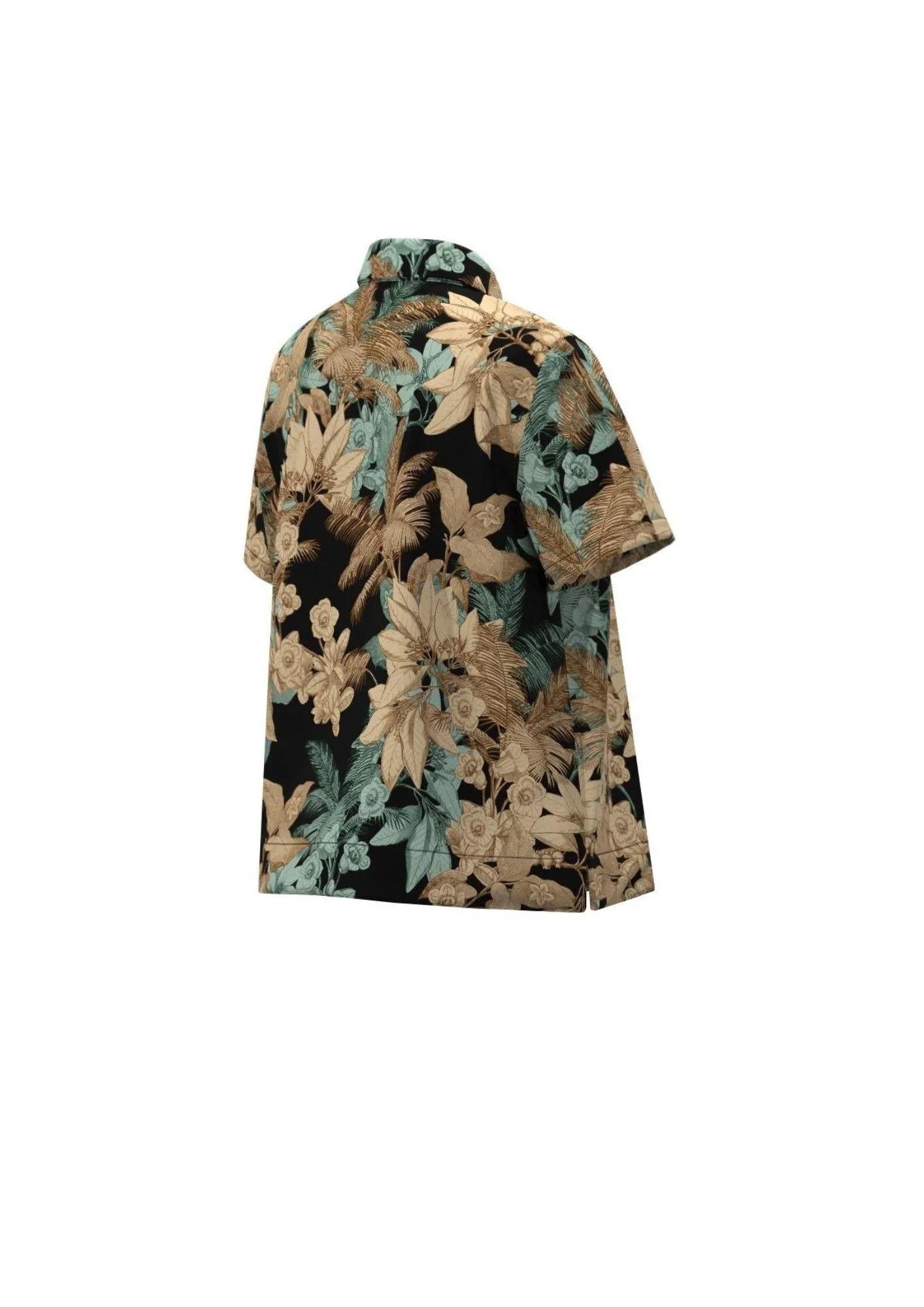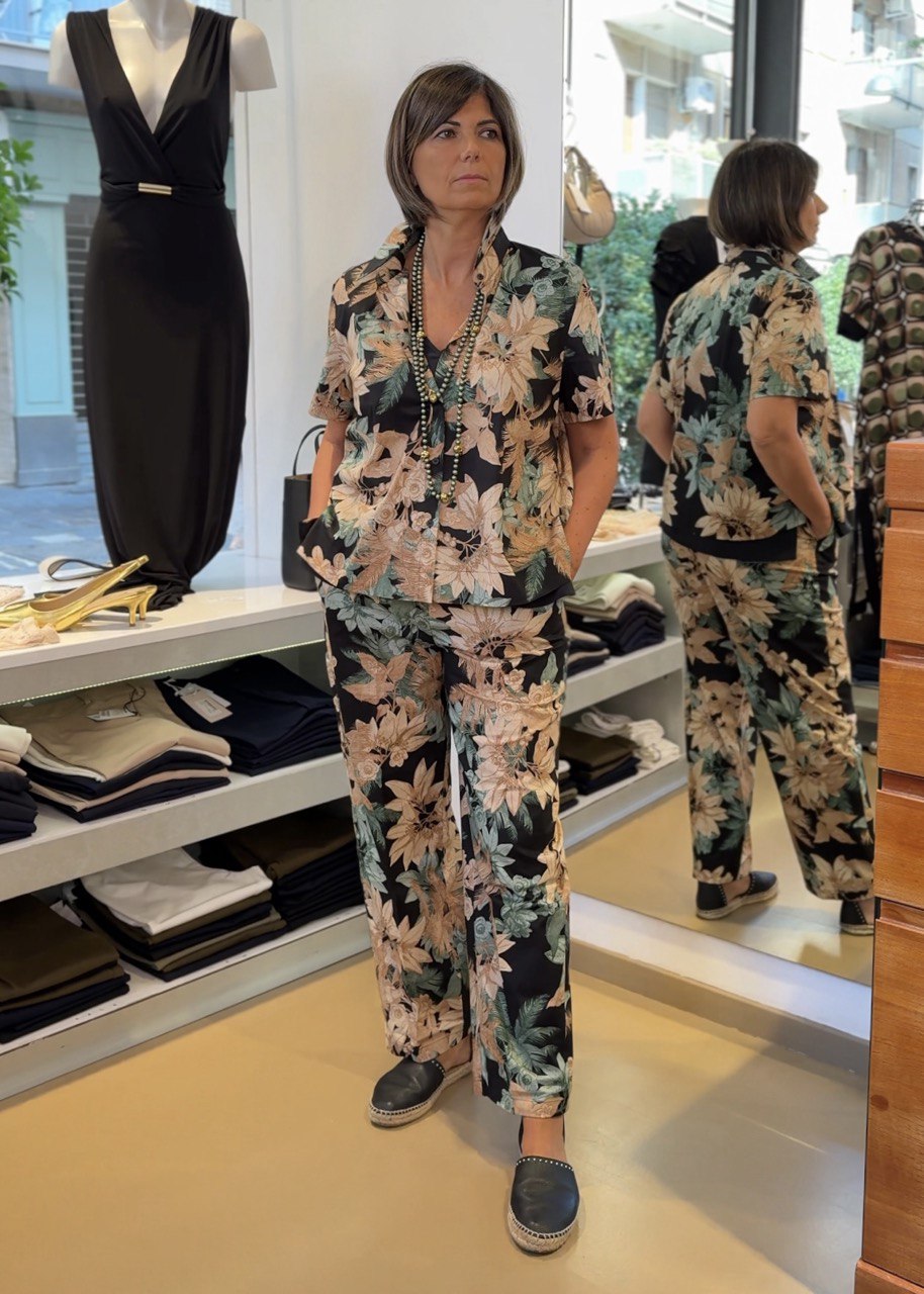 Stampa Floreale Tropicale: L'audace fantasia floreale, con tonalità di rosa cipria, verde acqua e beige su sfondo scuro, crea un look tropicale e alla moda, ideale per la stagione calda.