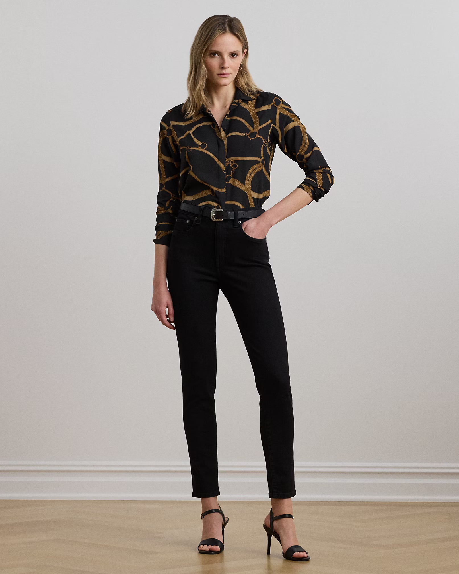 Realizzata in leggero crêpe de Chine, questa camicia si distingue per il fluido drappeggio che valorizza ogni movimento. La stampa a cinture equestri su fondo nero aggiunge un tocco di sofisticata eleganza, mentre i bottoni incisi esclusivi completano il design con dettagli raffinati, tipici del marchio Lauren Ralph Lauren. Perfetta per chi cerca un capo dallo stile ricercato e una vestibilità impeccabile. Composizione 100% poliestere. Lavabile in acqua o a secco.