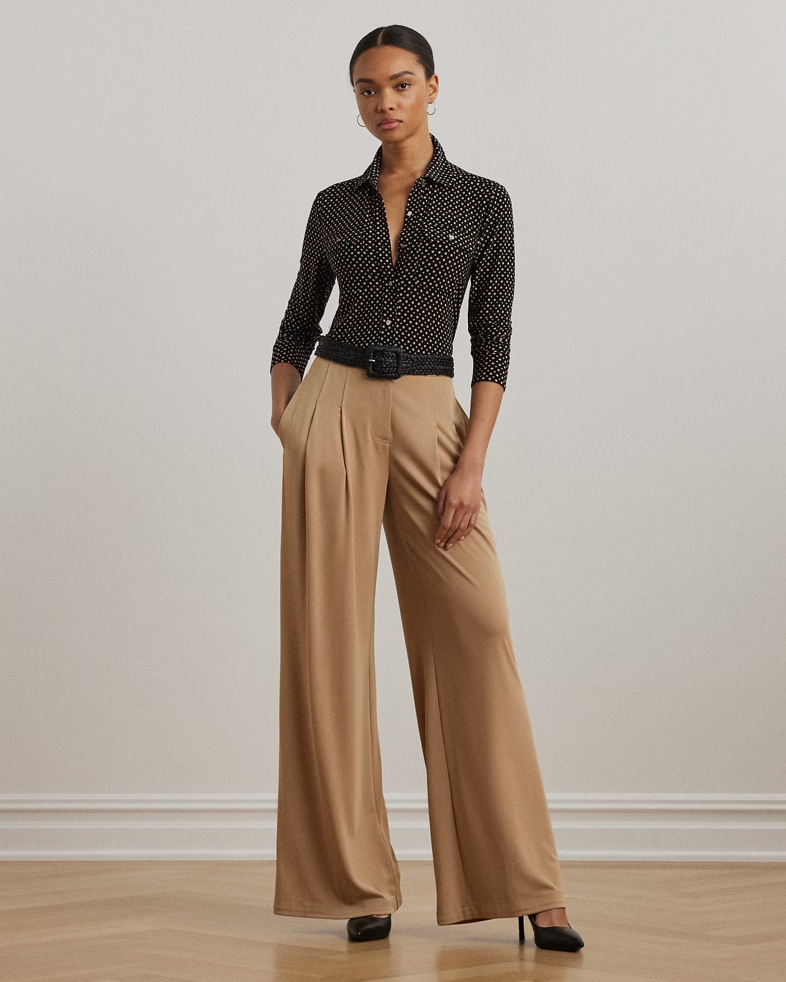 Realizzata in jersey leggermente stretch, questa camicia combina comfort e vestibilità aderente per una silhouette raffinata. La stampa geometrica bicolore nero e cammello valorizza il capo con un tocco moderno ed elegante. Presenta collo ampio, cannoncino con bottoni metallici esclusivi con logo "LRL" su chiusura e taschine, maniche lunghe con polsini rifiniti da bottoni con logo "Lauren Ralph Lauren". Le due tasche a patta aggiungono funzionalità senza rinunciare allo stile, mentre il taglio dritto e la lunghezza ai fianchi assicurano una vestibilità confortevole e attuale.