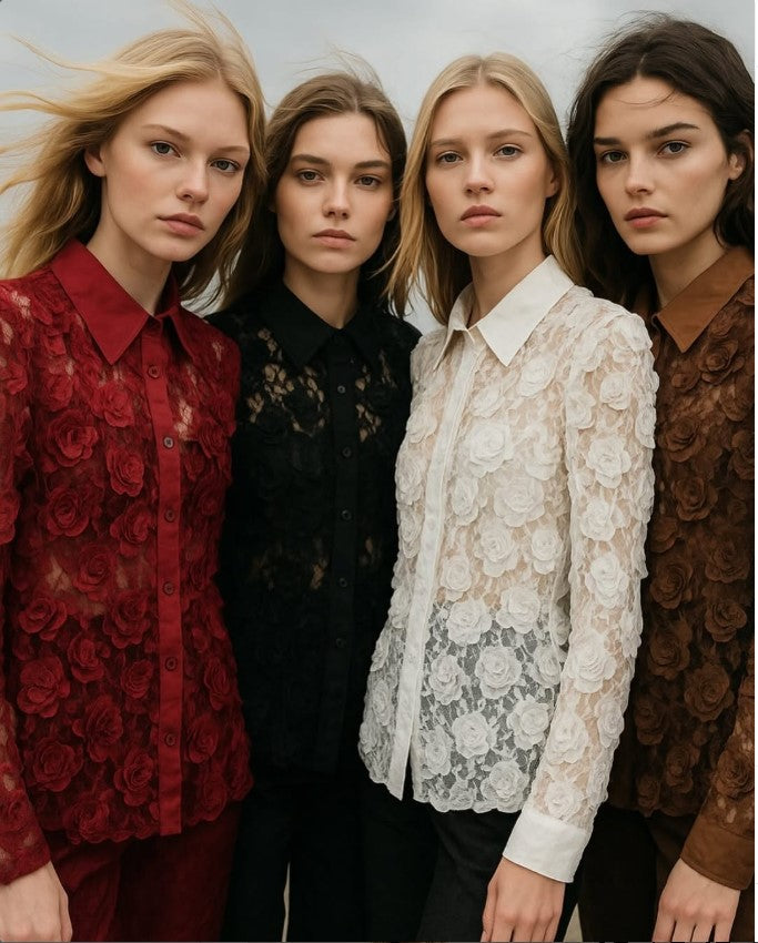 Camicia in Pizzo Floreale Elasticizzato - Rosso Bordeaux, Nero, Bianco, Marrone