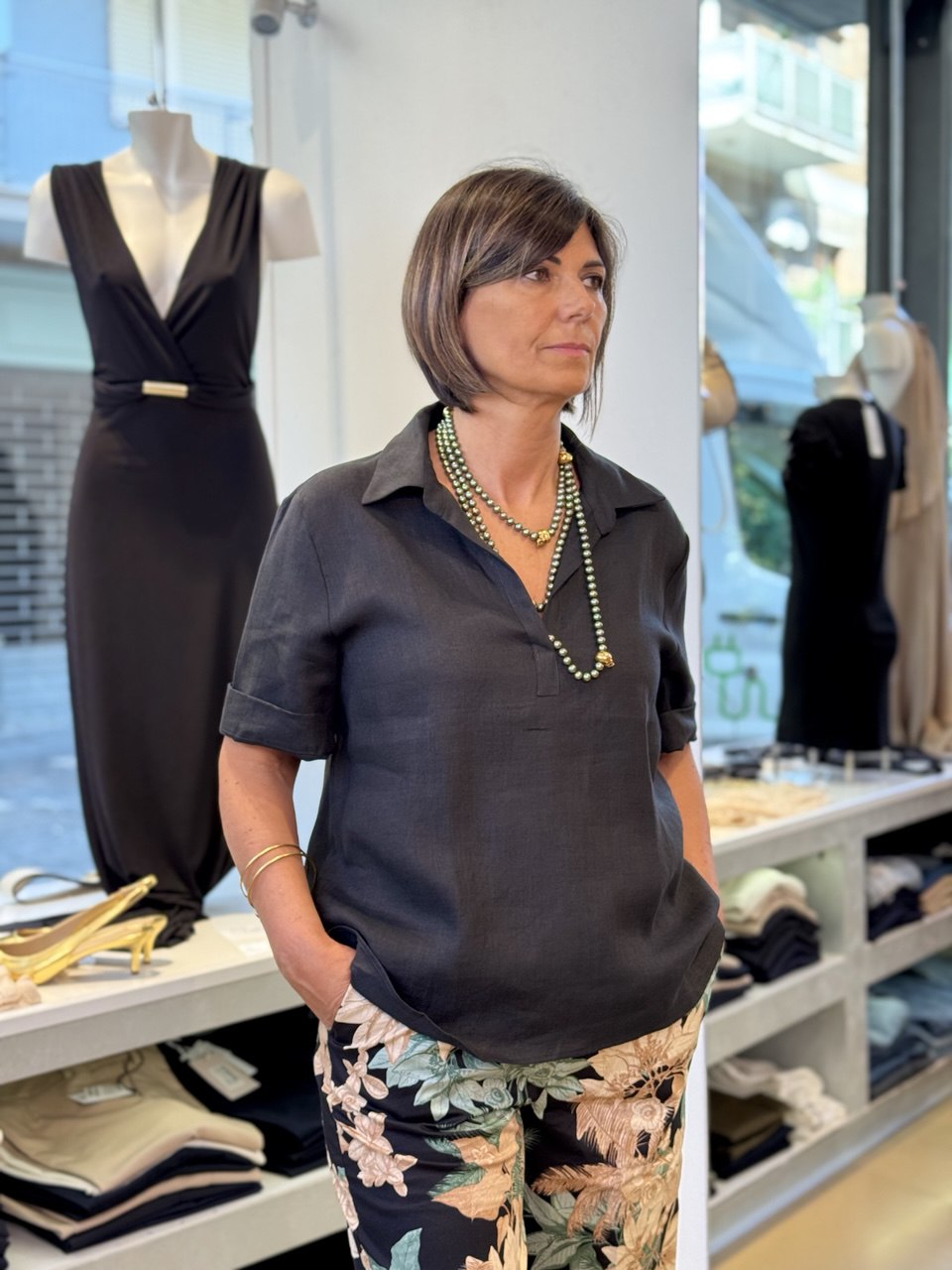 Scopri la nostra camicia da donna a sacchetto, un capo essenziale che unisce l'eleganza senza tempo del lino alla praticità di una vestibilità rilassata. Realizzata al 100% in puro lino, questa camicia è la scelta perfetta per chi cerca un look sofisticato ma al contempo casual e confortevole.