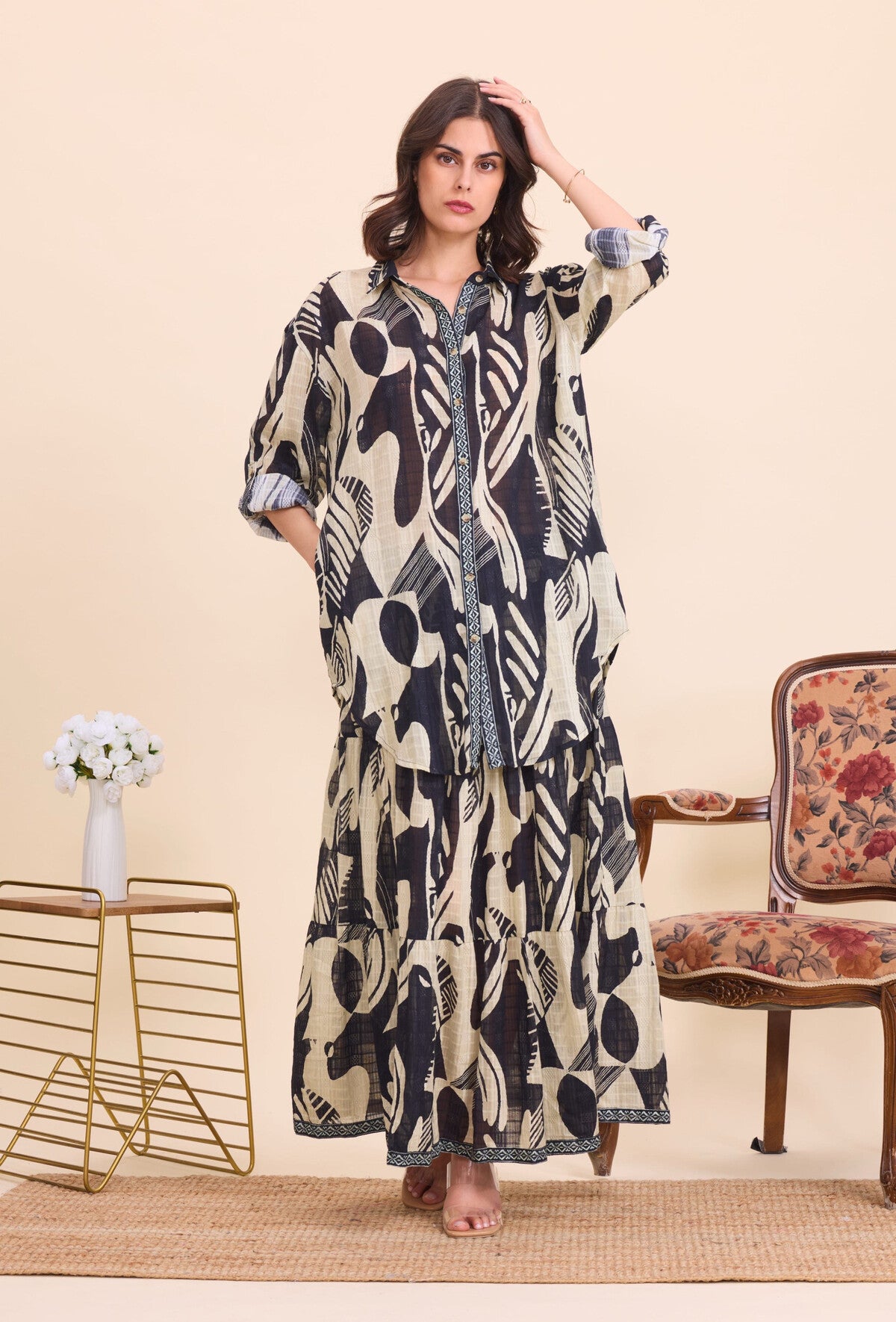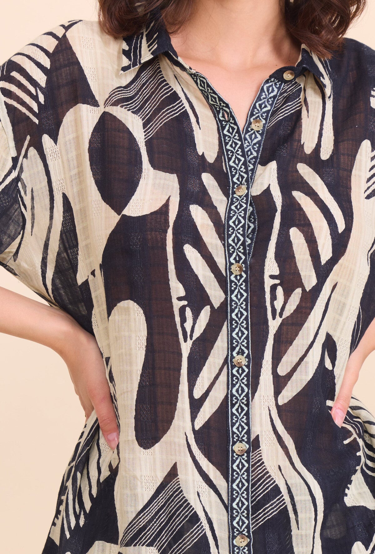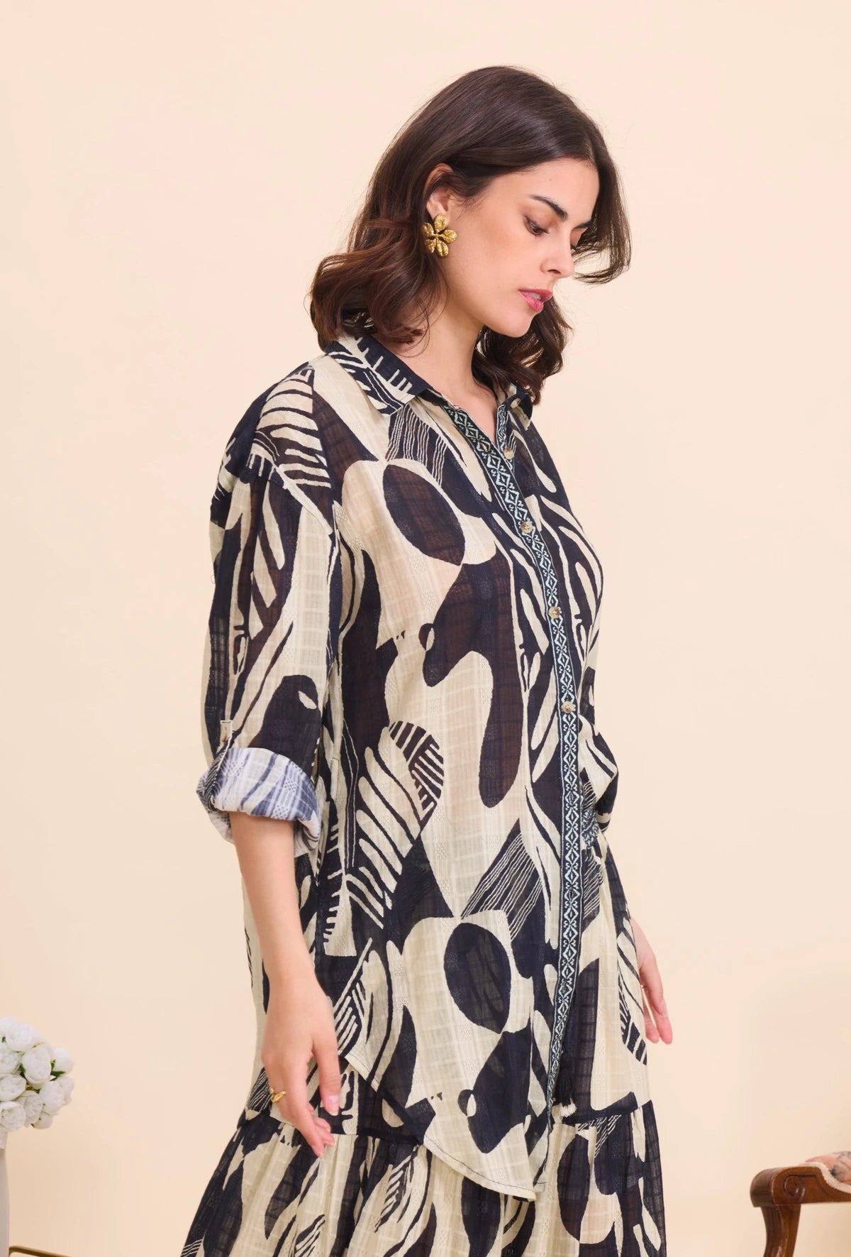 Questa camicia lunga in cotone stampato unisce eleganza e comfort con il suo taglio ampio e asimmetrico, perfetto per uno stile bohémien raffinato. Realizzata in cotone 100%, garantisce traspirabilità e morbidezza sulla pelle. Il colletto classico e le maniche lunghe completano un design versatile, adatto a diverse occasioni. Disponibile in taglia unica, veste comodamente le taglie europee dal 36 al 46.