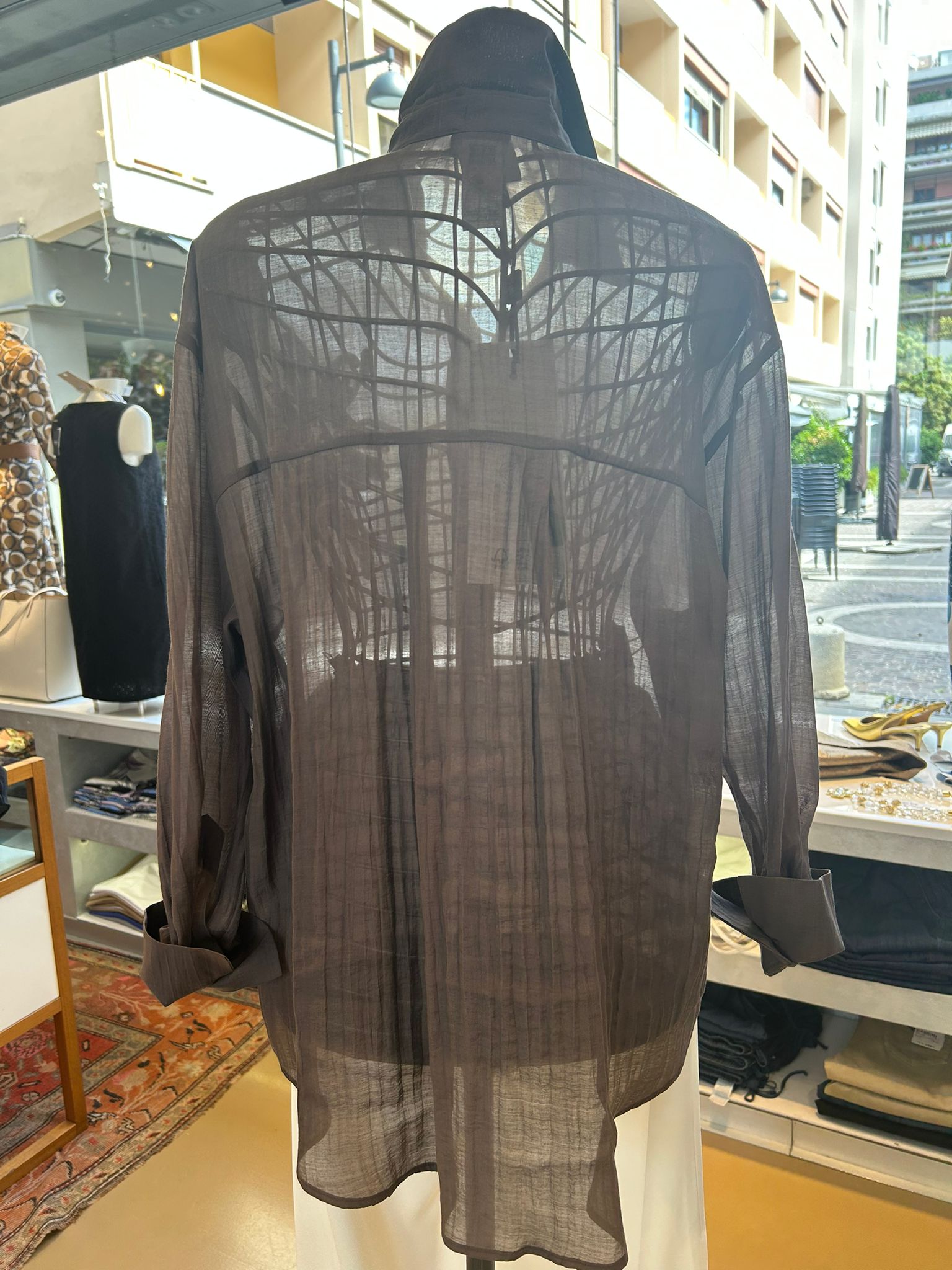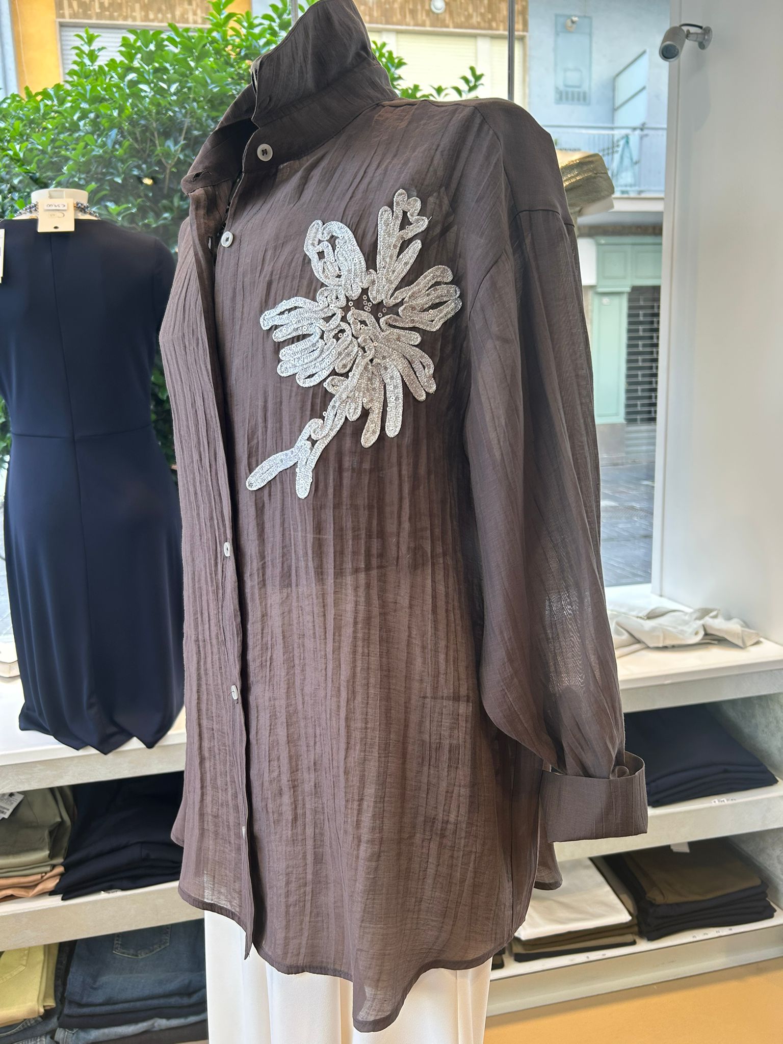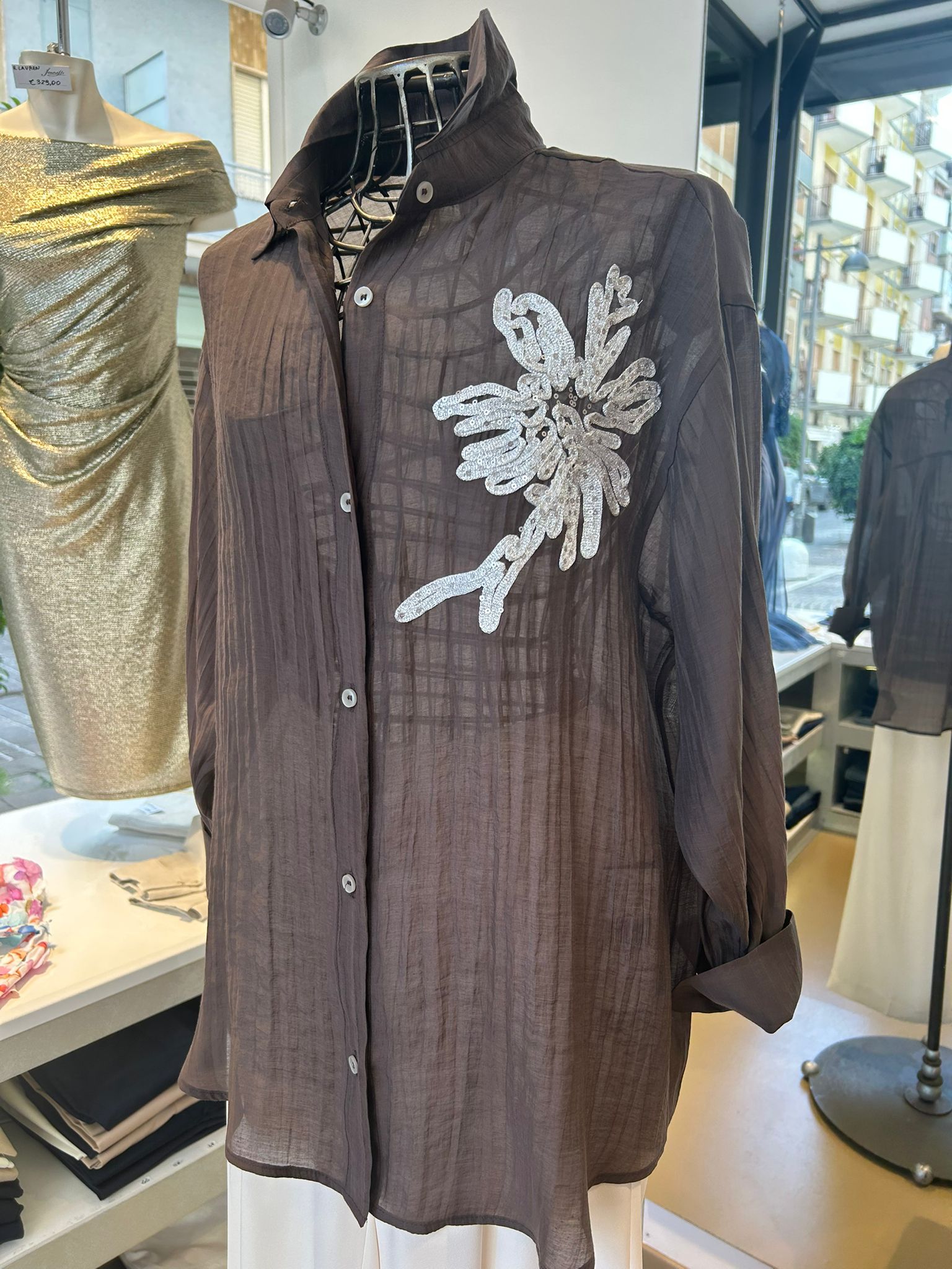 Esalta la tua femminilità con questa raffinata camicia marrone in voile, impreziosita da un delicato ricamo sul davanti che conferisce un'eleganza senza tempo. Il pregiato tessuto in tencel e poliestere avvolge la silhouette con leggerezza e traspirabilità, garantendo comfort assoluto. Versatile per ogni occasione, si trasforma con naturalezza dal look diurno a quello serale. Composizione: 76% tencel, 24% poliestere. Lavabile in acqua.