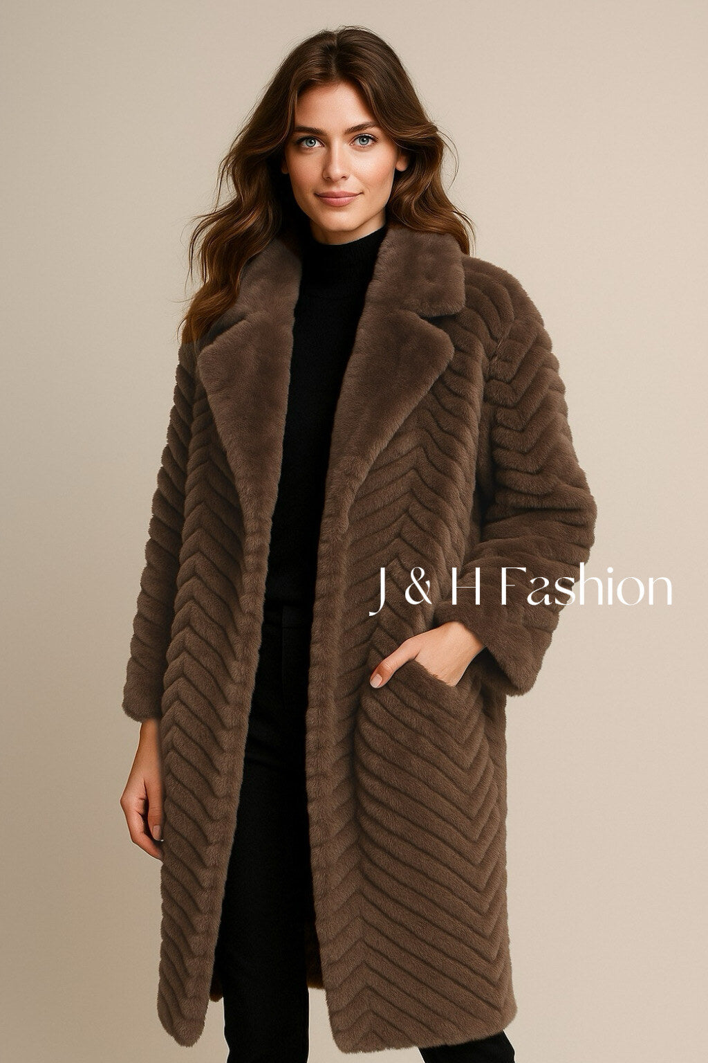 Questo cappotto lungo in pelliccia finta con lavorazione striata unisce calore e raffinatezza per affrontare l'inverno con eleganza. Il collo con revers strutturati crea una silhouette definita, mentre la cintura in vita assicura una vestibilità femminile e aderente. Le tasche laterali discrete offrono praticità senza rinunciare allo stile. La finitura interna in camoscio garantisce comfort e una sensazione di lusso, rendendo questo capo un must per chi cerca morbidezza e stile durante i mesi freddi. Veste da una 38 ad un 46 abbondante. Composizione: 100% poliestere.