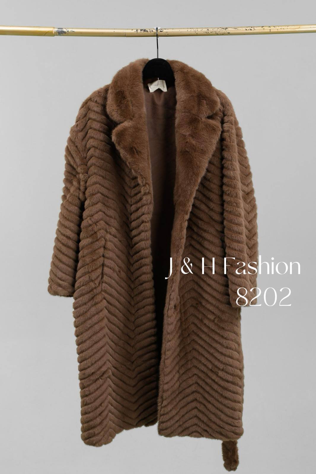 Cappotto in pelliccia finta con lavorazione striata, cintura e finitura interna in camoscio