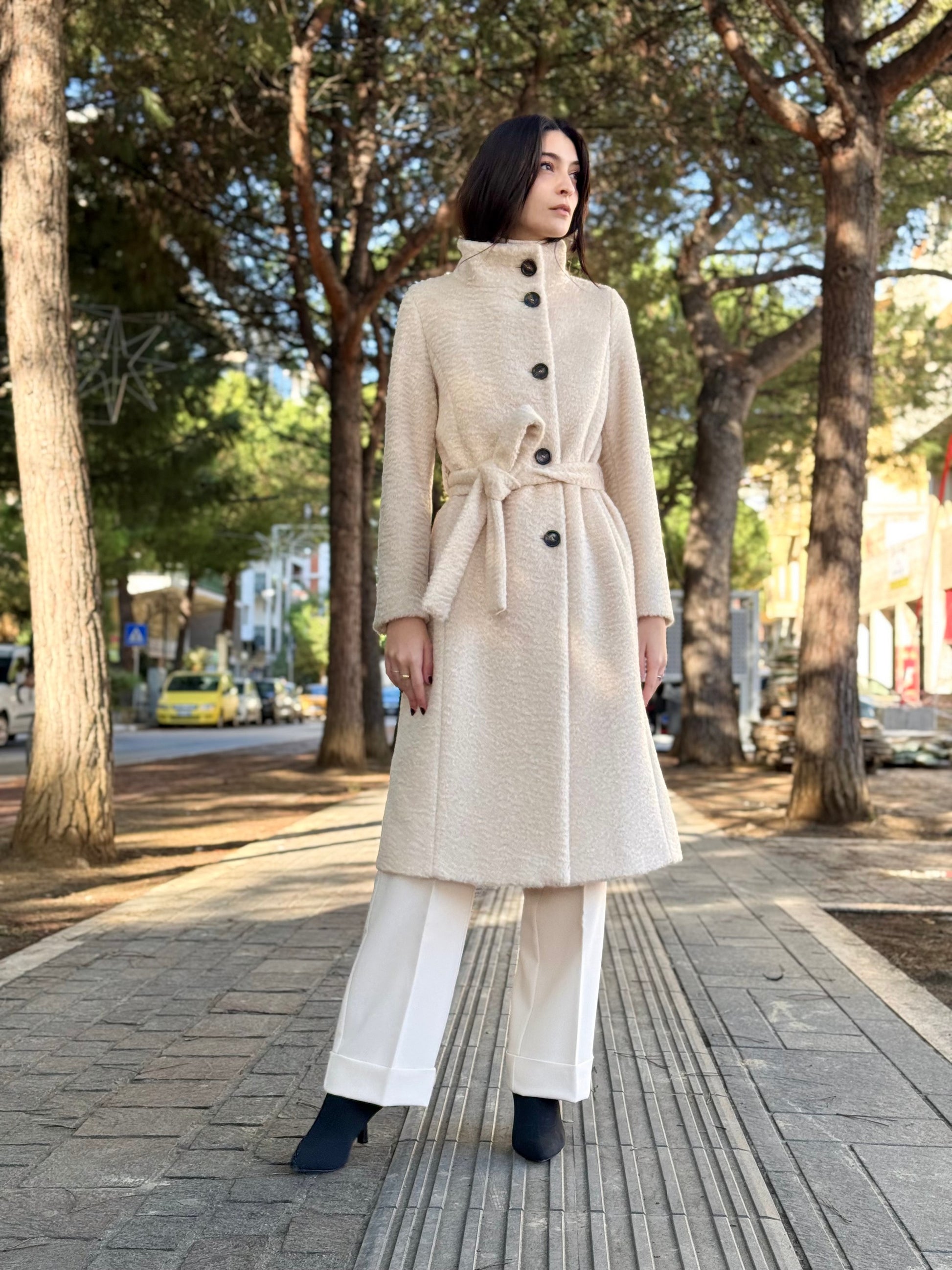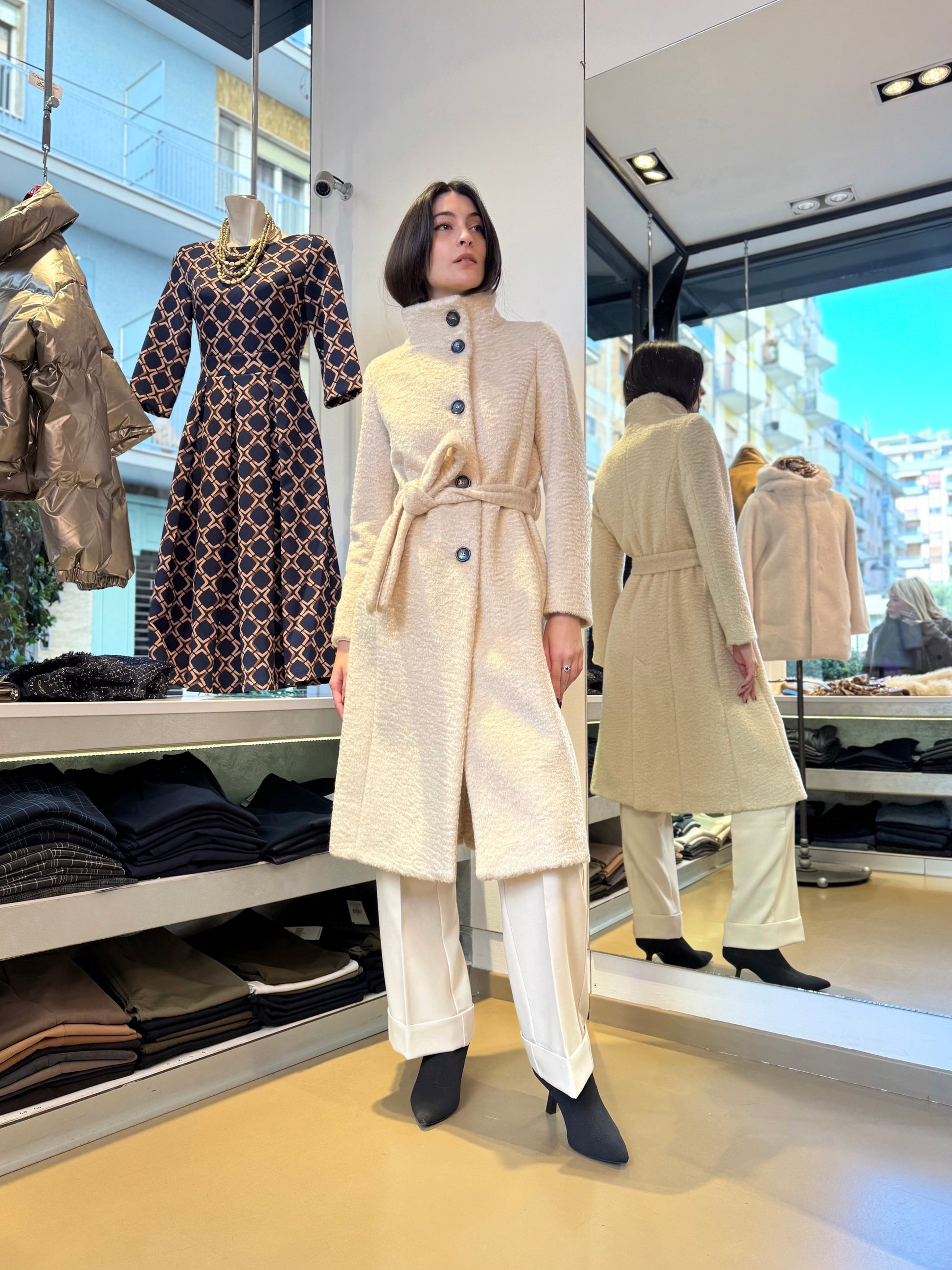 Eleganza e comfort si incontrano in questo cappotto di Federica Garoni, realizzato con un pregiato tessuto effetto astrakan. La linea avvolgente con cintura in vita valorizza la silhouette, mentre il collo alto e i bottoni frontali aggiungono un tocco sofisticato. Perfetto per affrontare le giornate invernali con stile, si abbina facilmente sia a look formali che casual.
