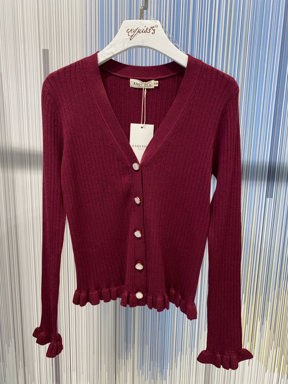 Cardigan a cannetta con rouche - Beige, Bordeaux, Nero