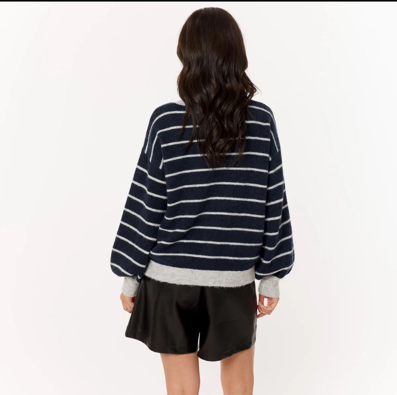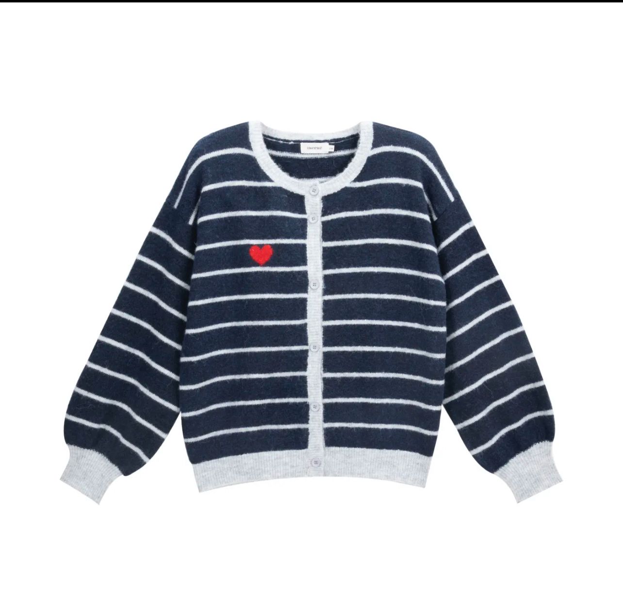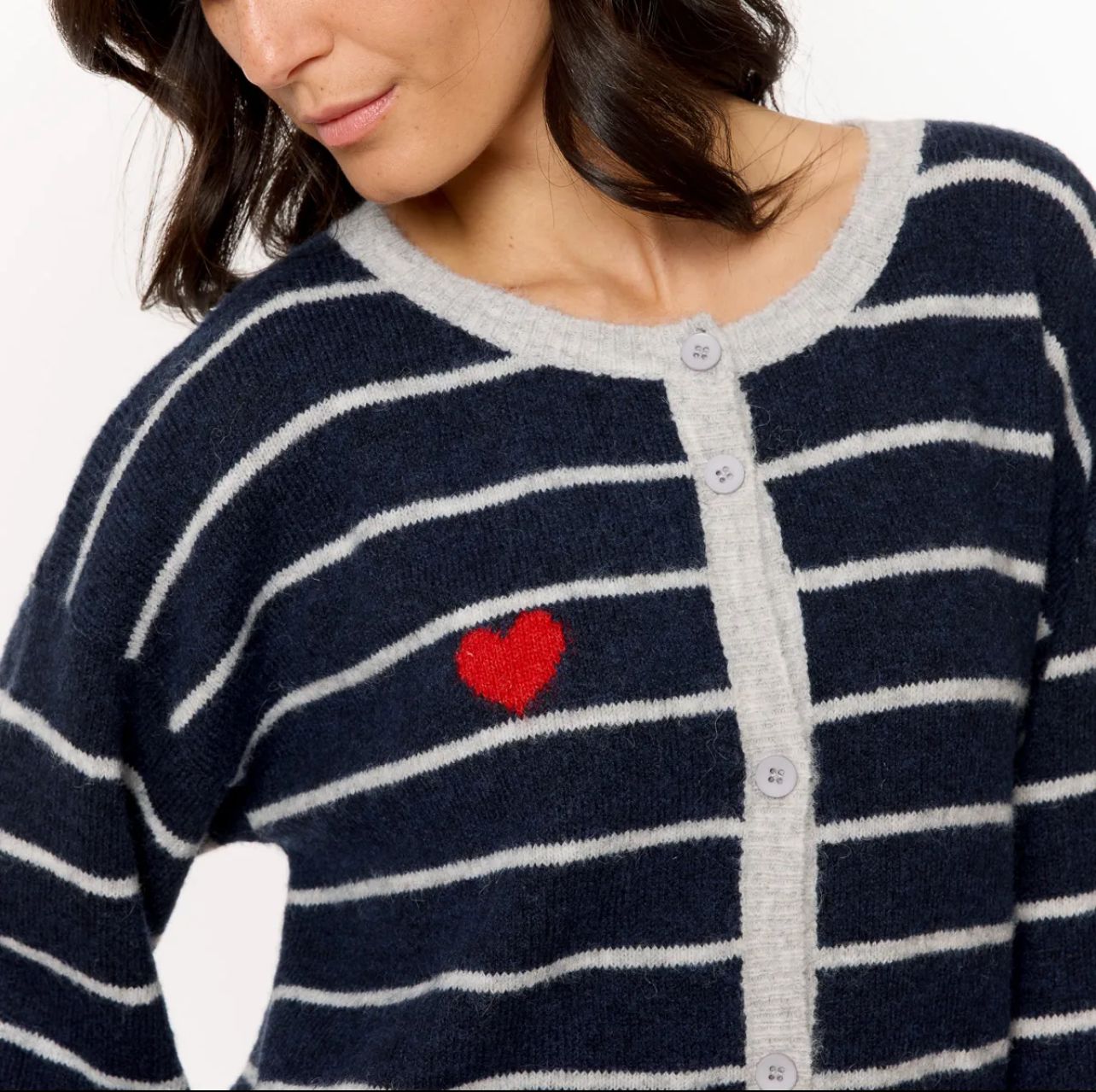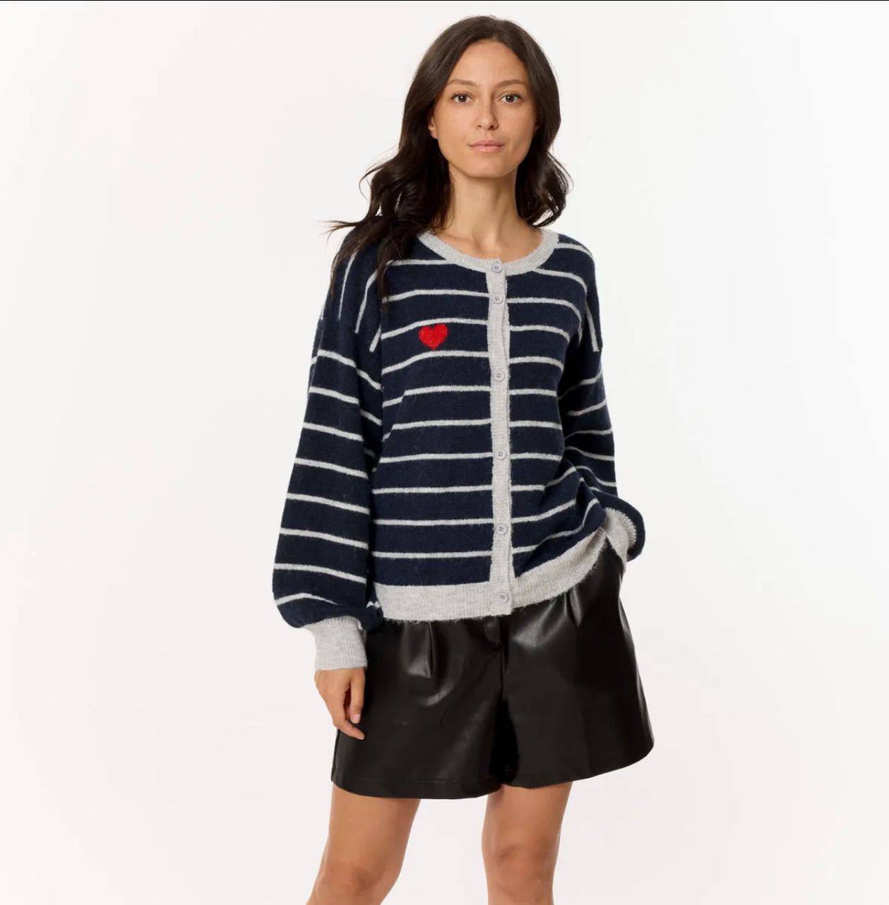 Cardigan girocollo oversize del brand Sweewe Paris, in una sofisticata combinazione di blu e righe grigie. Un dettaglio unico è il piccolo cuoricino rosso sul davanti, che aggiunge un tocco romantico e distintivo al design. La vestibilità ampia garantisce comfort, mentre il tessuto morbido e caldo lo rende perfetto per le giornate più fresche.